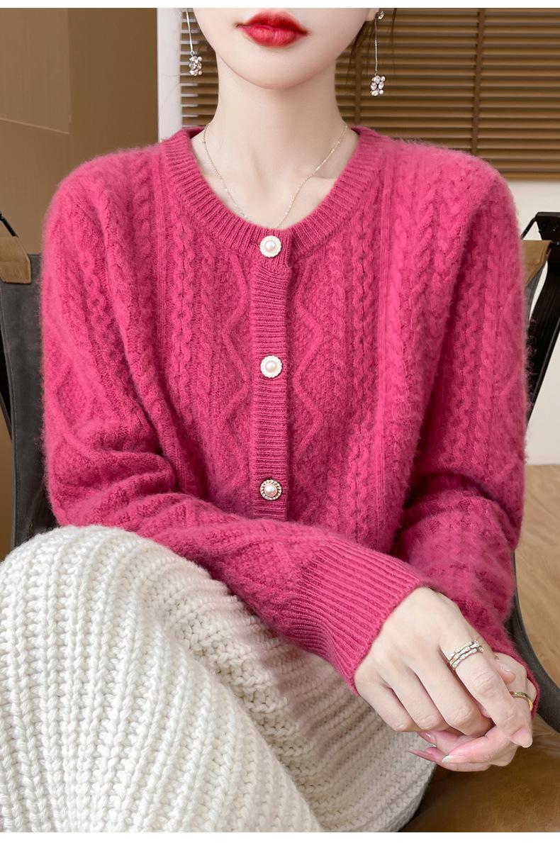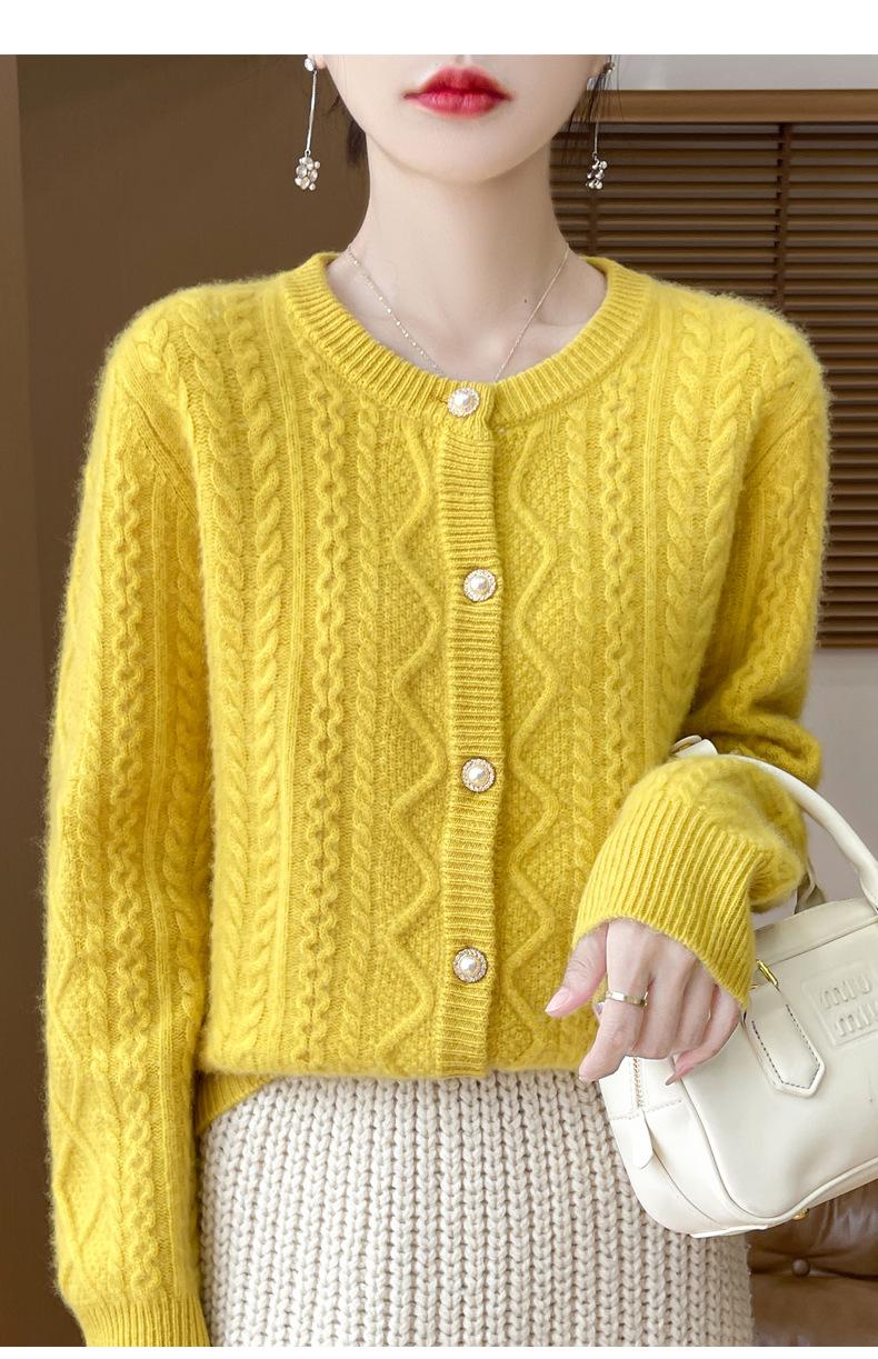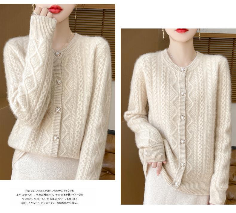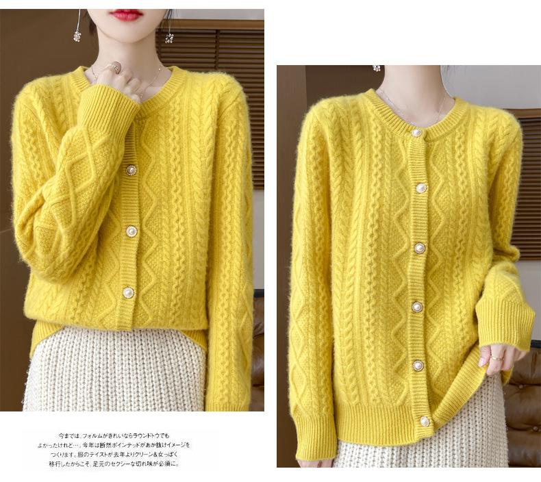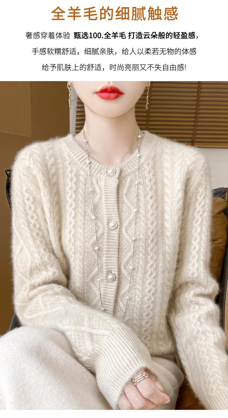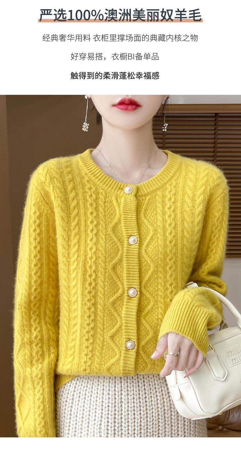 Cárdigan de punto de lana pura para mujer, cuello redondo, hebilla de perla, color liso, manga larga, abrigo grueso para ir al trabajo, novedad de 2024
