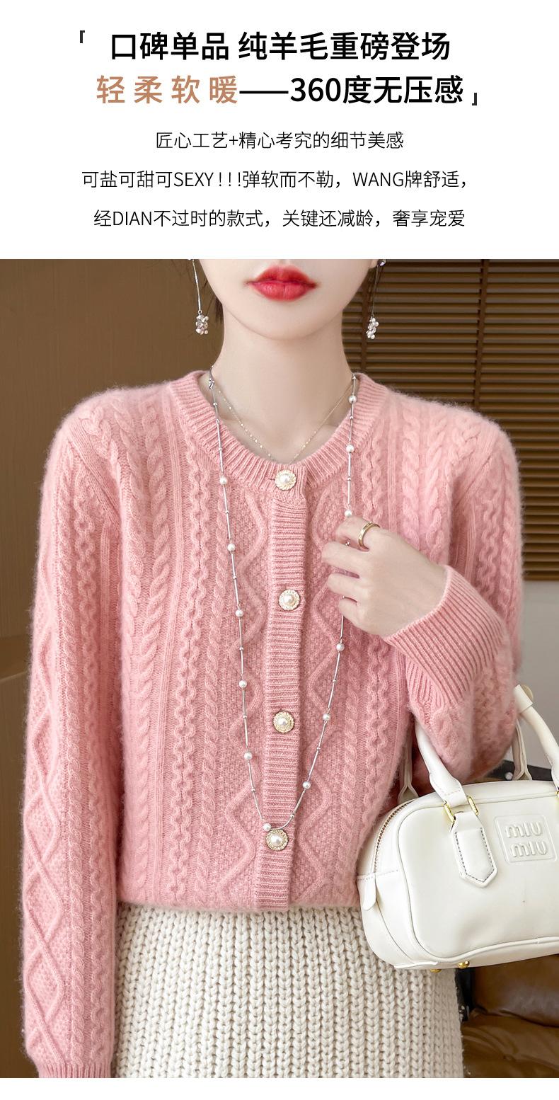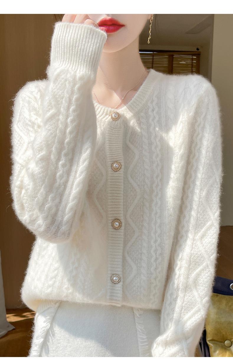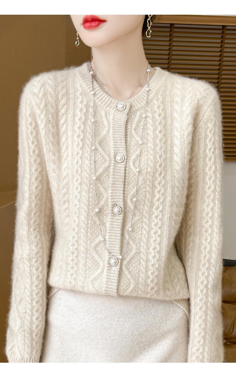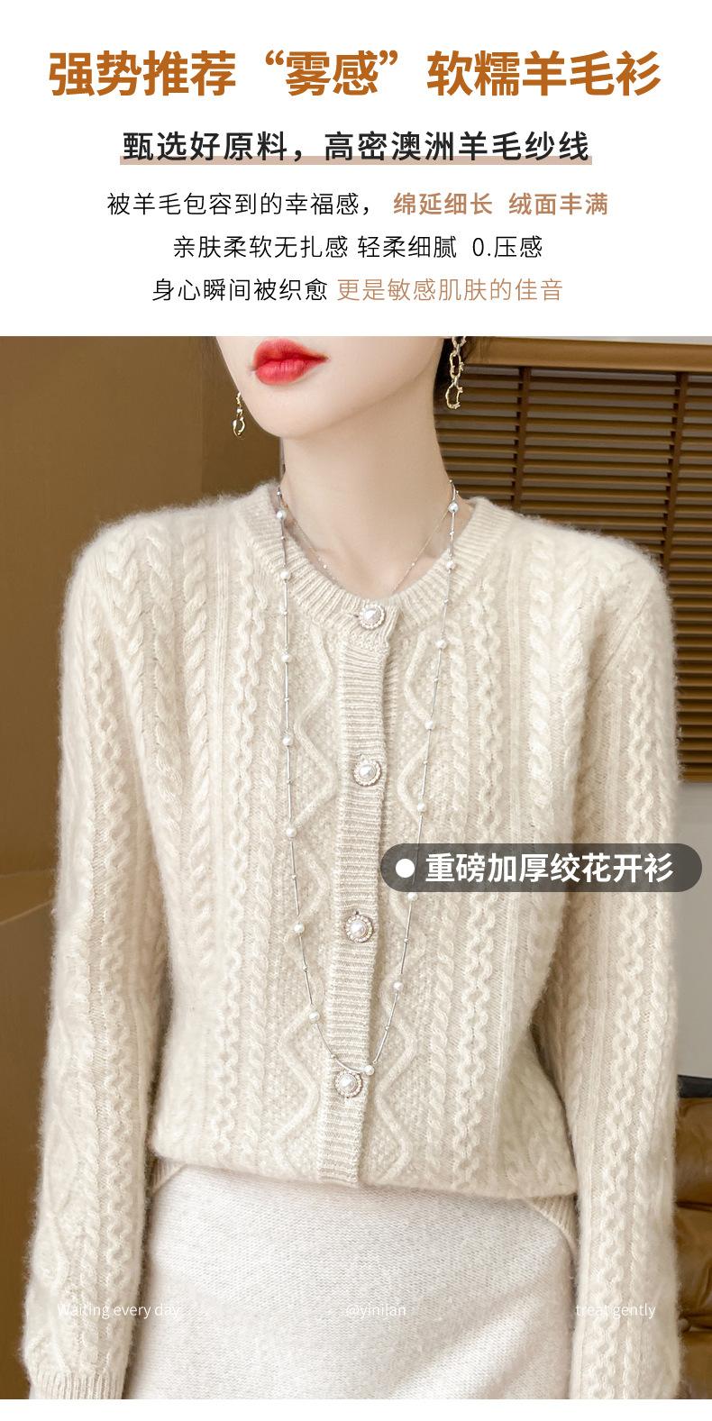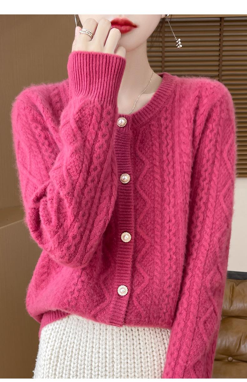 Cárdigan de punto de lana pura para mujer, cuello redondo, hebilla de perla, color liso, manga larga, abrigo grueso para ir al trabajo, novedad de 2024