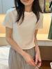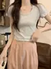 Camiseta de manga corta con cuello redondo para mujer, novedad de verano 2023, con hombros descubiertos, cintura ajustada, adelgazante, color liso, sencilla, combinable.