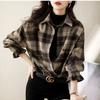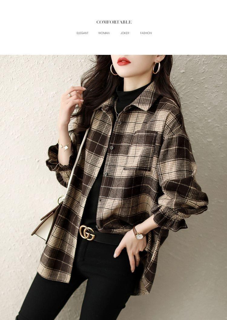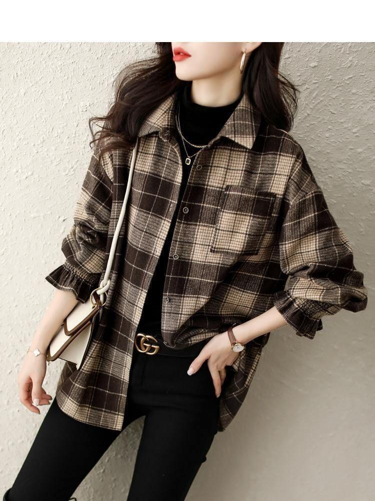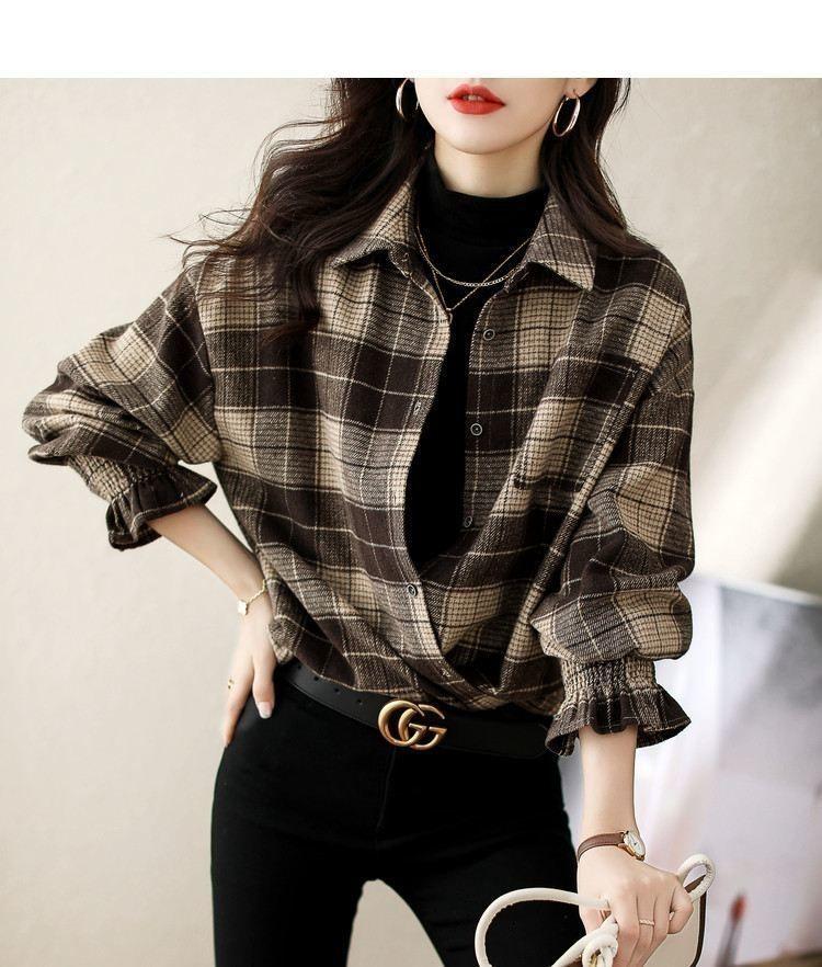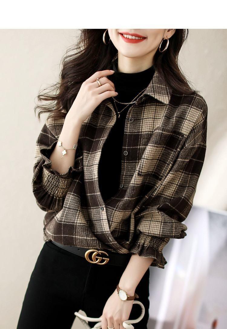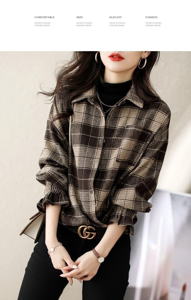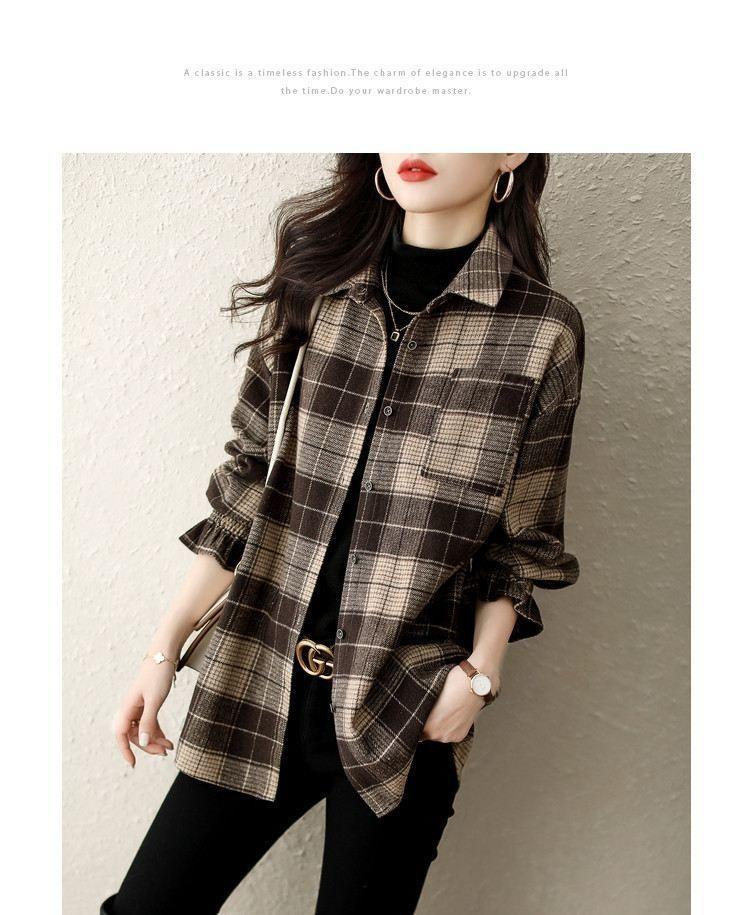 Chaqueta estilo camisa para mujer con mangas de encaje, estilo retro, elegante, a cuadros, informal, con costuras de moda, para primavera y otoño.