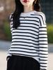 Otoño e Invierno Nuevo Algodón Rayado Manga Larga Tejido Camiseta Base para Mujer Cuello Redondo Jersey Suelto Casual Grueso Top