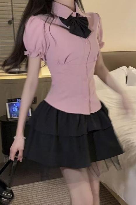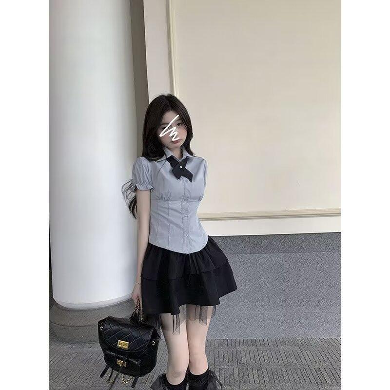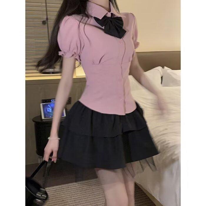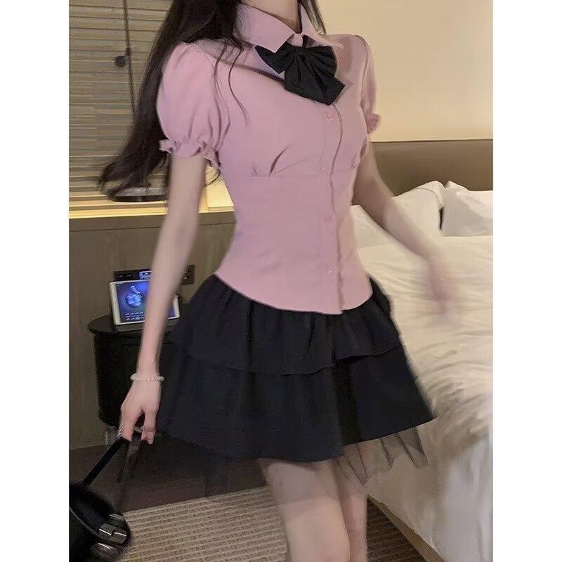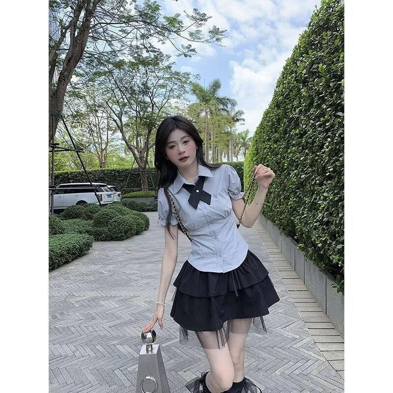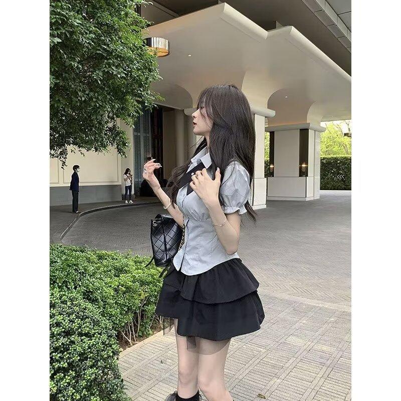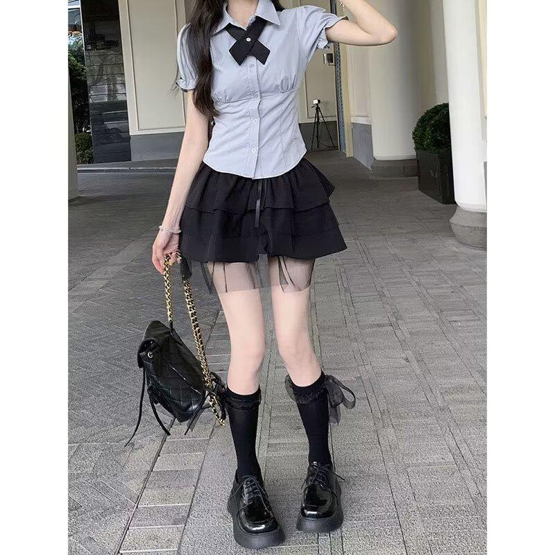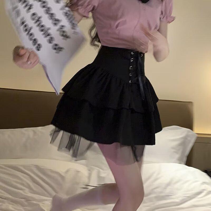 Falda negra de verano 2024, nuevo estilo, elegante, adelgazante, de cintura alta, línea A, falda corta abullonada, falda pequeña para mujer