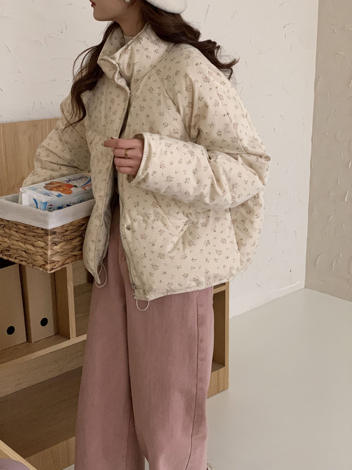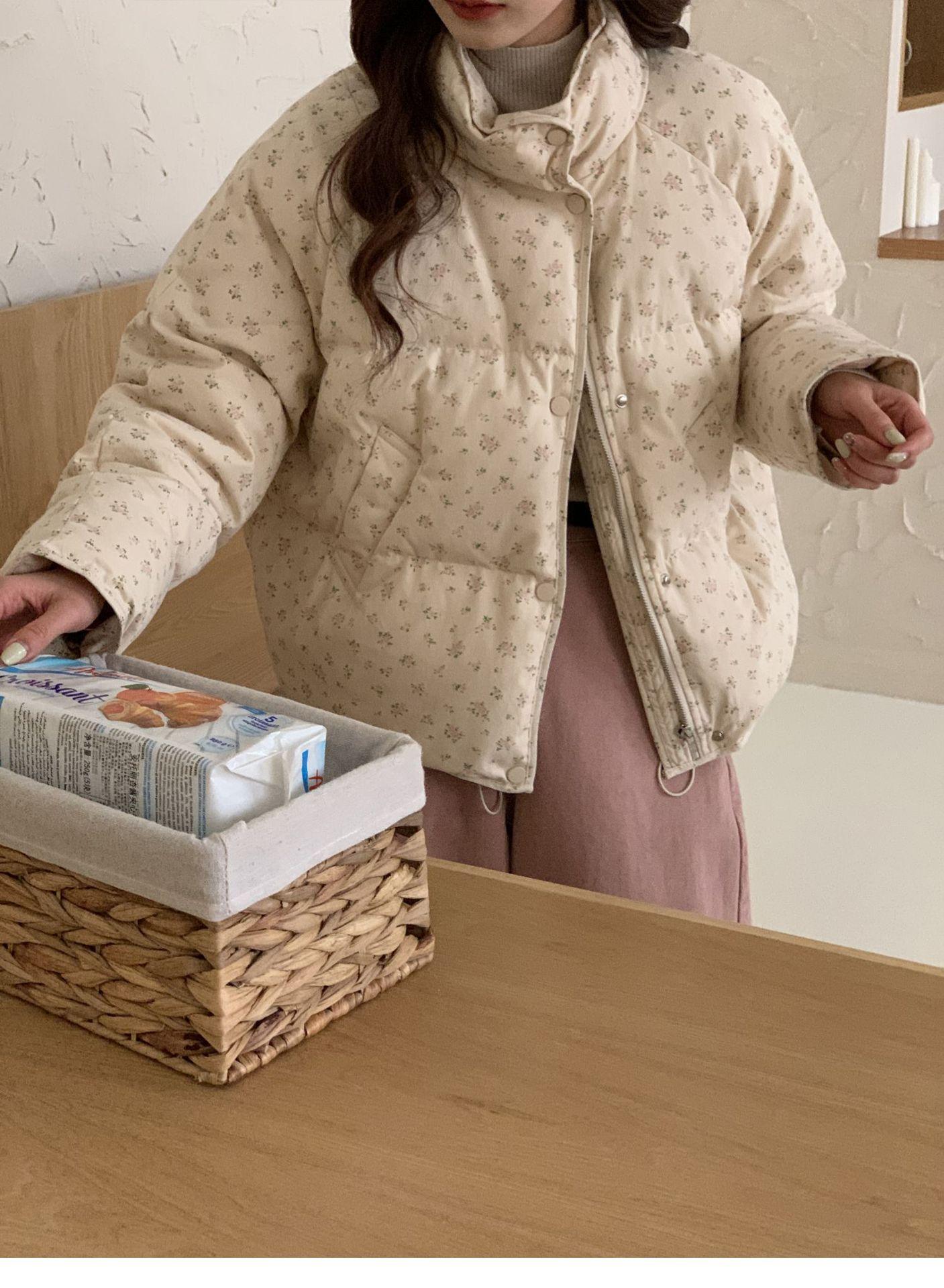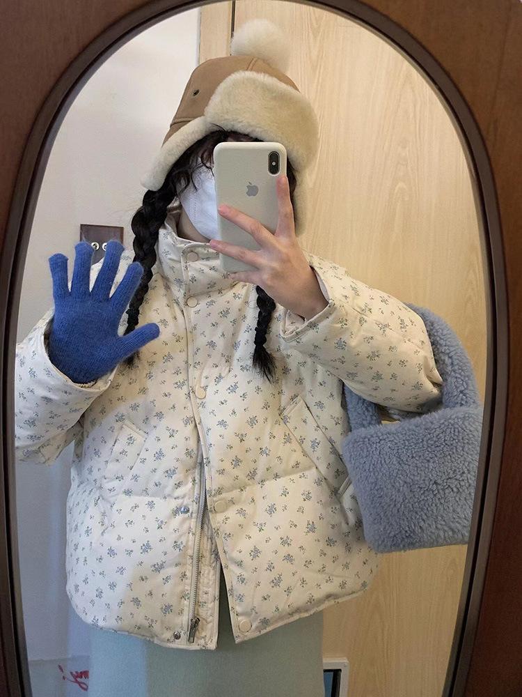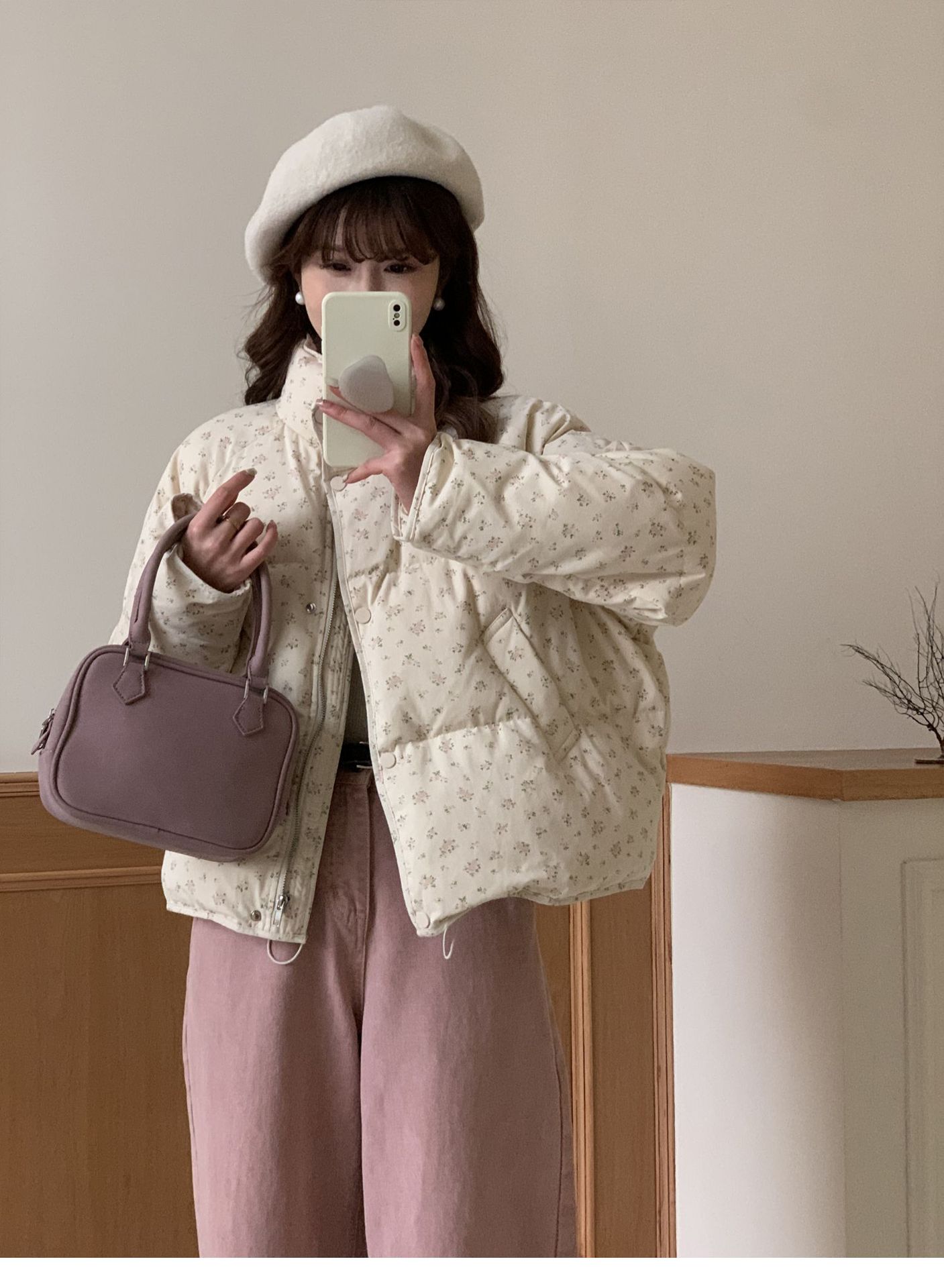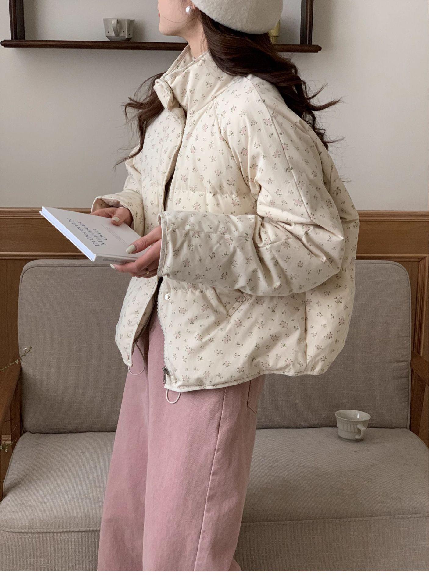 Chamarra de plumón floral para mujer, estilo corto, invierno 2025, estilo pastoral coreano, talla petite, chamarra acolchada de plumón de pato blanco, moderna