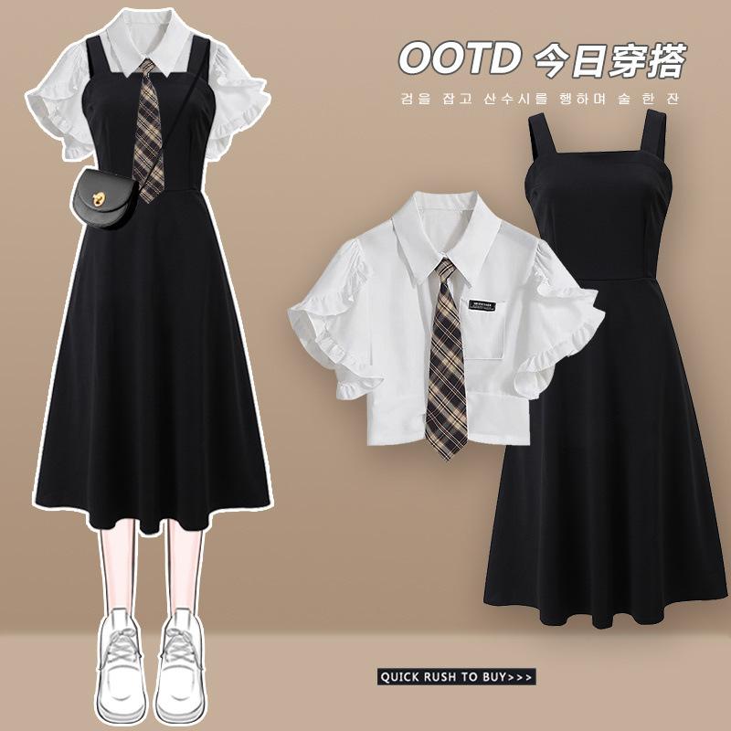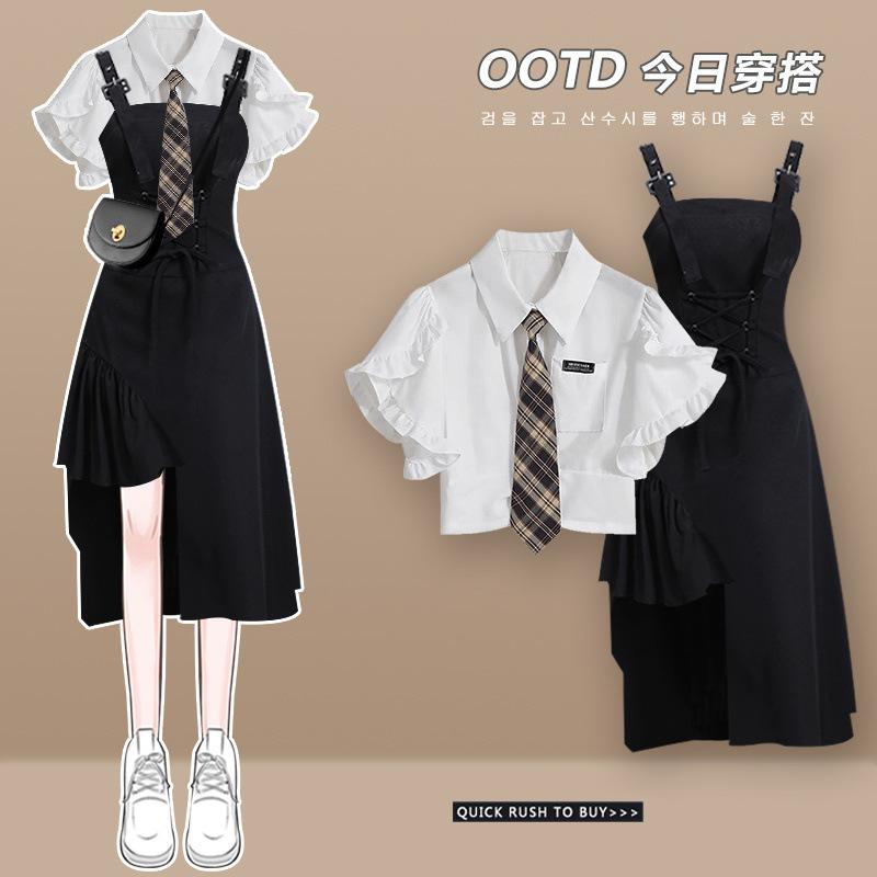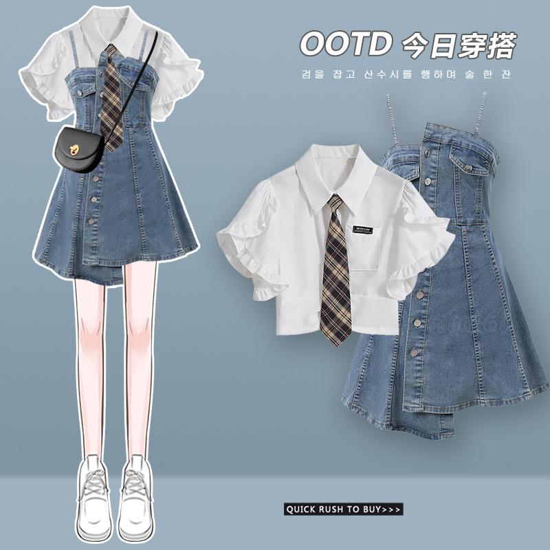 White shirt black strap skirt two-piece set, White Shirt Black Skirt Two-Piece Slip, White shirt Denim skirt t...