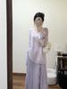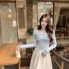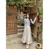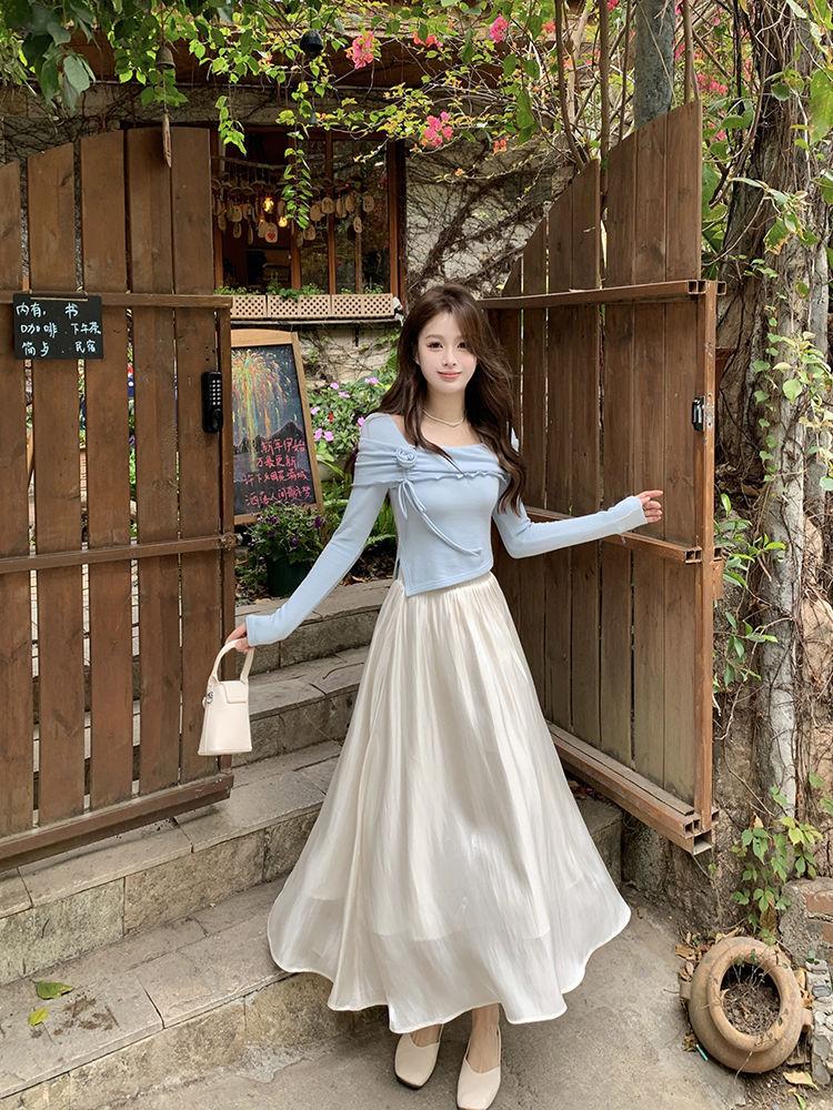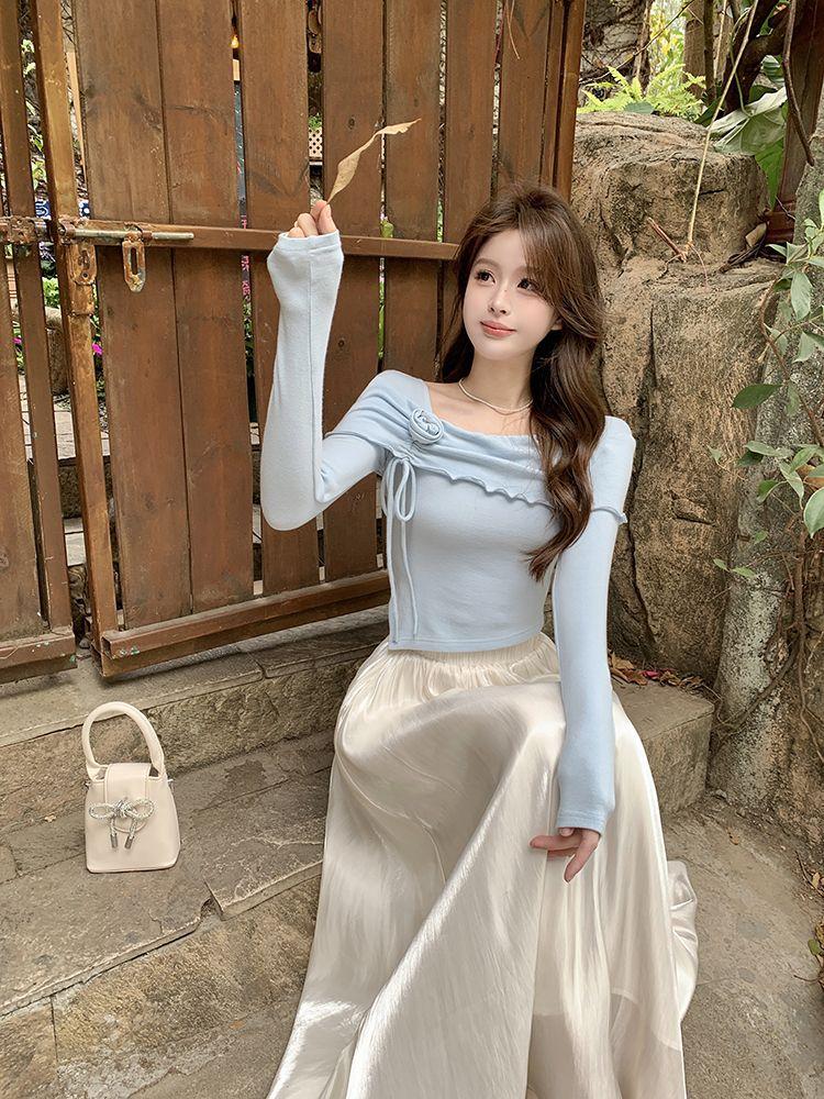 Traje de Estilo Suave para Mujer, Primavera Elegante, Flor Estéreo, Camiseta Asimétrica de Manga Larga, Falda Midi, Conjunto de Dos Piezas