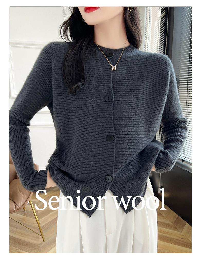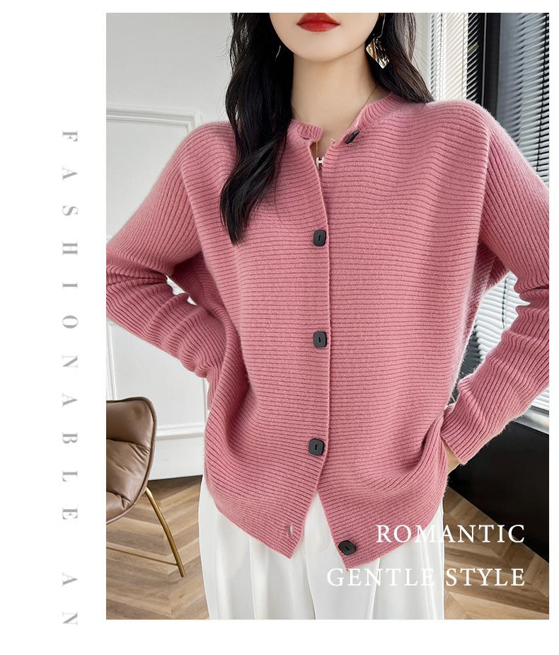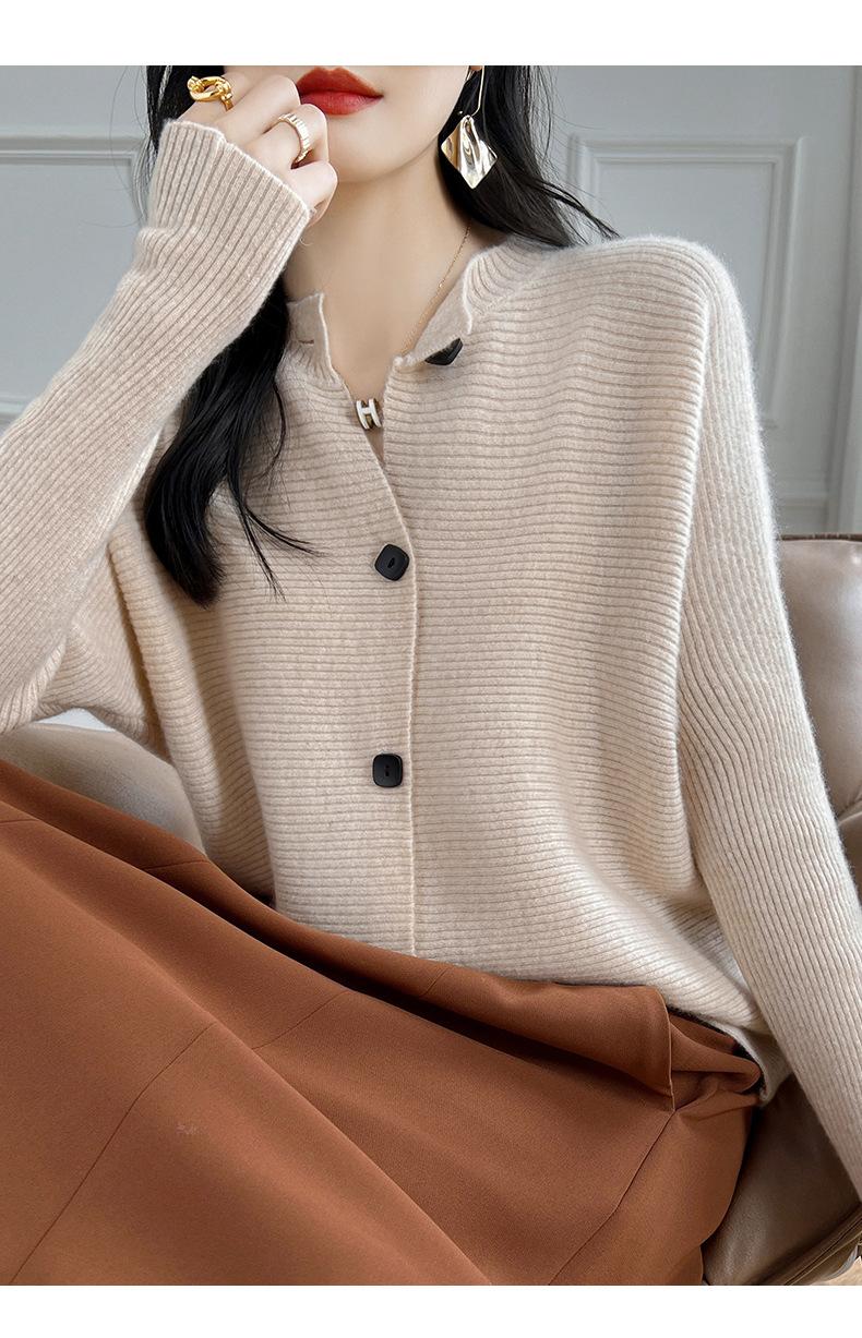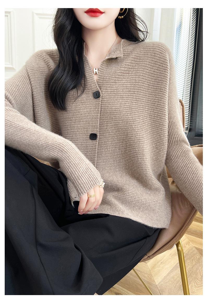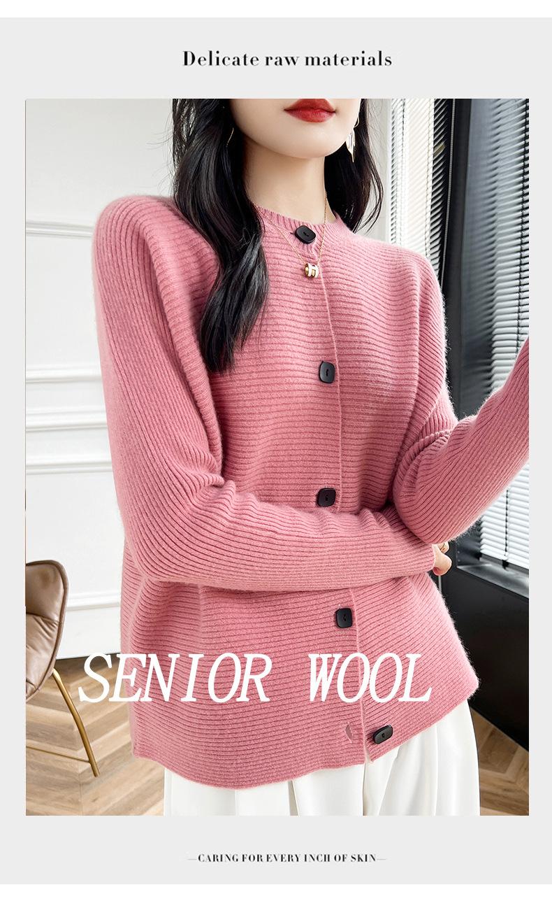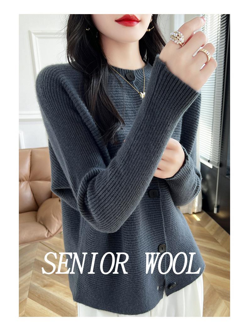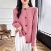Suéter holgado de lana de punto con cuello redondo y botones de manga larga para otoño e invierno, cárdigan de lana 100% pura para mujer
