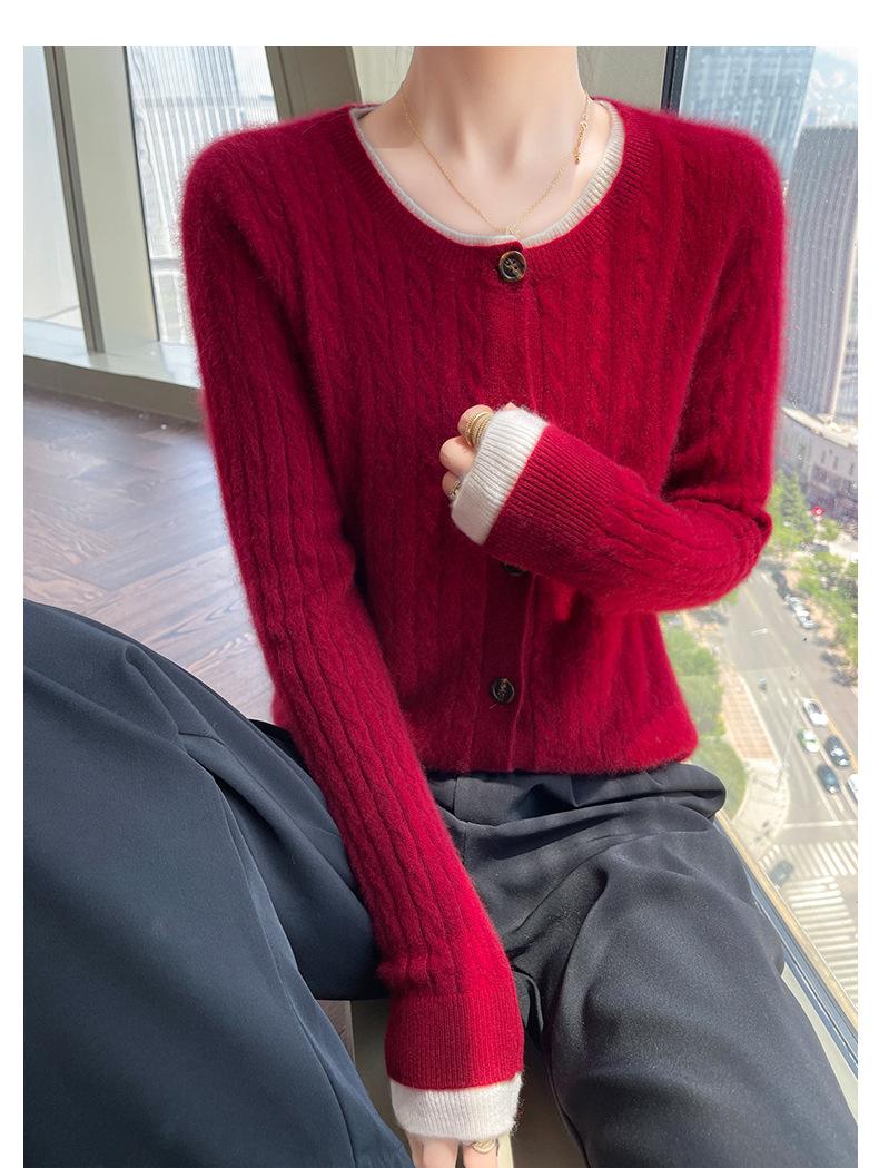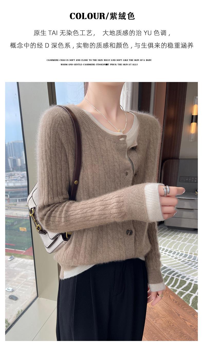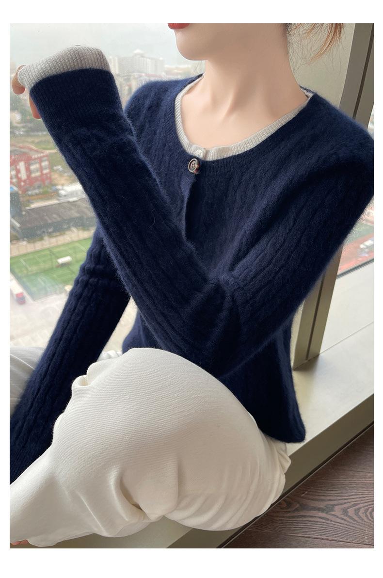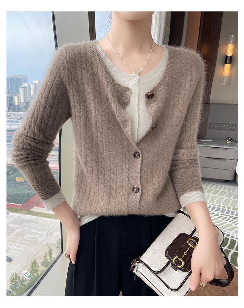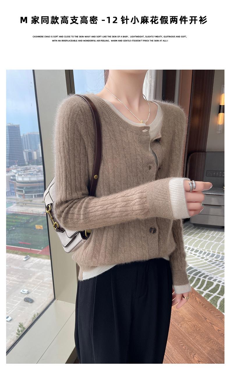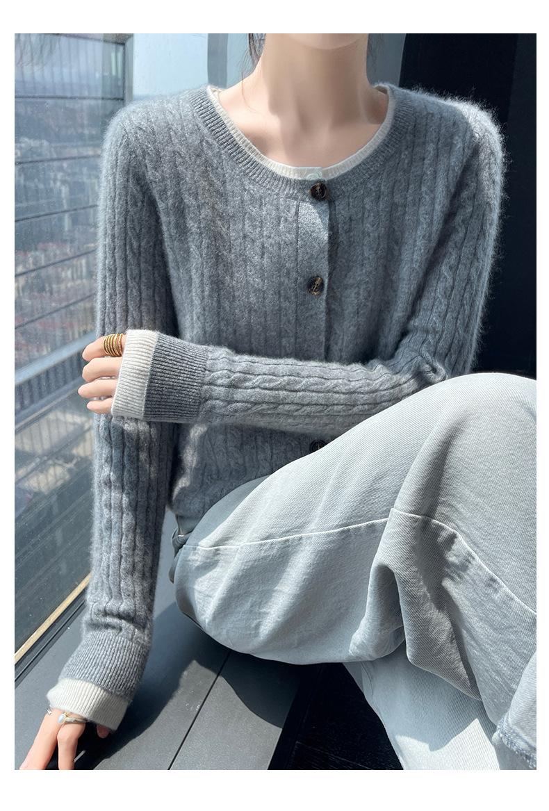 Cárdigan de cachemira suave y encerado para mujer, cuello redondo, color a juego, falso suéter de punto trenzado de dos piezas, chaqueta, camisa holgada con base de lana