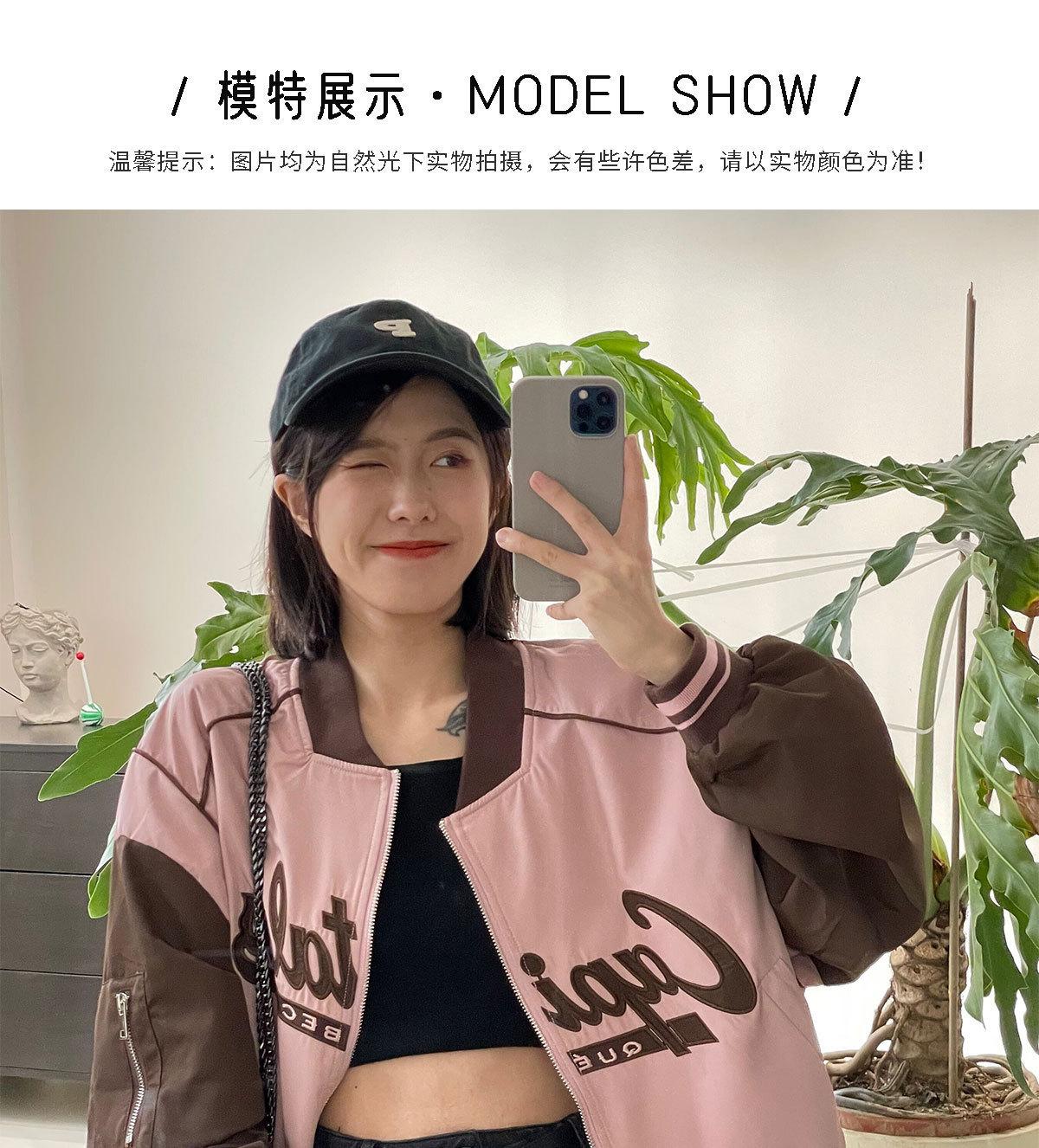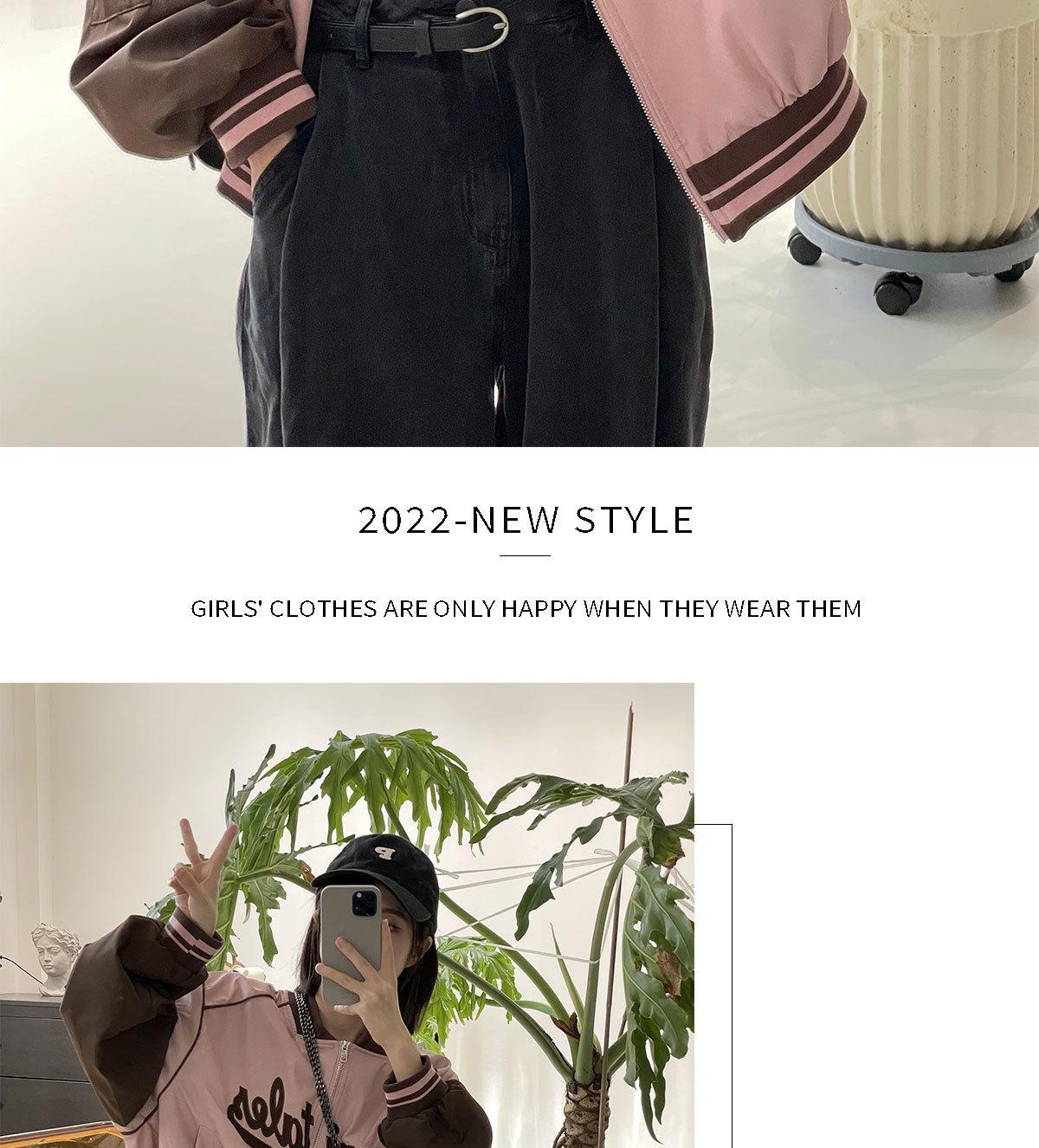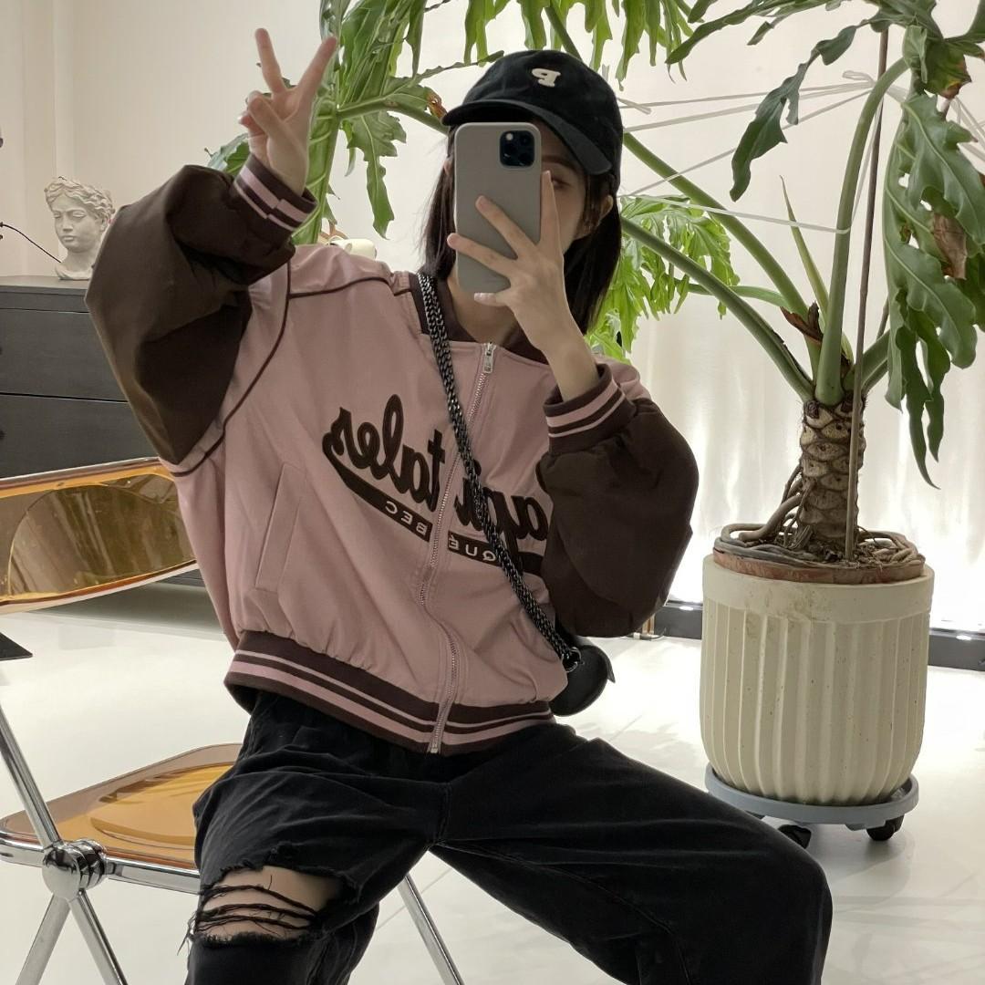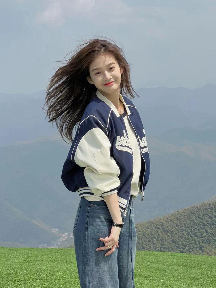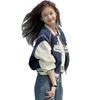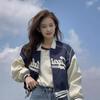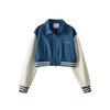 Uniforme de Béisbol Estilo Preppy Retro Americano para Mujer Principios de Otoño Nuevo Top con Cuello Alto y Bloque de Color Chaqueta Azul con Cierre para Mujer