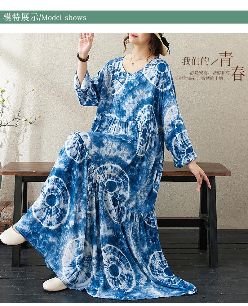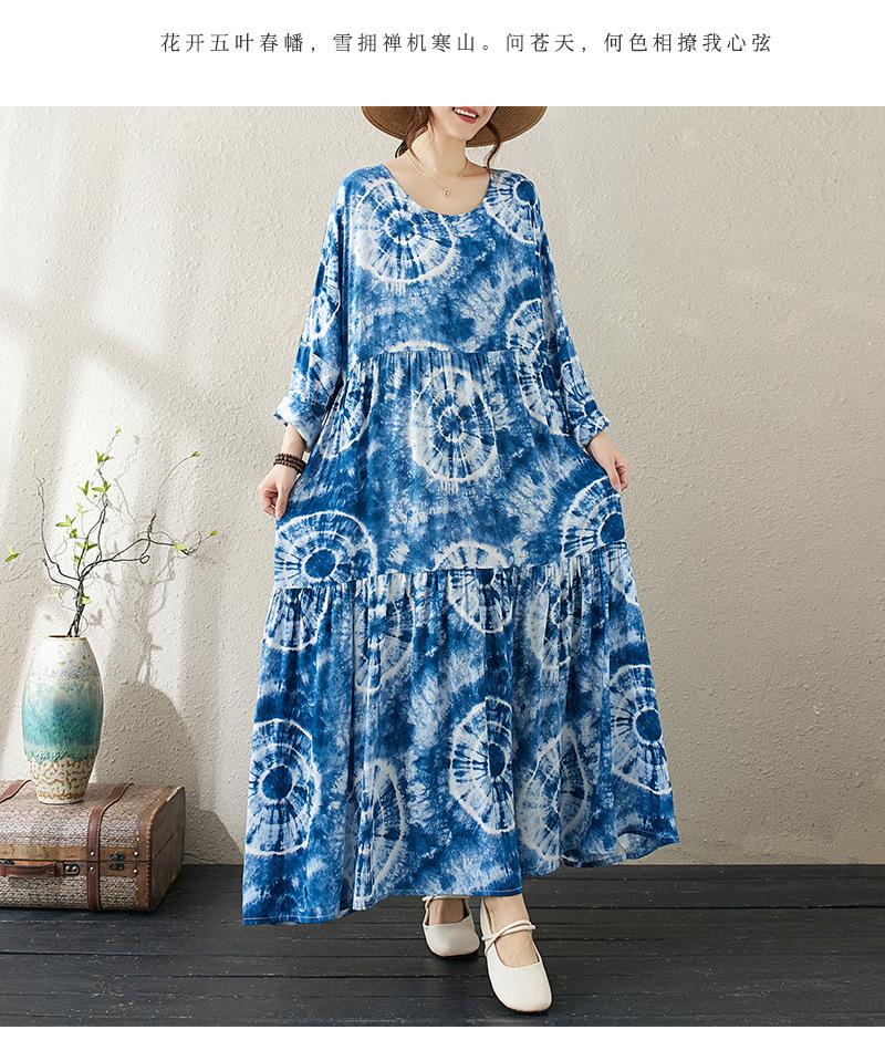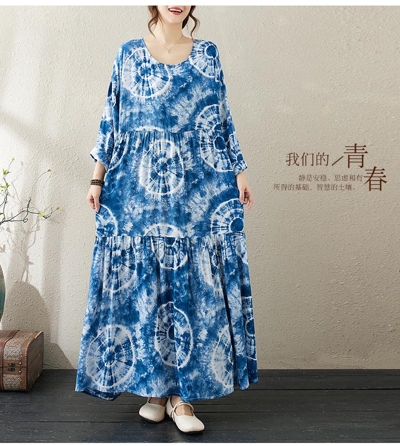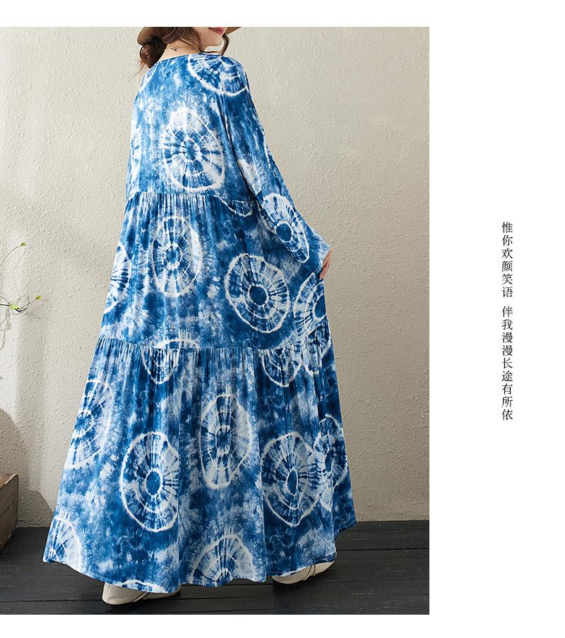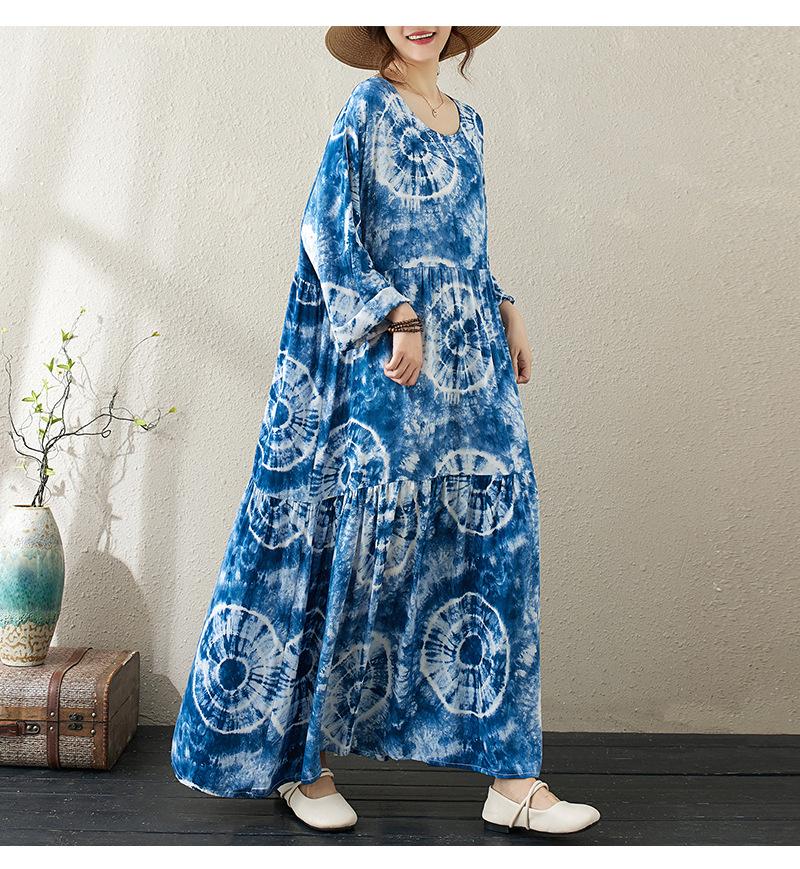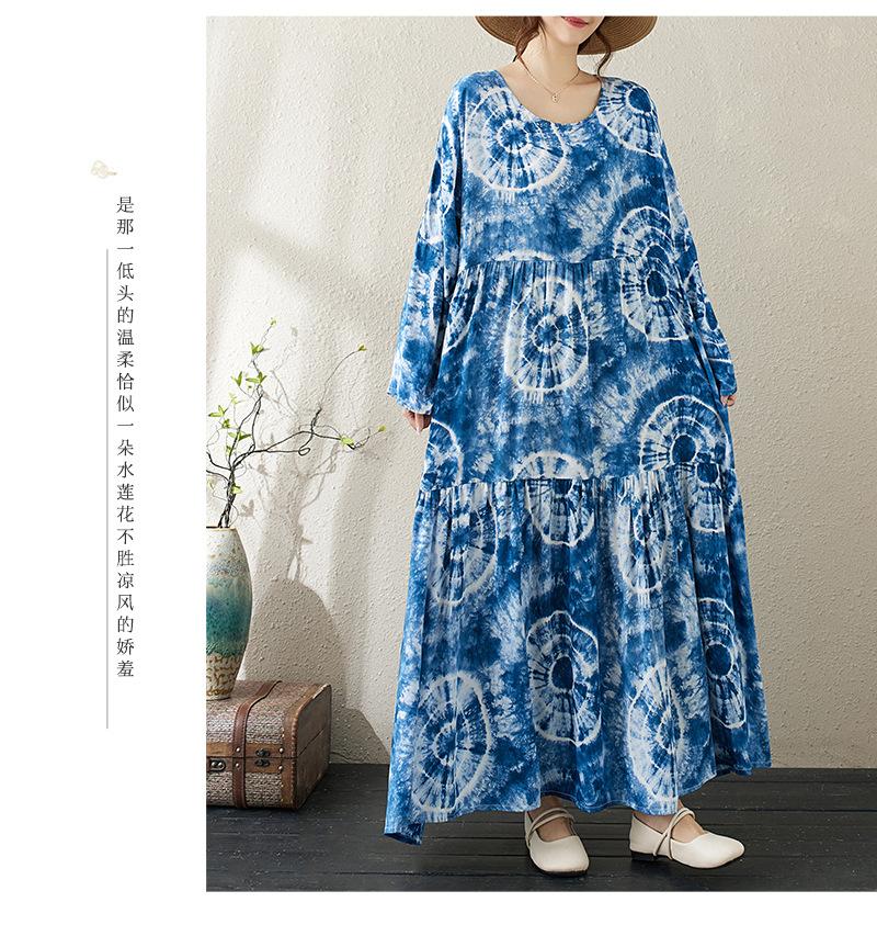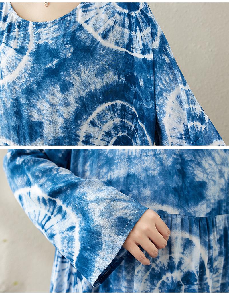 Falda holgada de manga larga con cuello redondo y estampado de flores de seda de algodón fino de otoño para chica gordita, con efecto tie-dye azul, estilo pastel, con vuelo grande, corte A