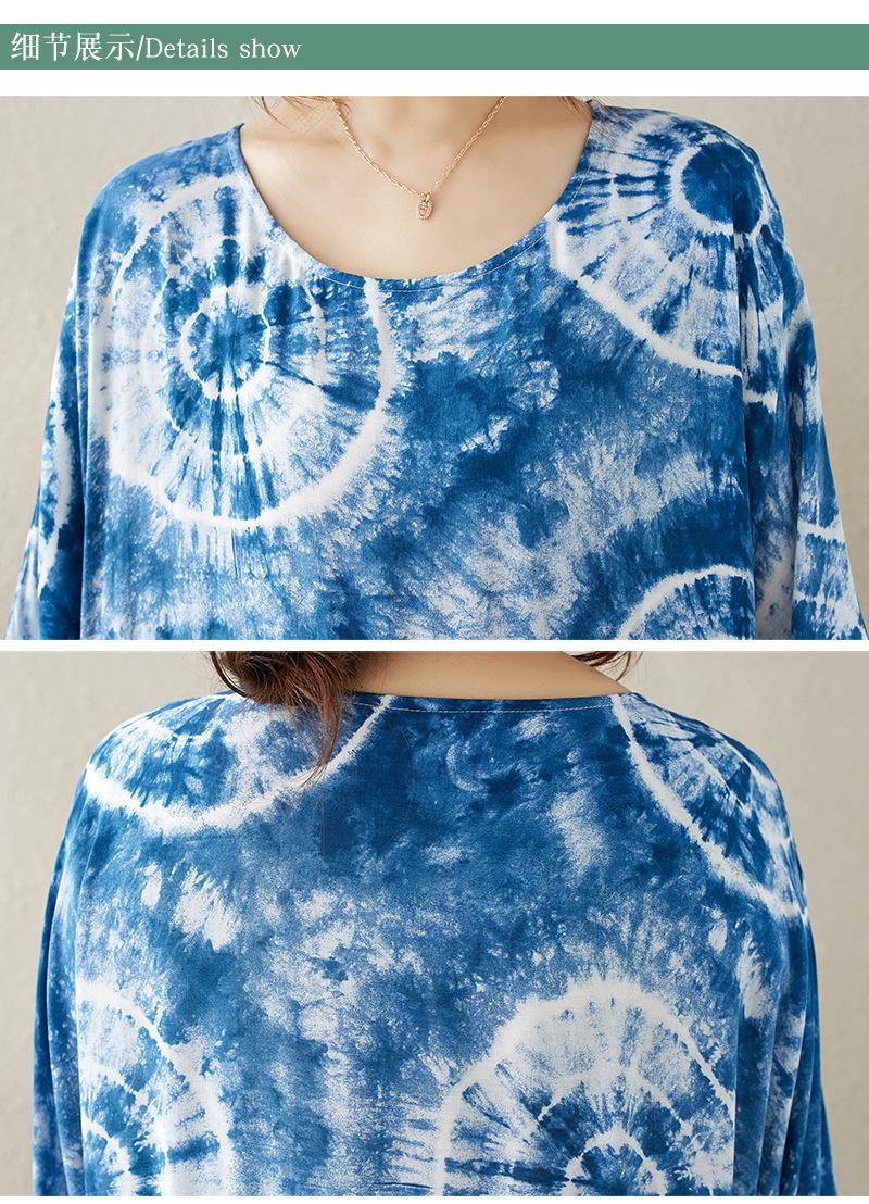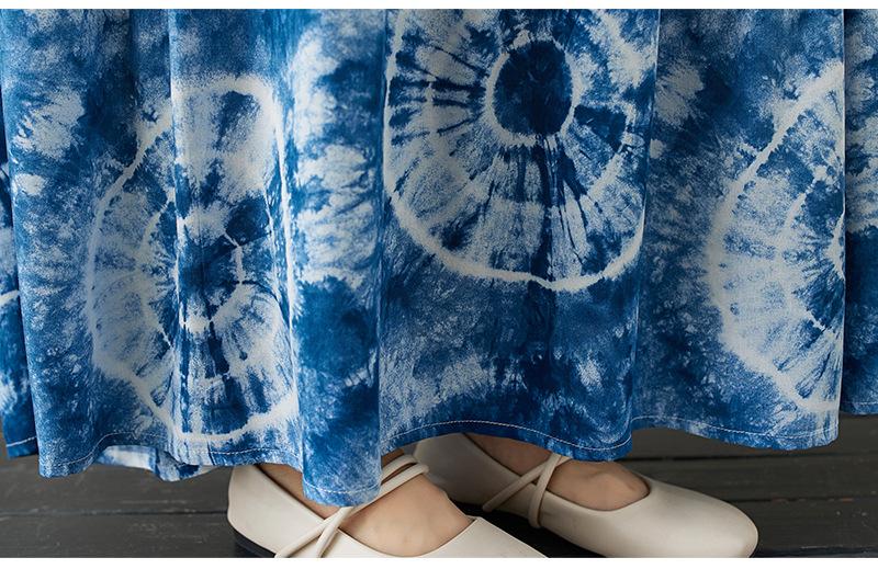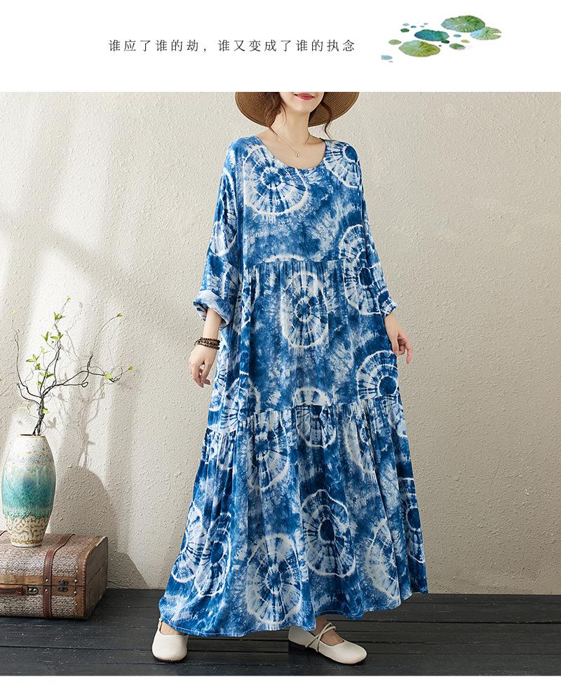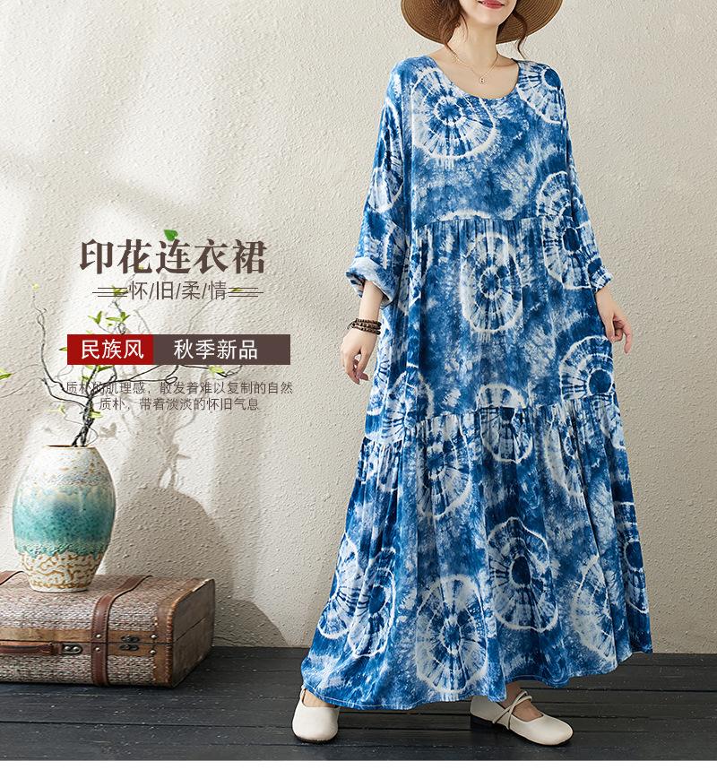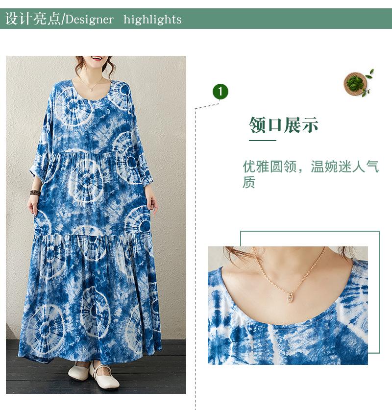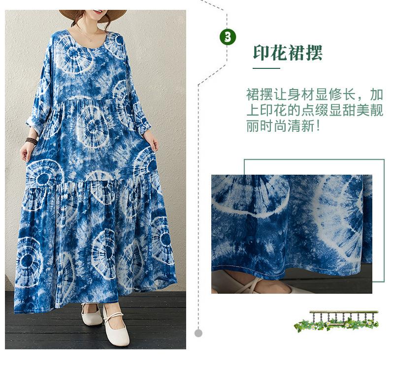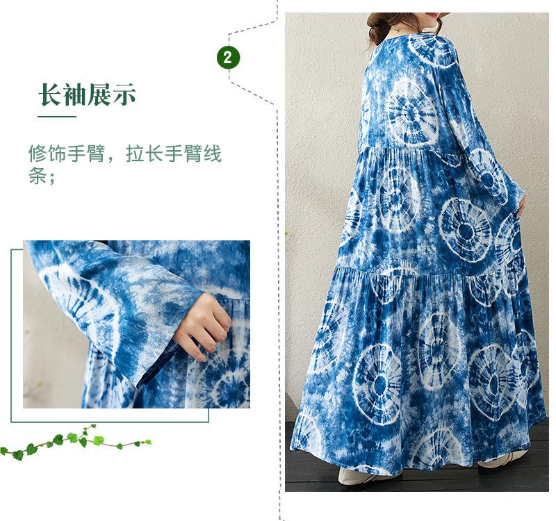 Falda holgada de manga larga con cuello redondo y estampado de flores de seda de algodón fino de otoño para chica gordita, con efecto tie-dye azul, estilo pastel, con vuelo grande, corte A