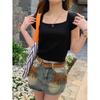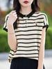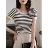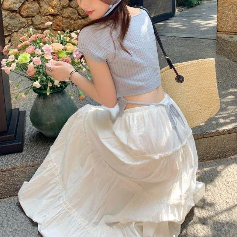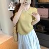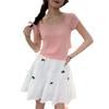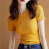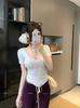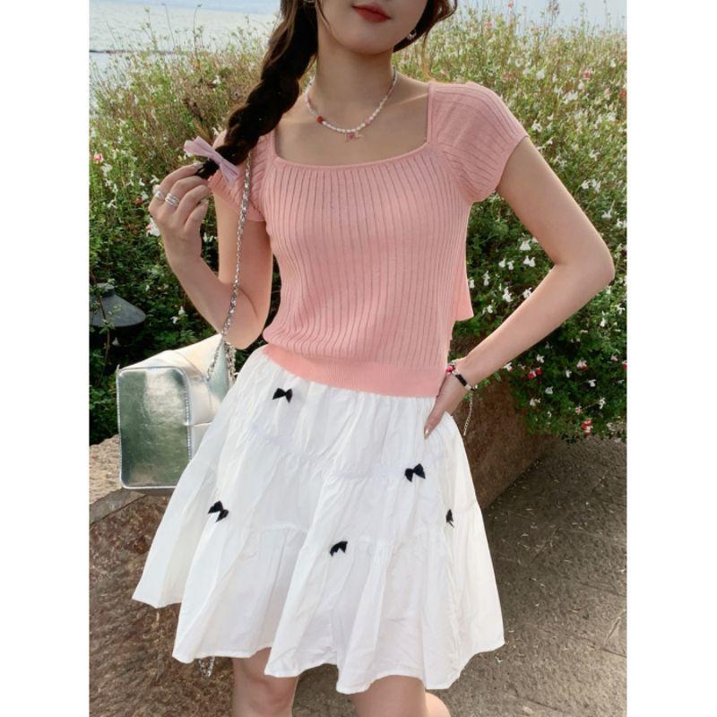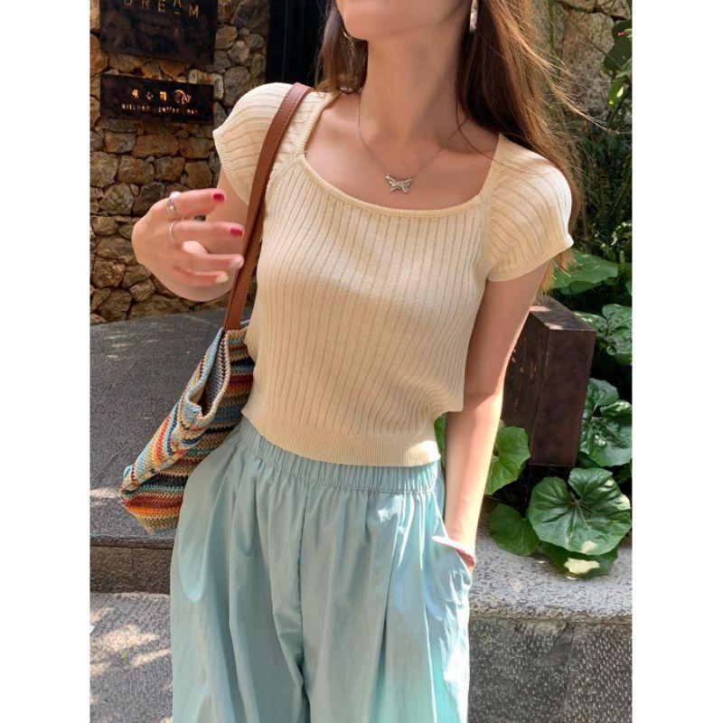 Nueva Camiseta de Verano de Punto de Manga Corta para Mujer, Top Corto Vintage Ajustado Azul de Cuello Cuadrado con un Toque de Alta Gama