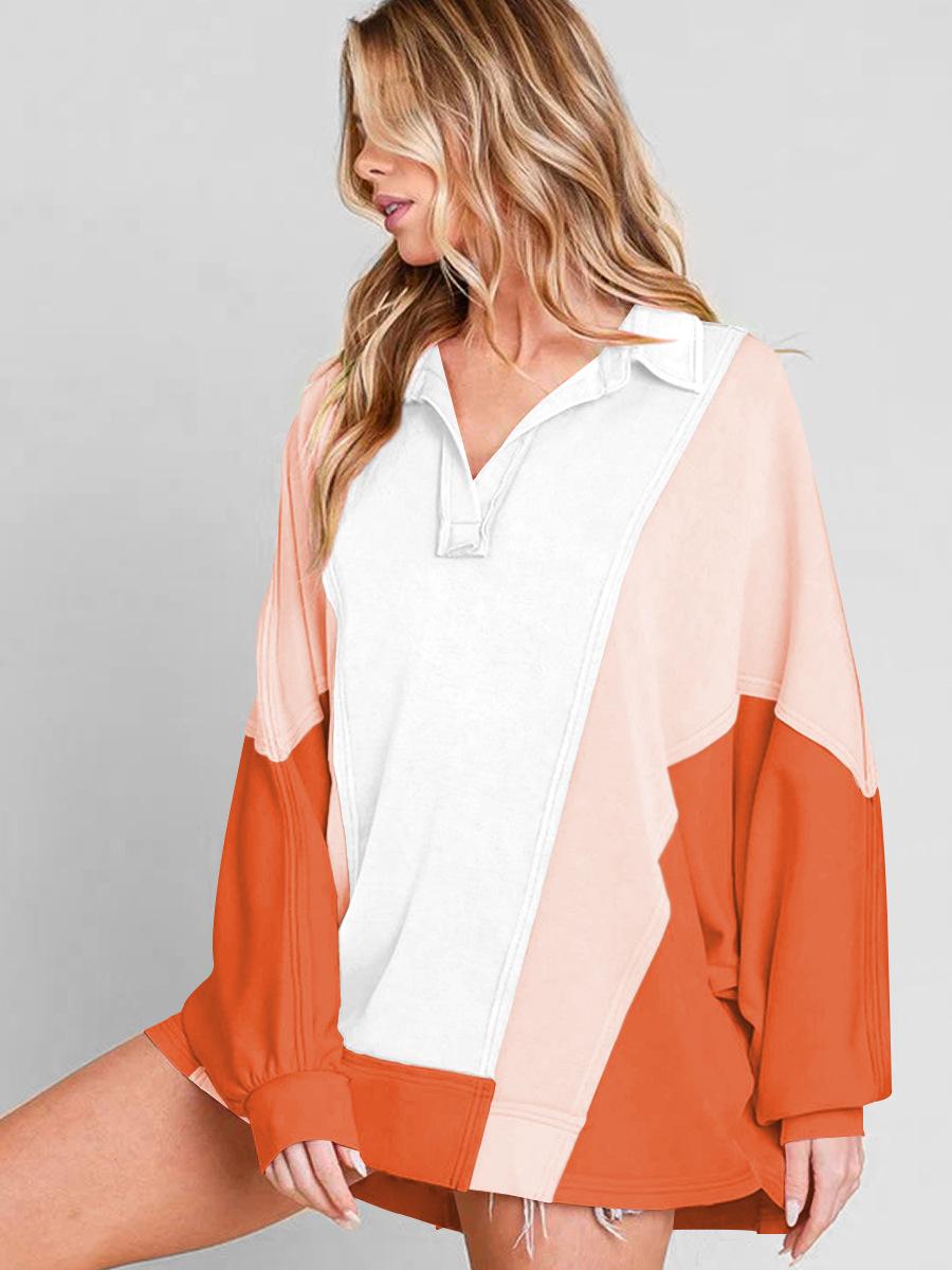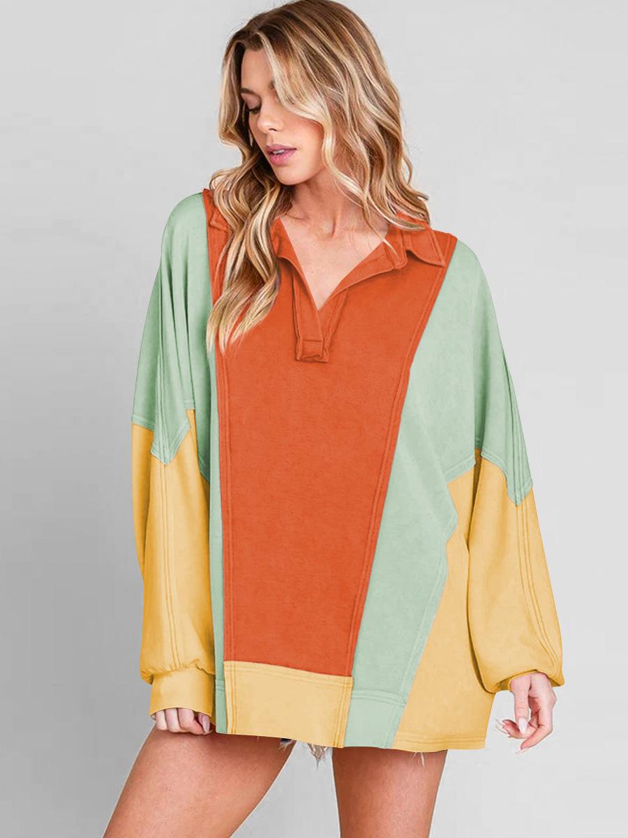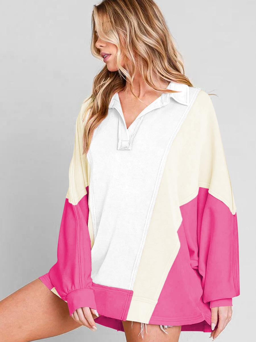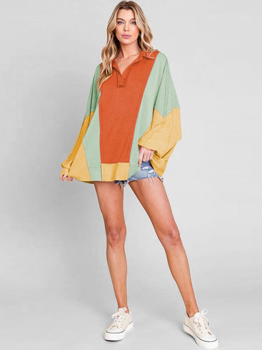 Amazon Europeo y Americano Nuevo Polo de Mujer Costuras de Color Suéter Holgado Casual Decorativo Manga Larga