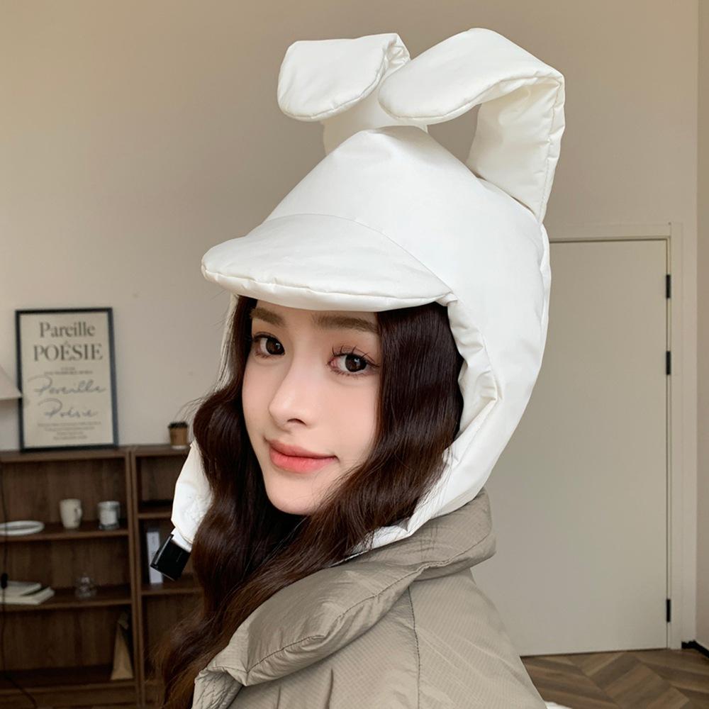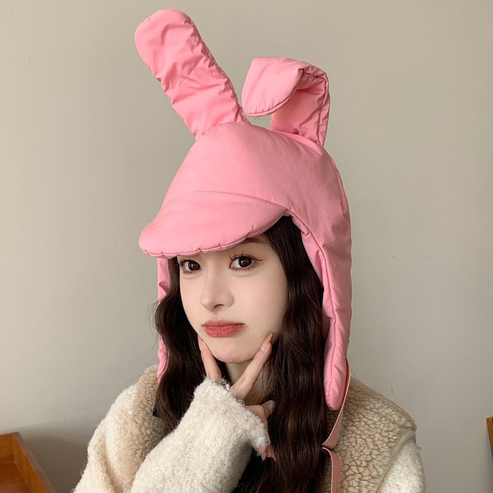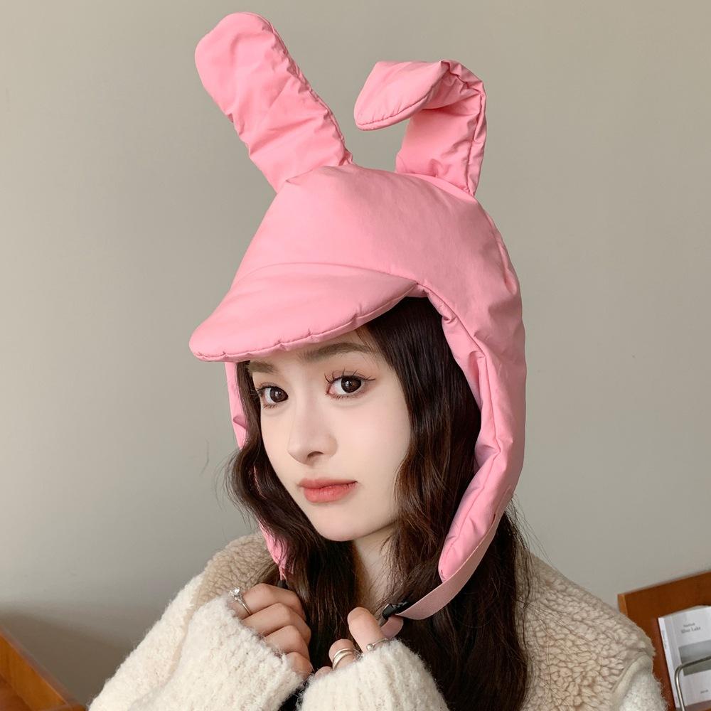 Sombrero Invierno Conejo Rosa Orejas Plegables Algodón Plumón Sombrero Lei Feng para Mujer Cálido Protección para las Orejas Sombrero Cara Pequeña Gorro Pulóver