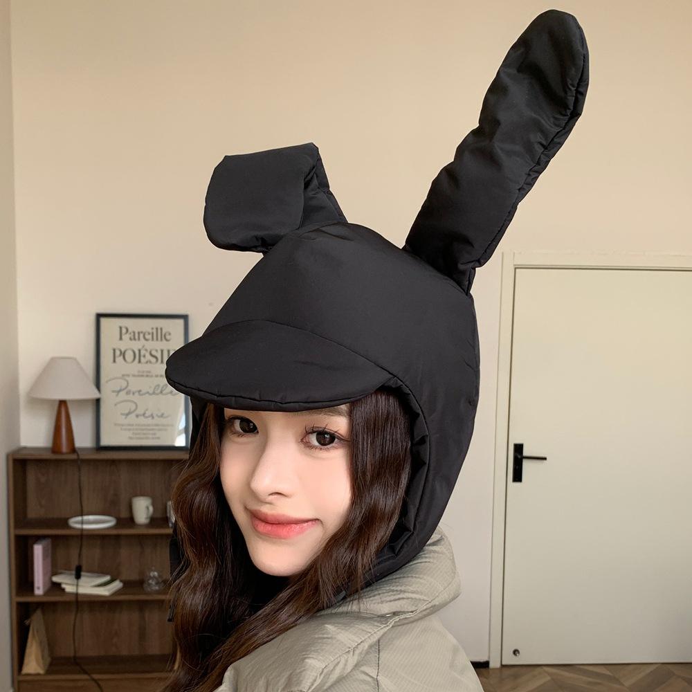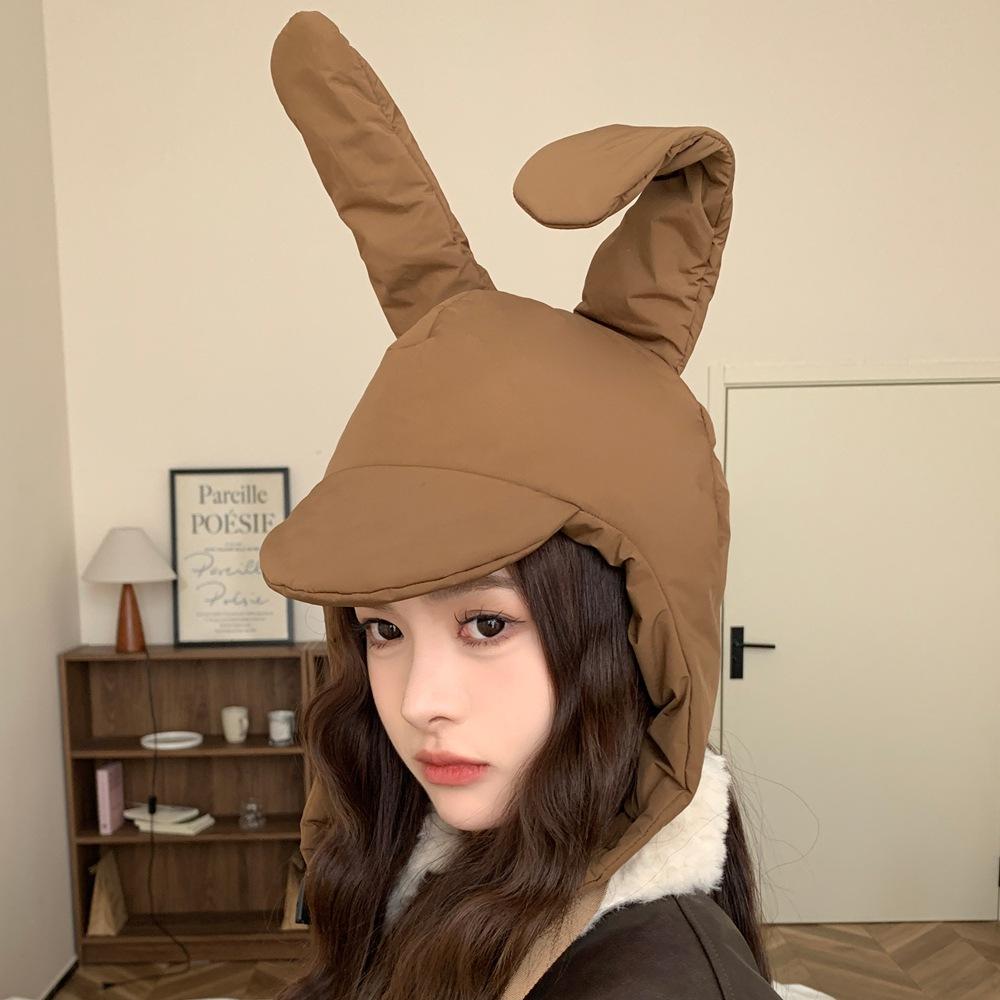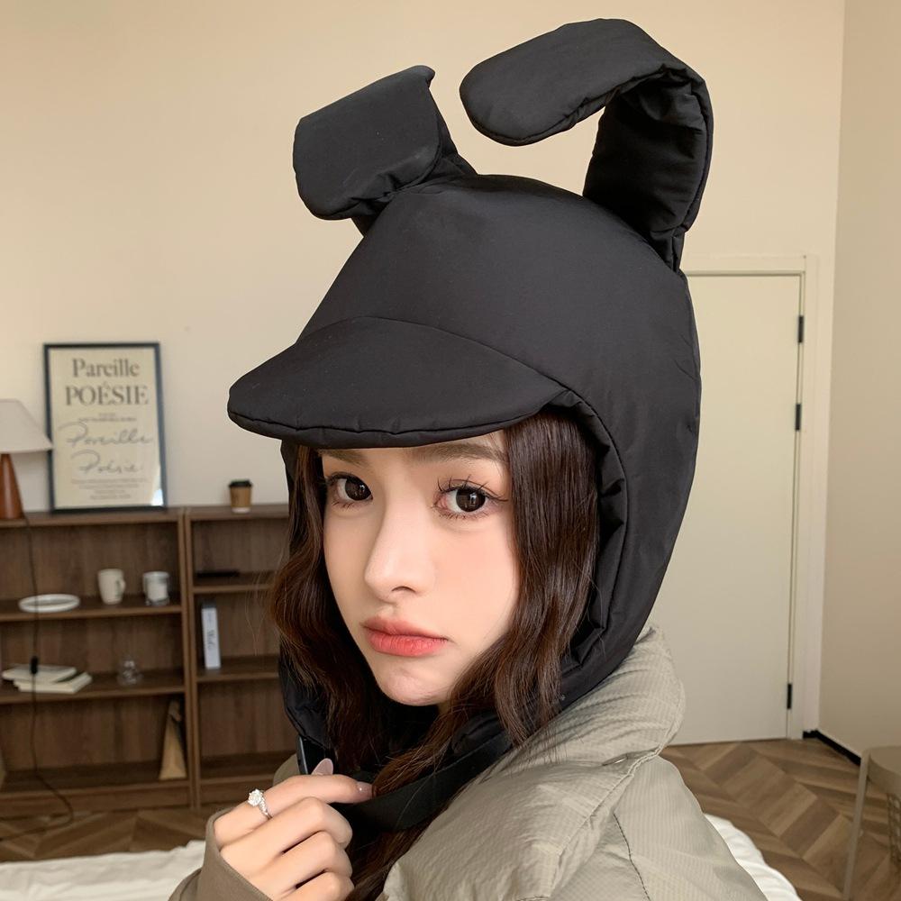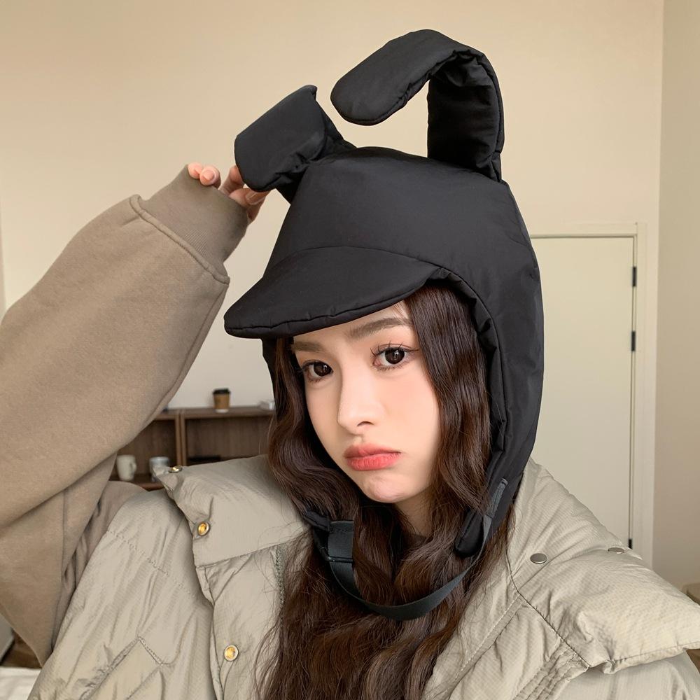 Sombrero Invierno Conejo Rosa Orejas Plegables Algodón Plumón Sombrero Lei Feng para Mujer Cálido Protección para las Orejas Sombrero Cara Pequeña Gorro Pulóver