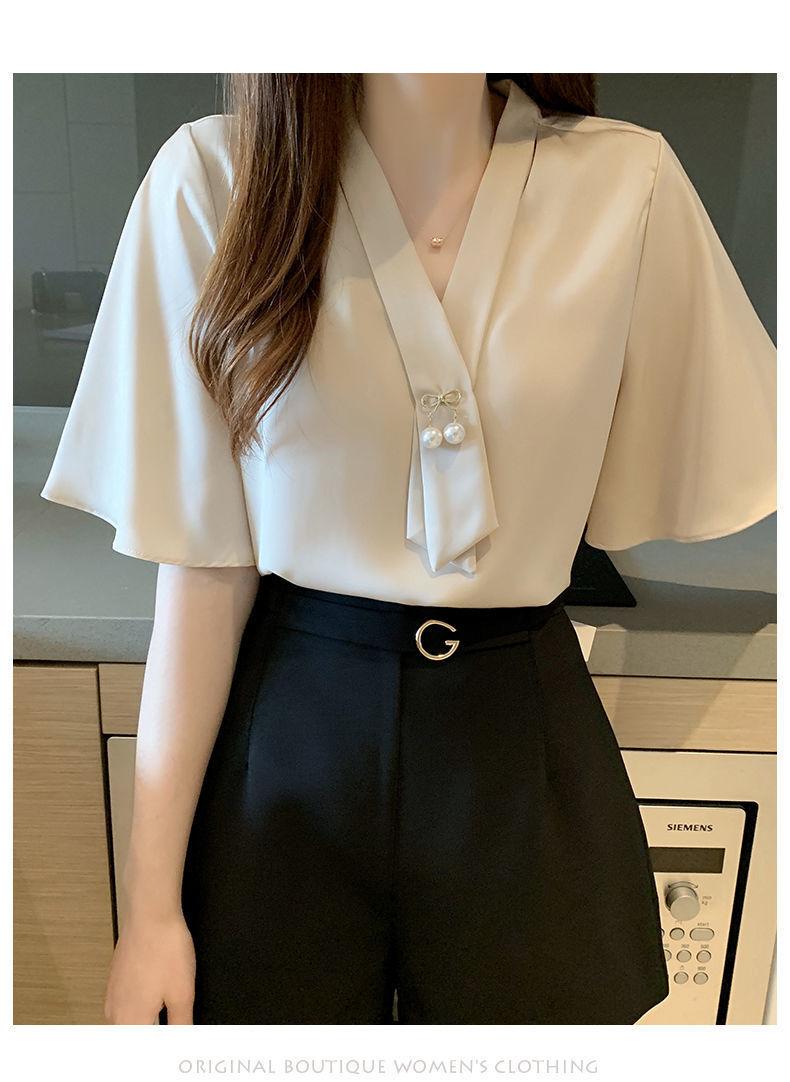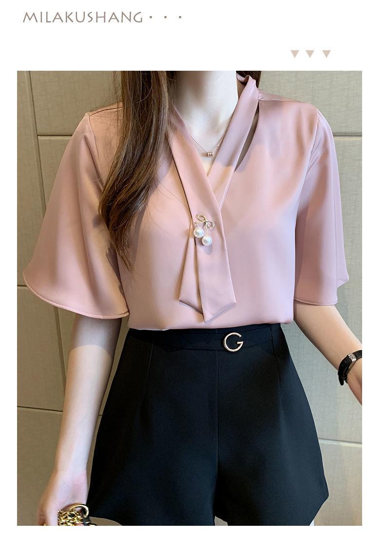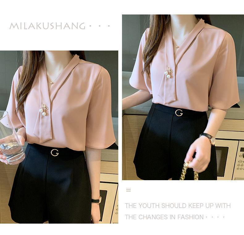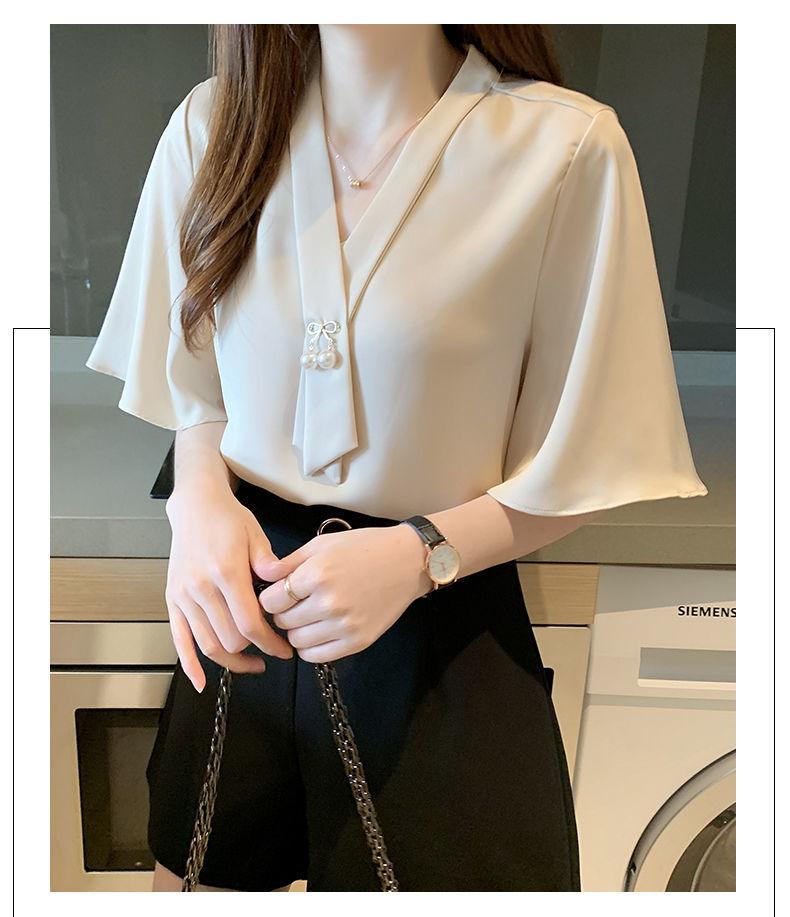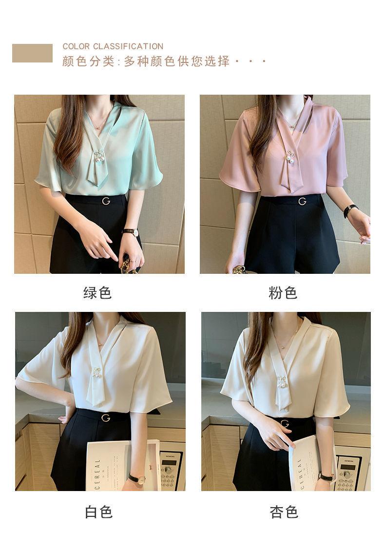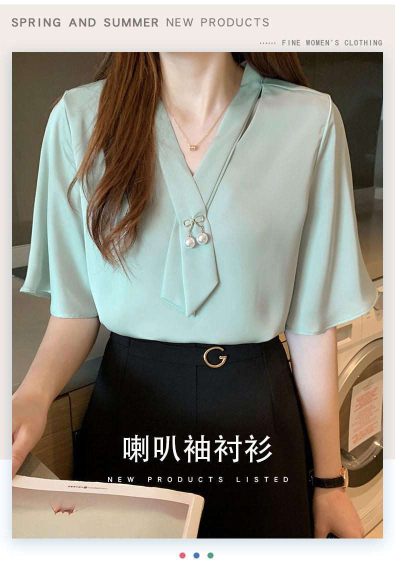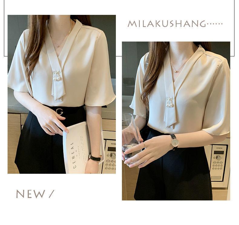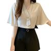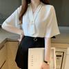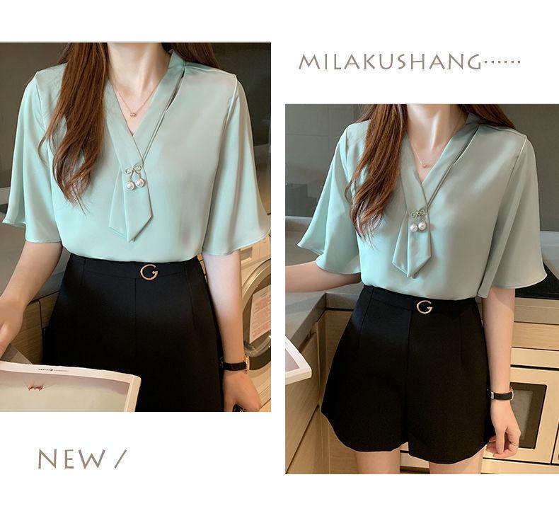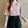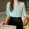 Camisa de gasa para mujer, de verano, de manga media, estilo coreano, holgada, elegante, con cuello de trompeta, elegante, básica