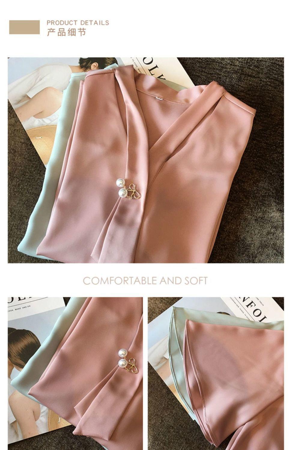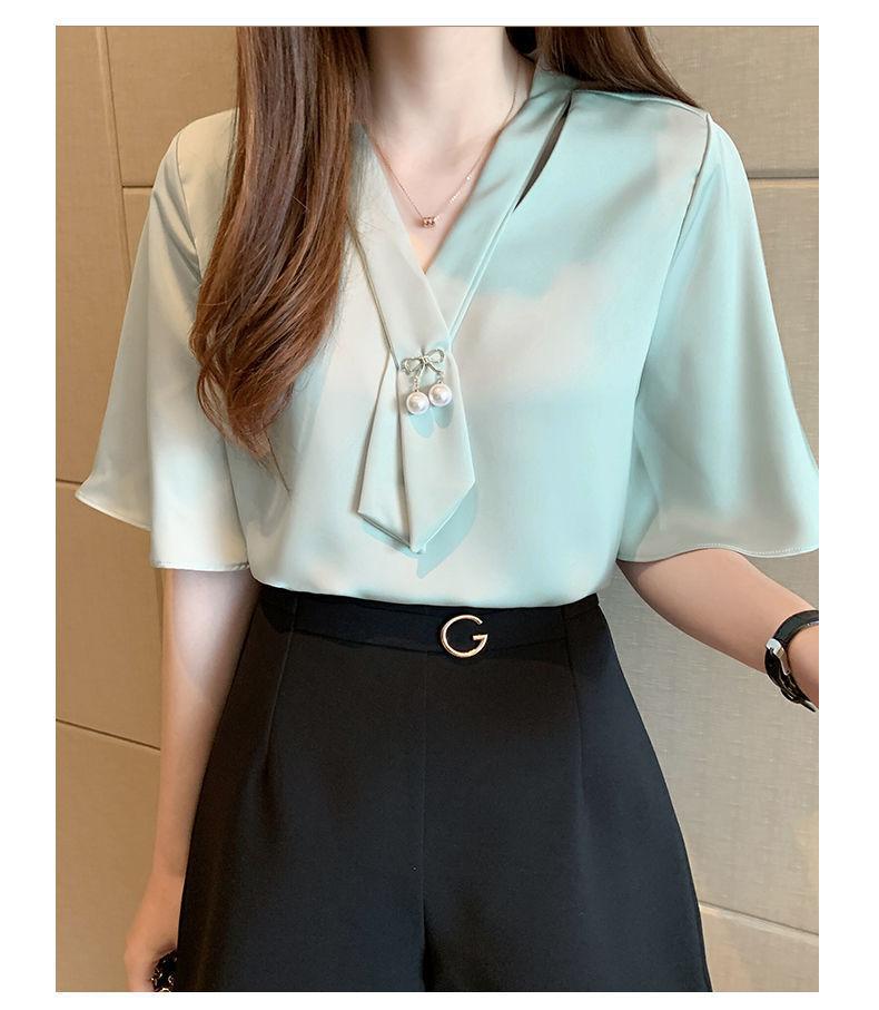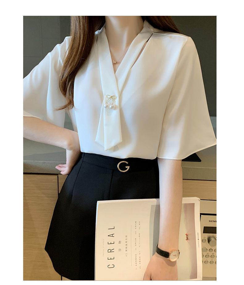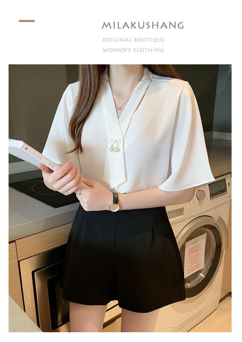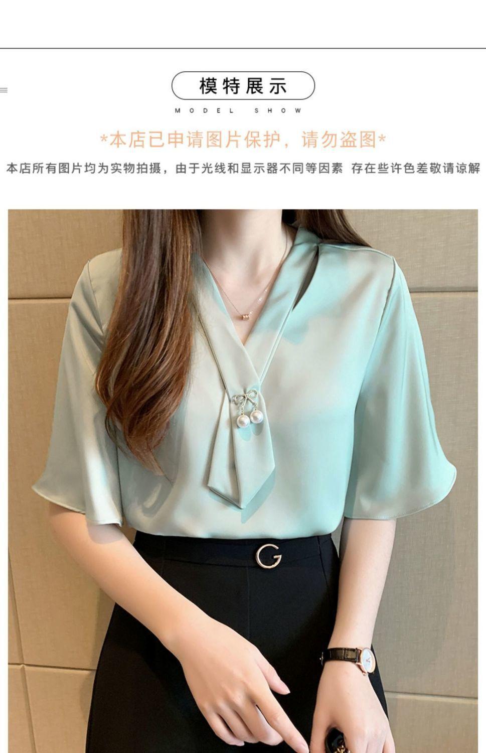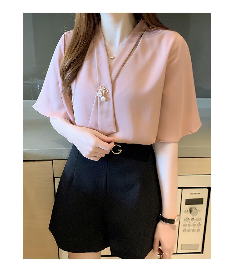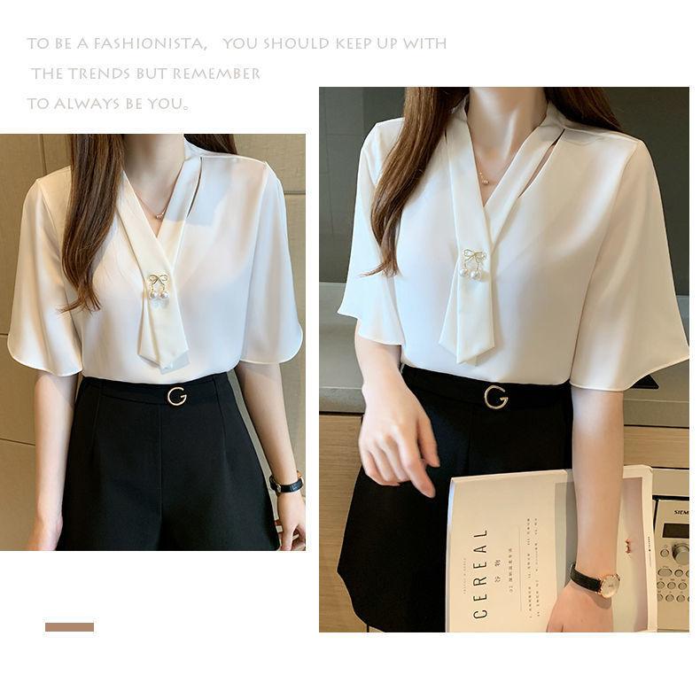 Camisa de gasa para mujer, de verano, de manga media, estilo coreano, holgada, elegante, con cuello de trompeta, elegante, básica