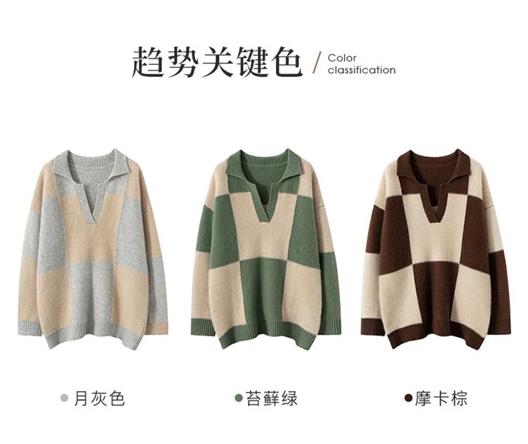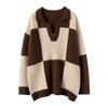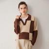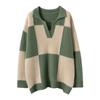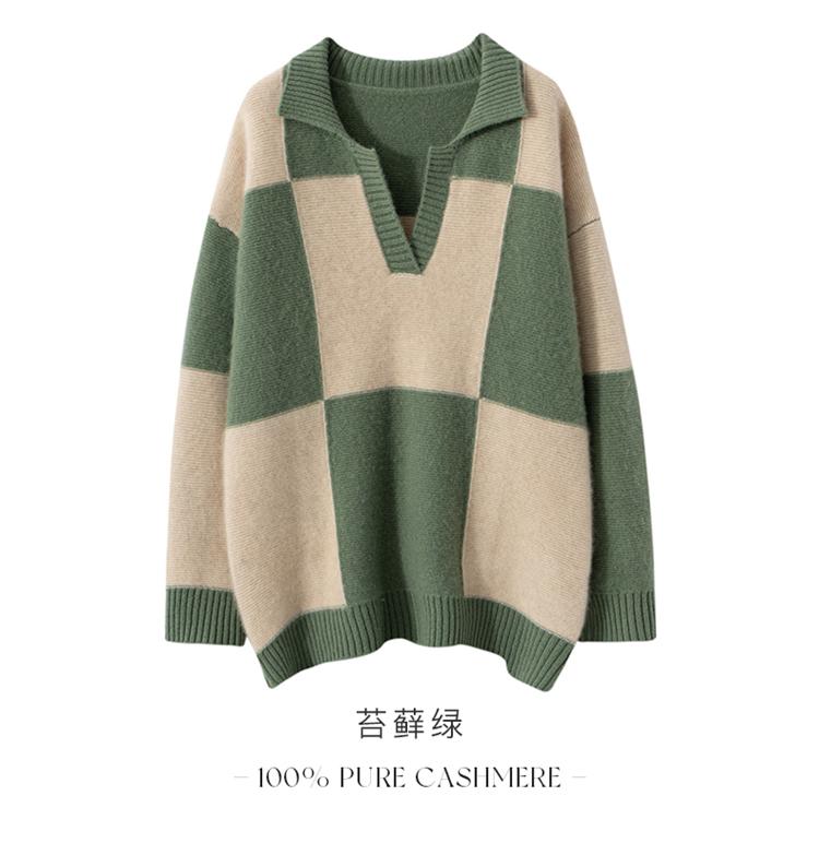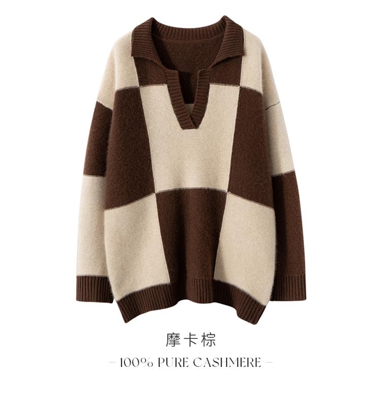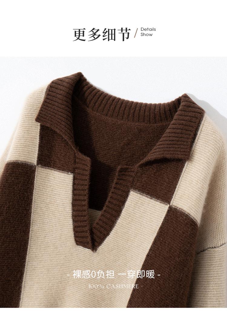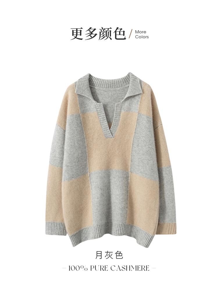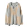 Suéter de cachemira pura 100% para mujer, otoño e invierno, nuevo, suelto, con solapa y bloques de color, suéter de cachemira de base tejida.