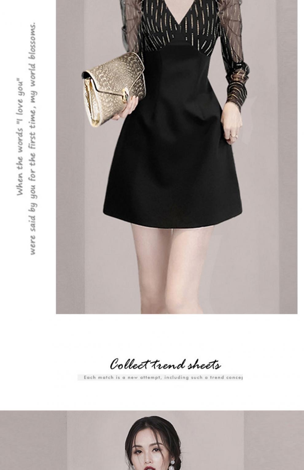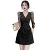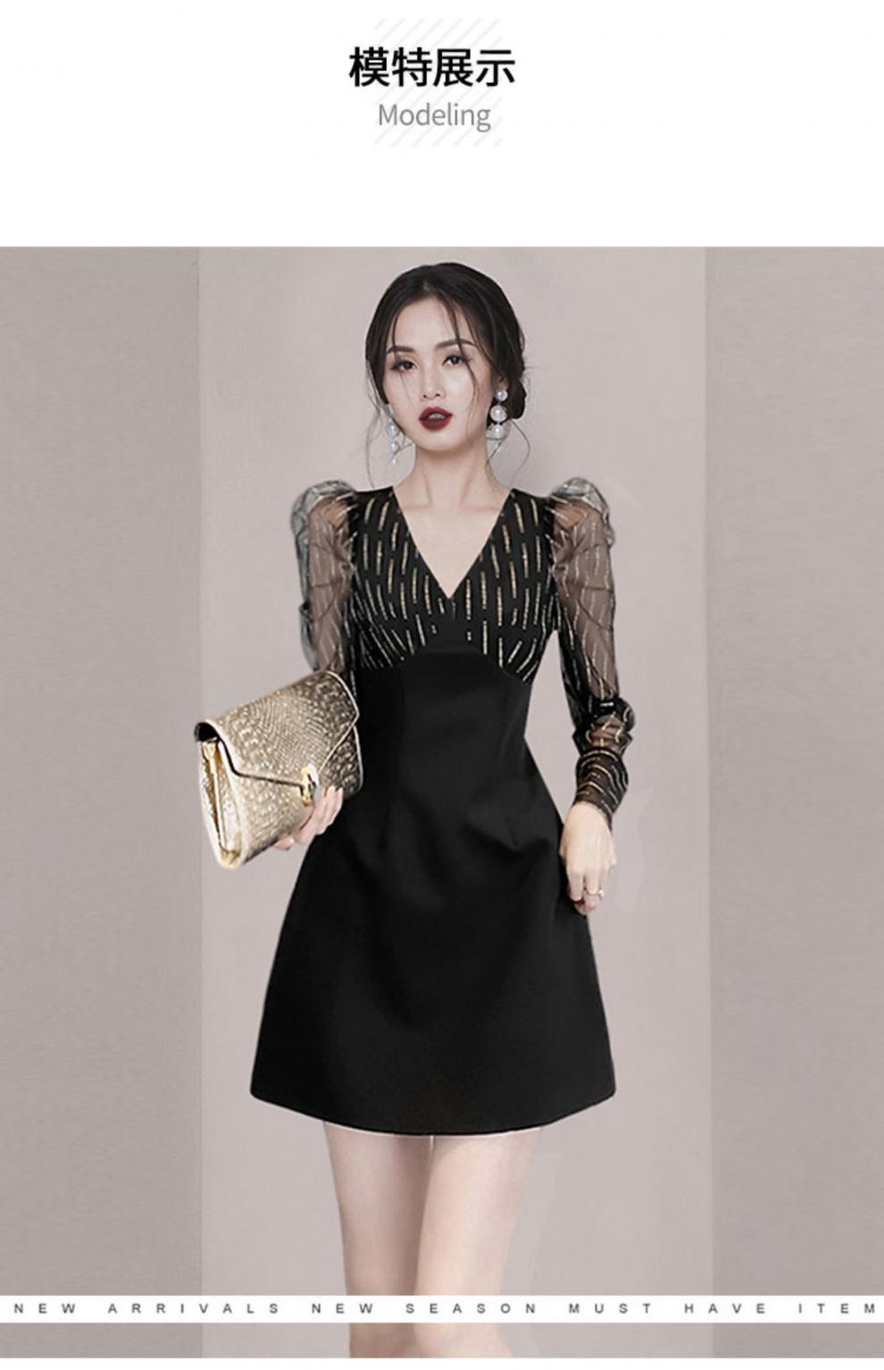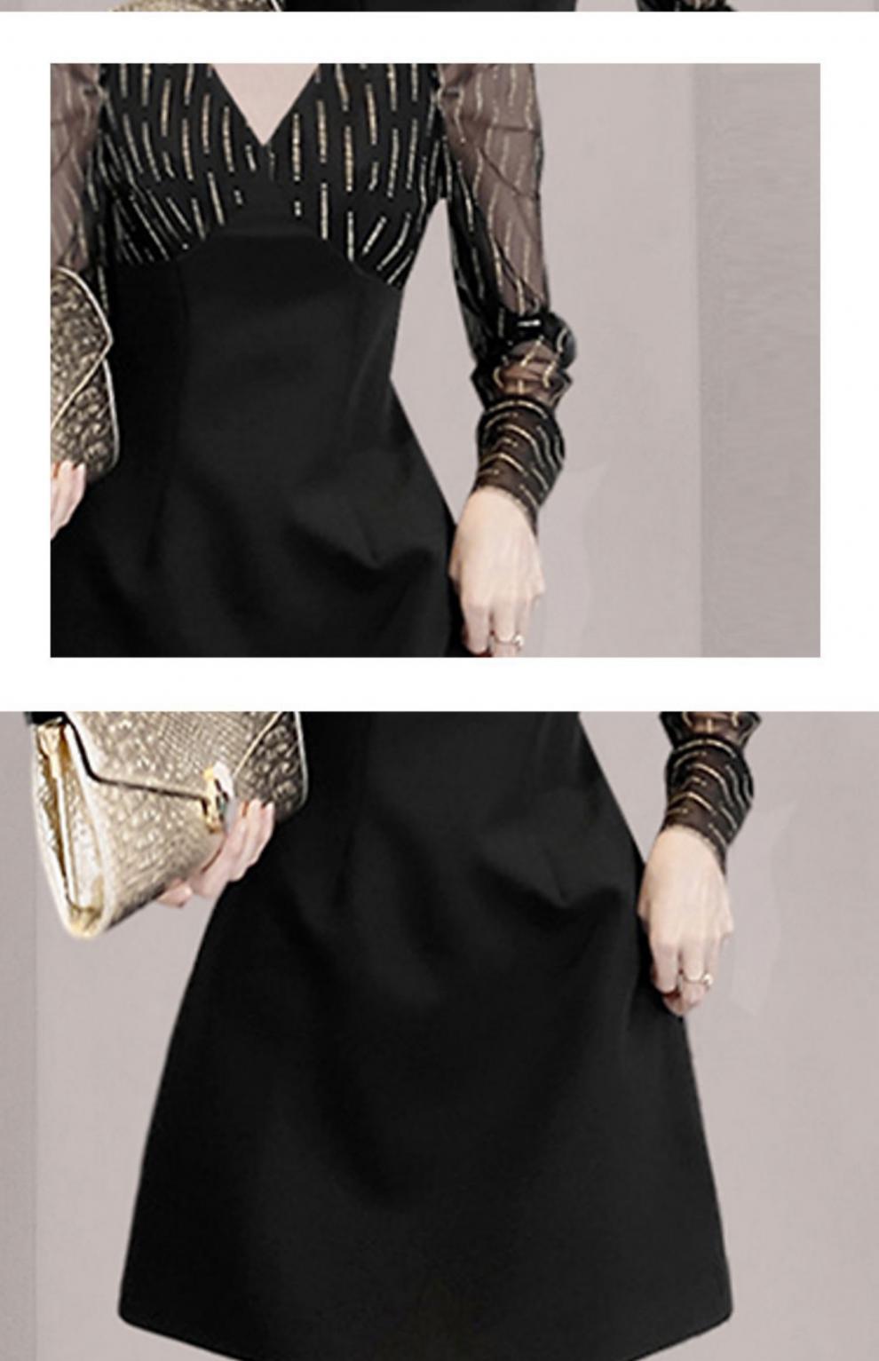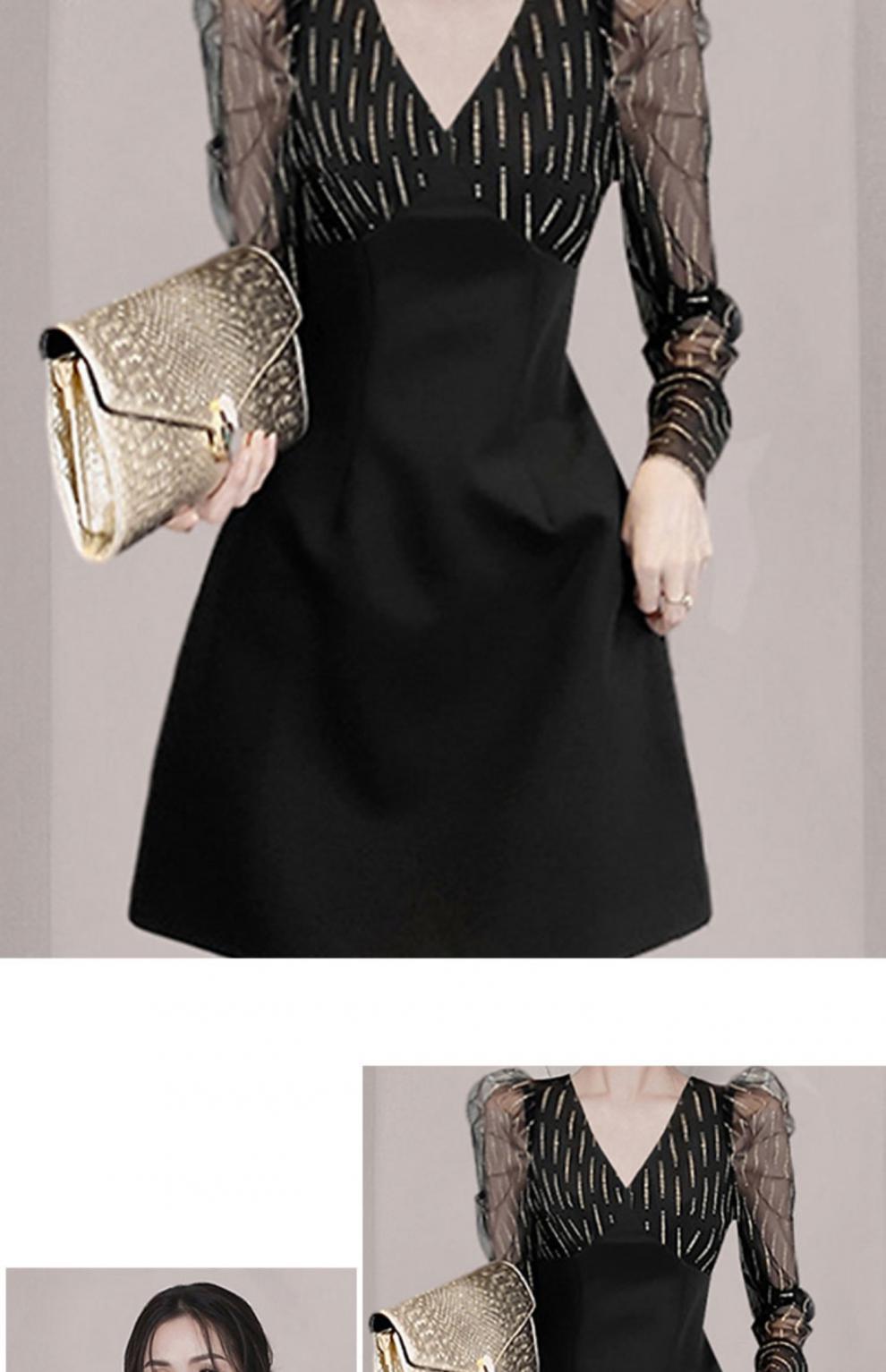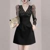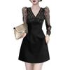 Vestido Negro Corto Estilo Hepburn Transfronterizo 2023 Nuevo Vestido de Malla y Cintura con Cuello en V Estilo Francés para Mujer