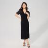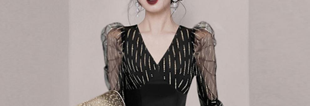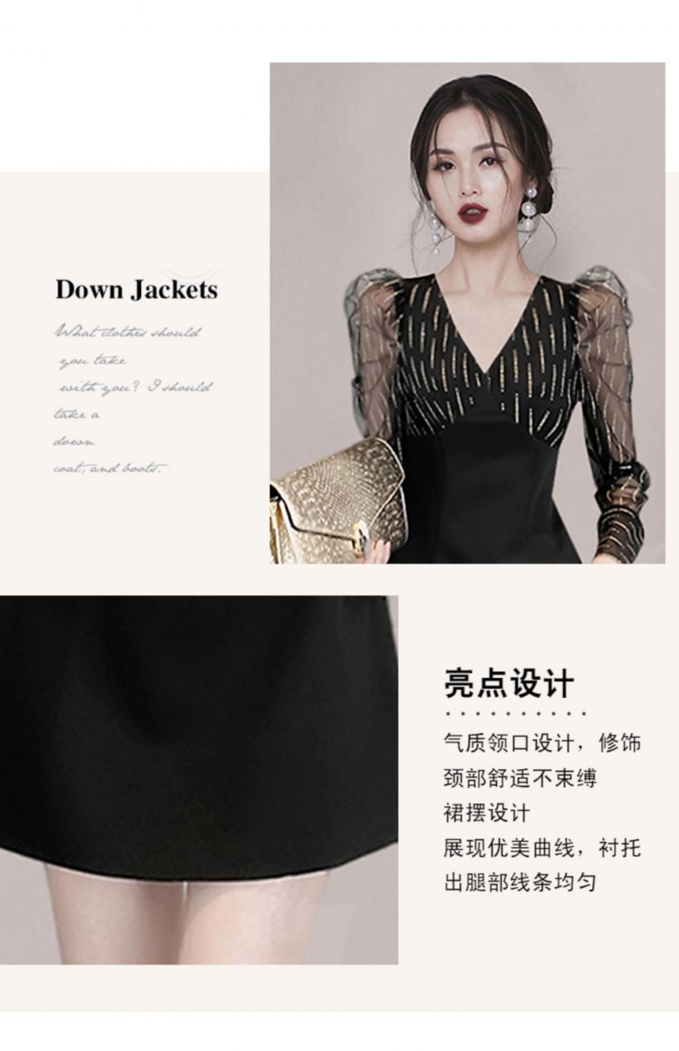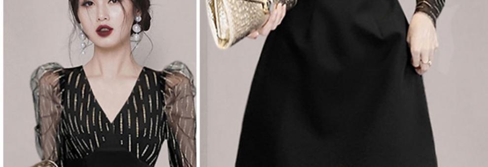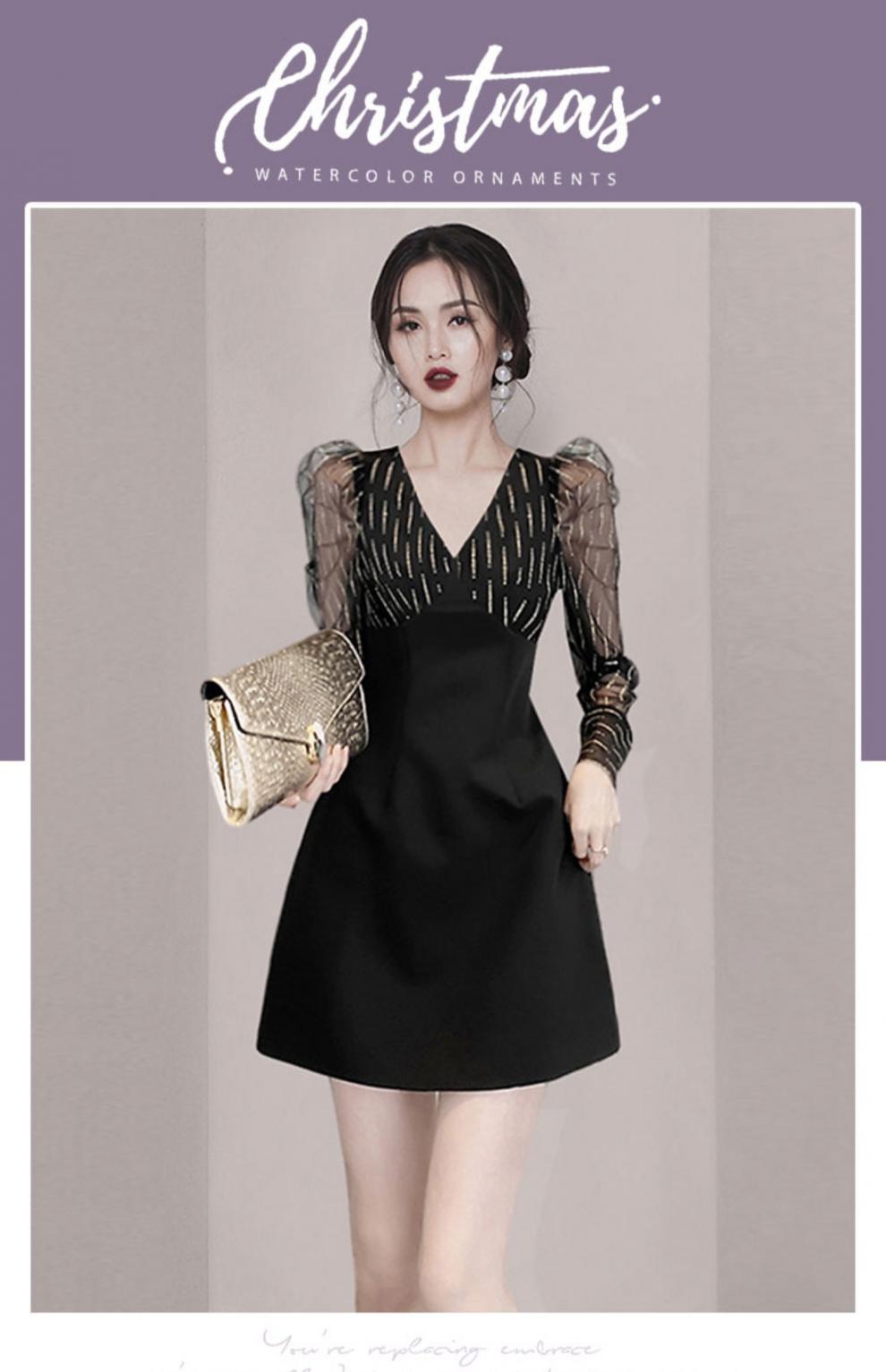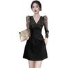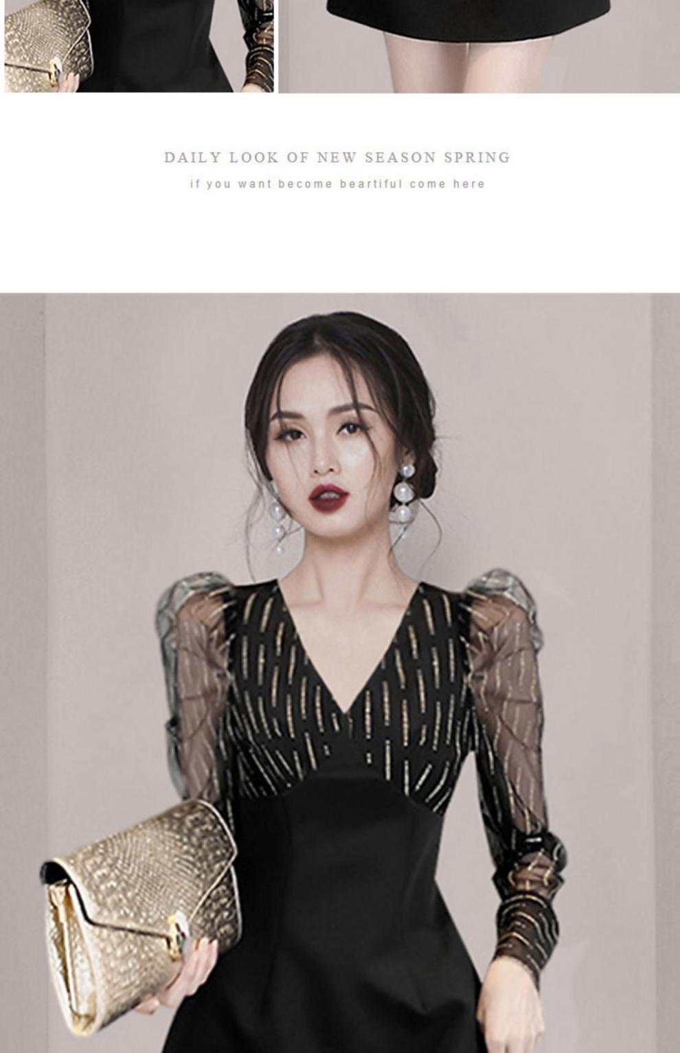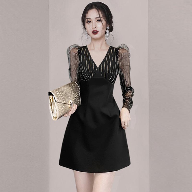 Vestido Negro Corto Estilo Hepburn Transfronterizo 2023 Nuevo Vestido de Malla y Cintura con Cuello en V Estilo Francés para Mujer