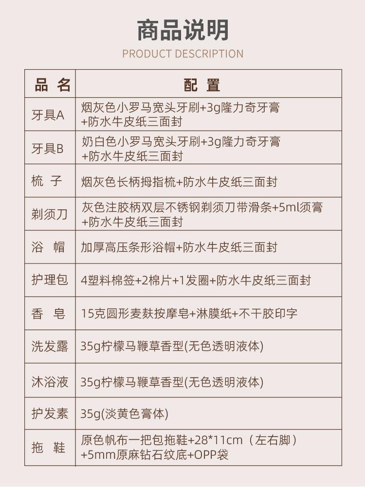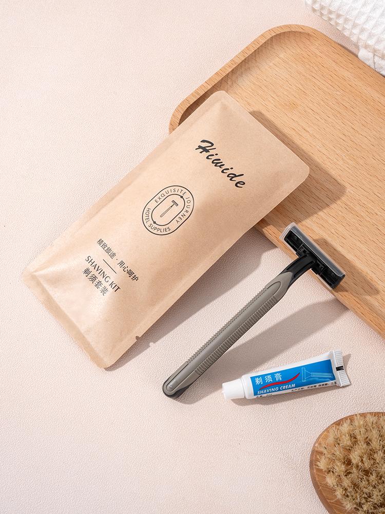 Disposable slippers, Disposable shower cap, Disposable soap, Disposable razor, Disposable toothbrush, Disposab...