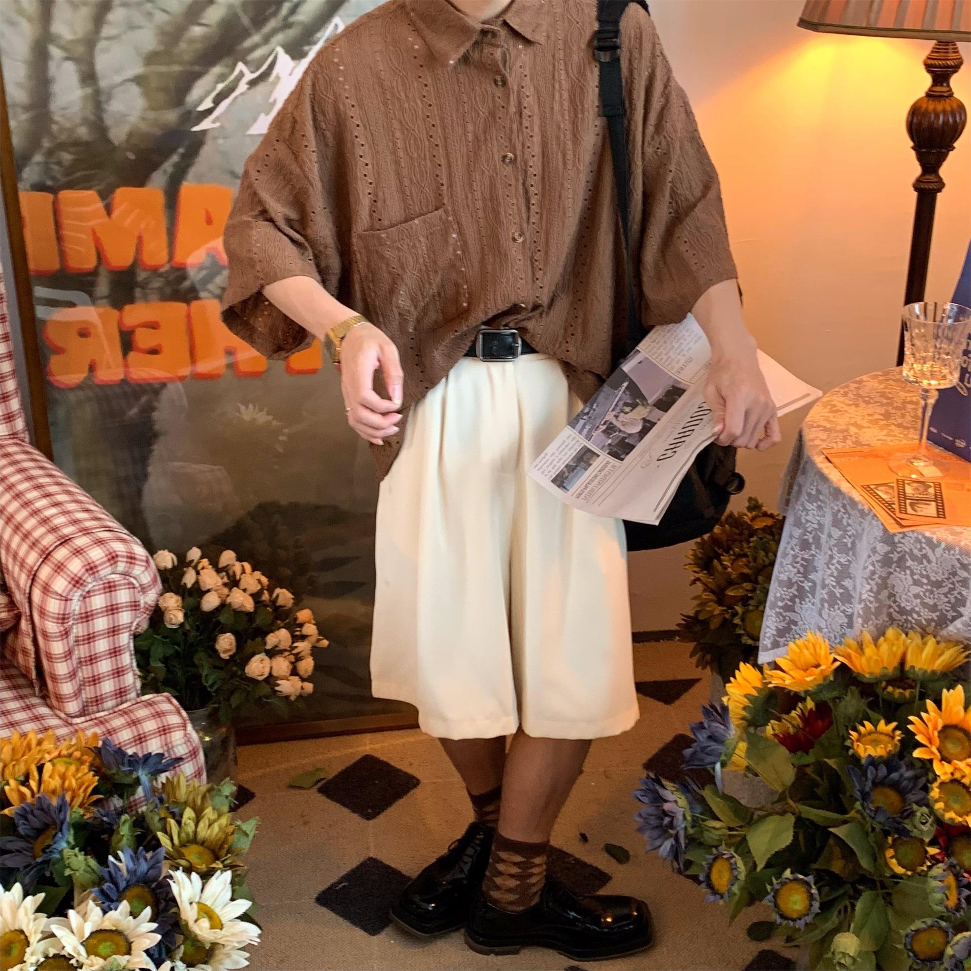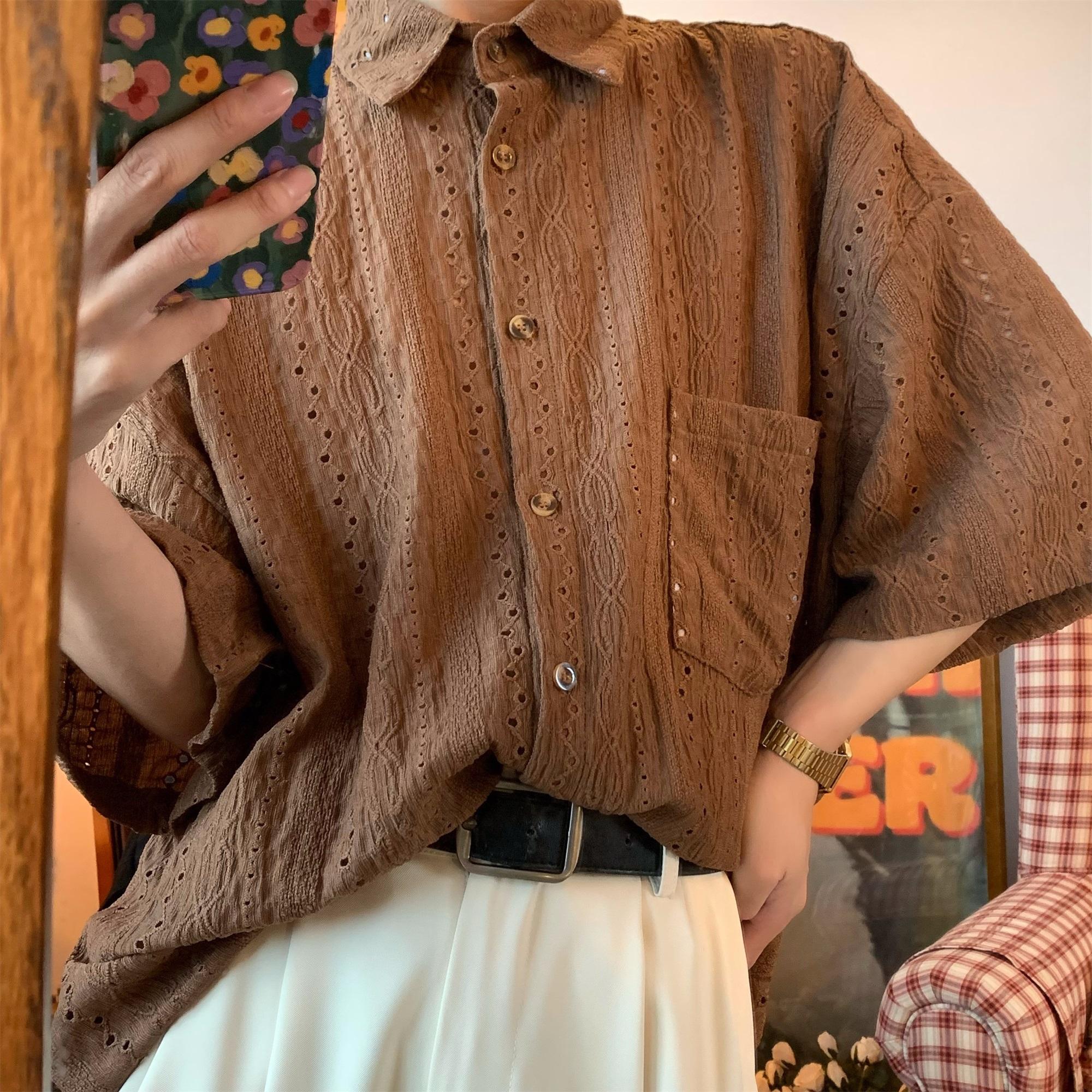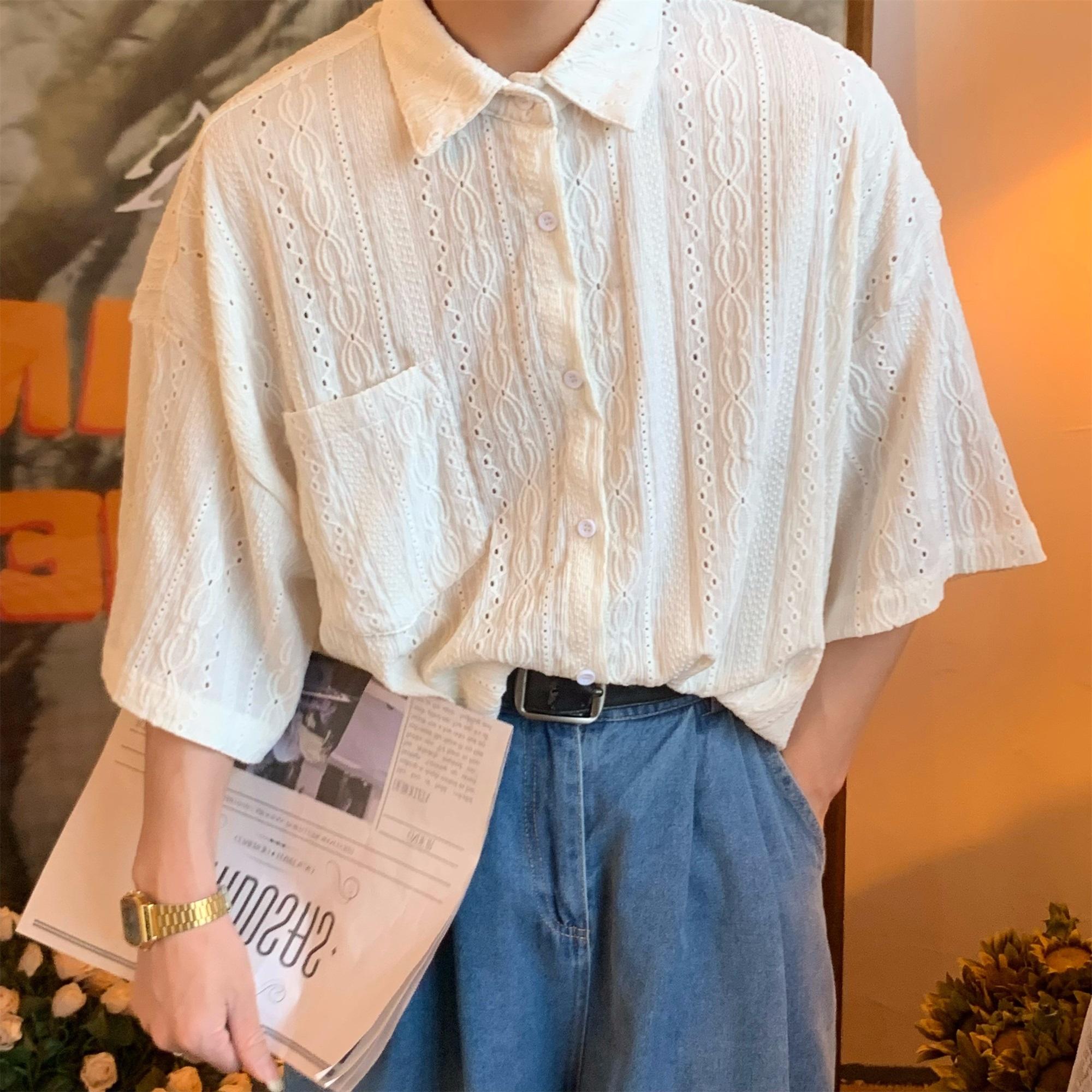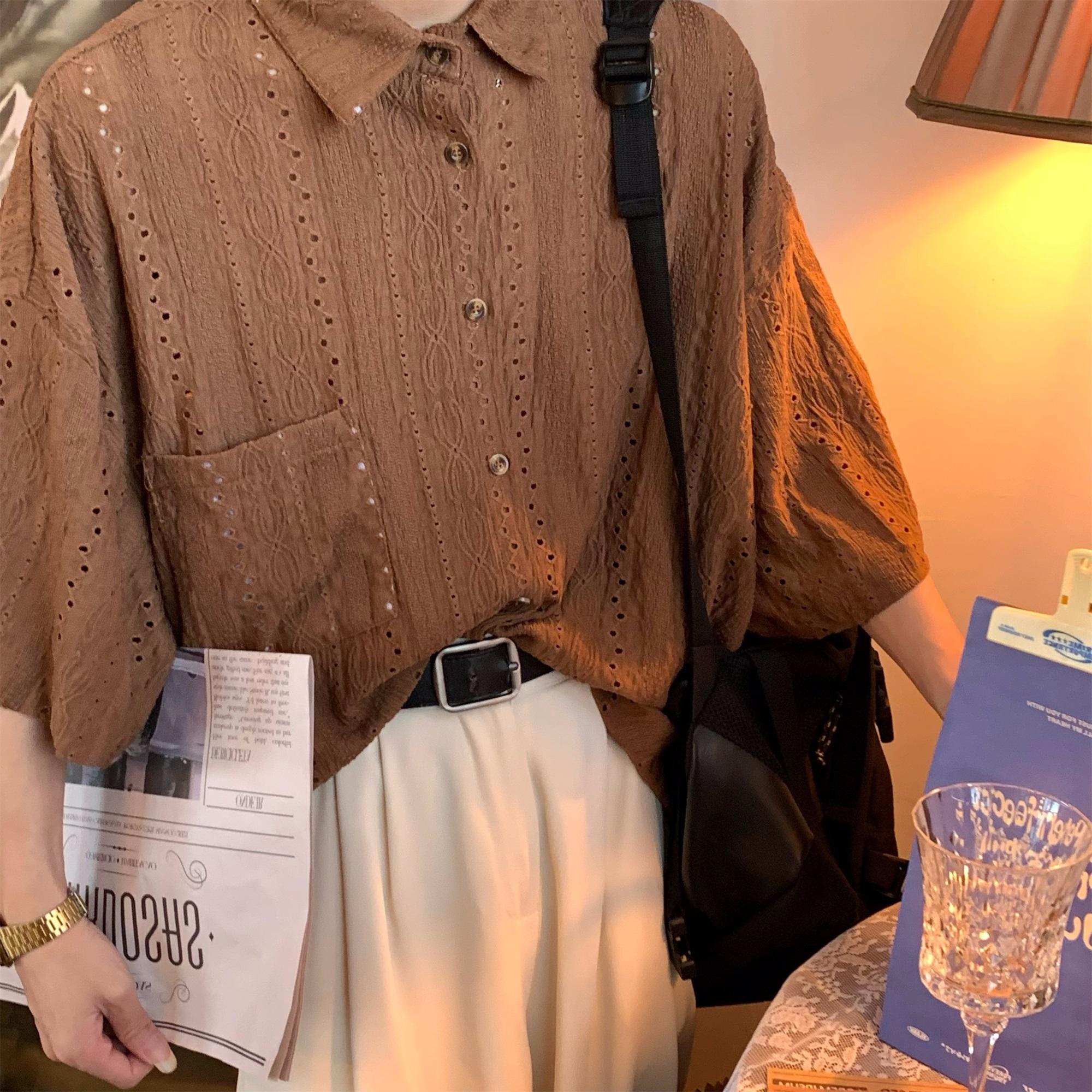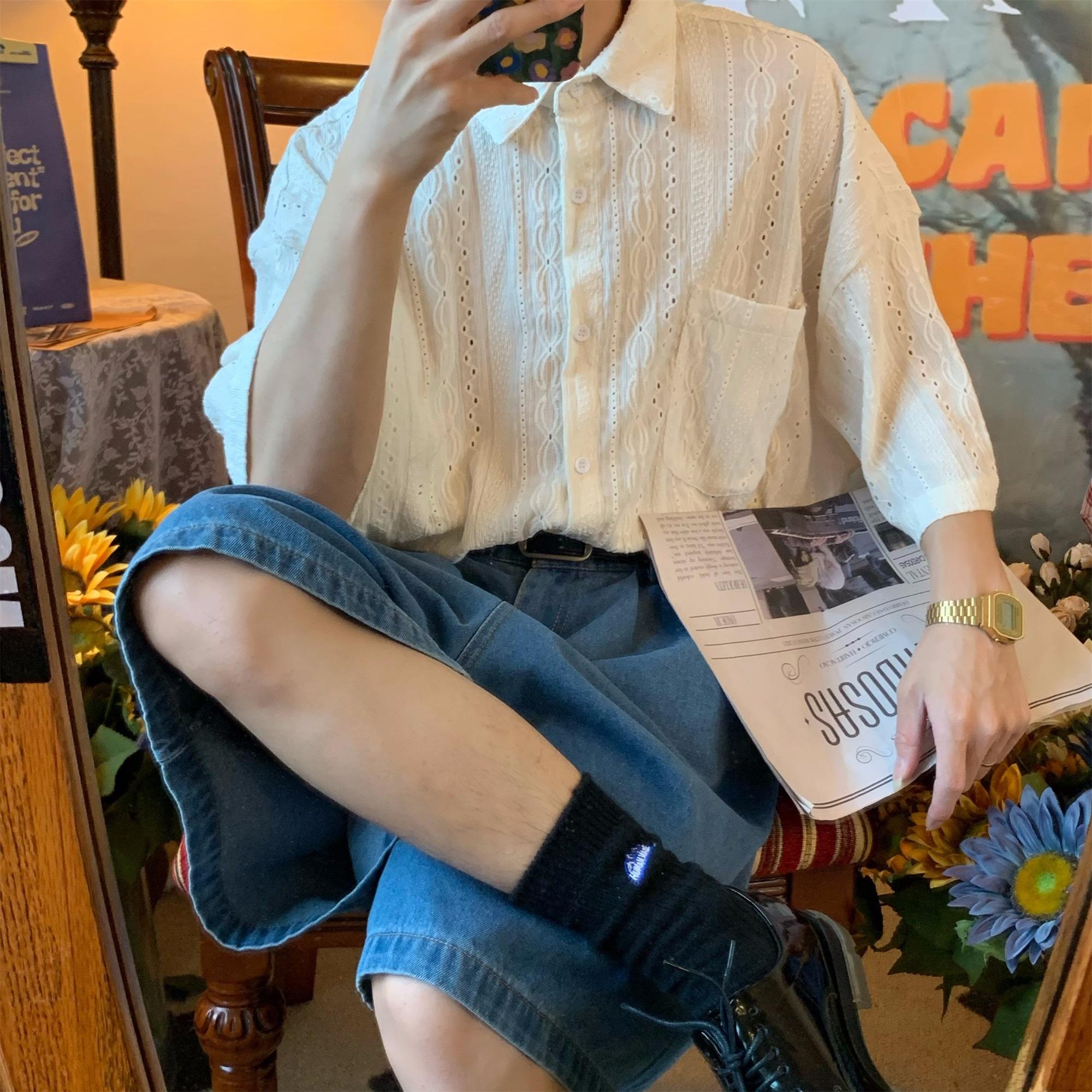 Camisa de manga corta hueca estilo japonés retro simple para hombre, diseño fino de verano, estilo neutro, perezoso y moderno.