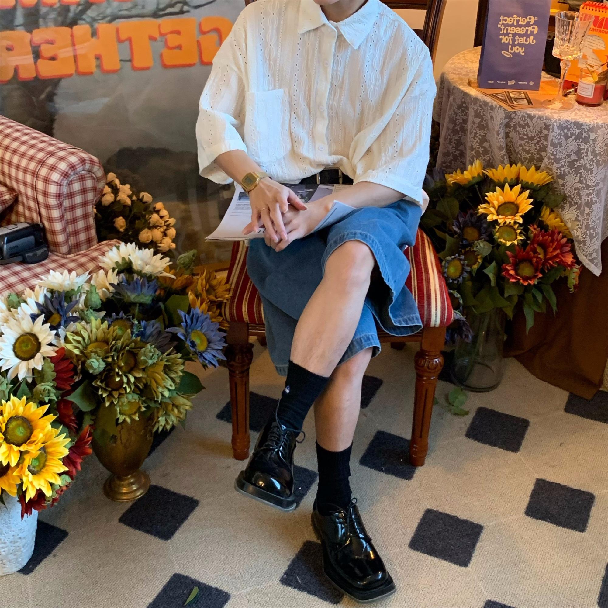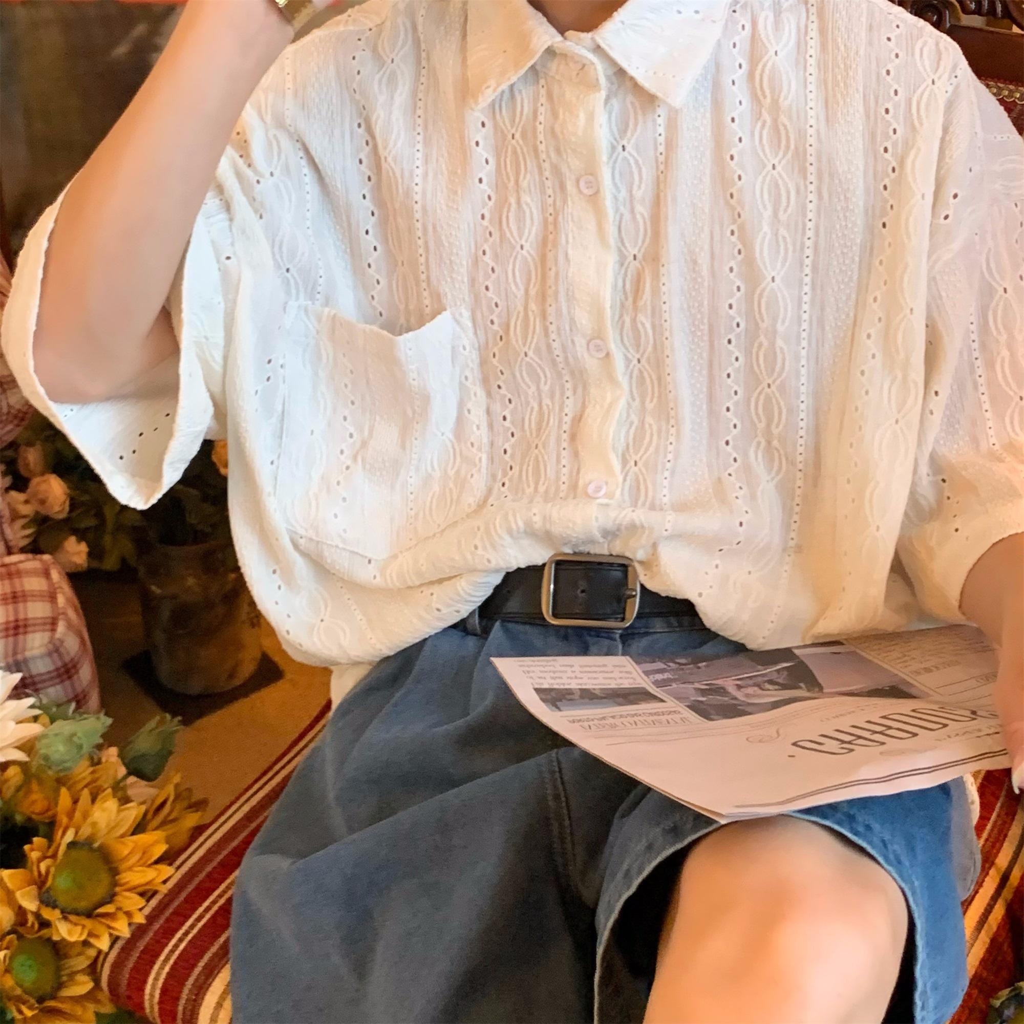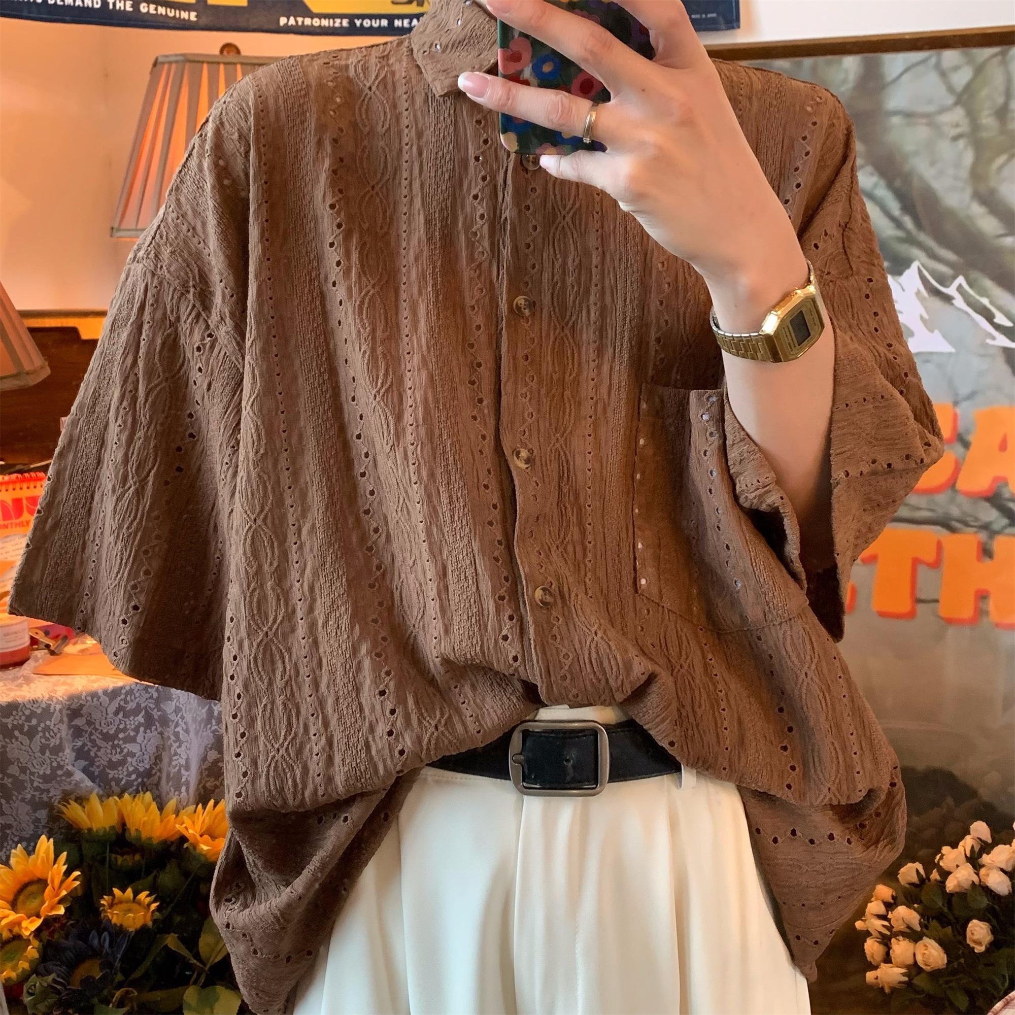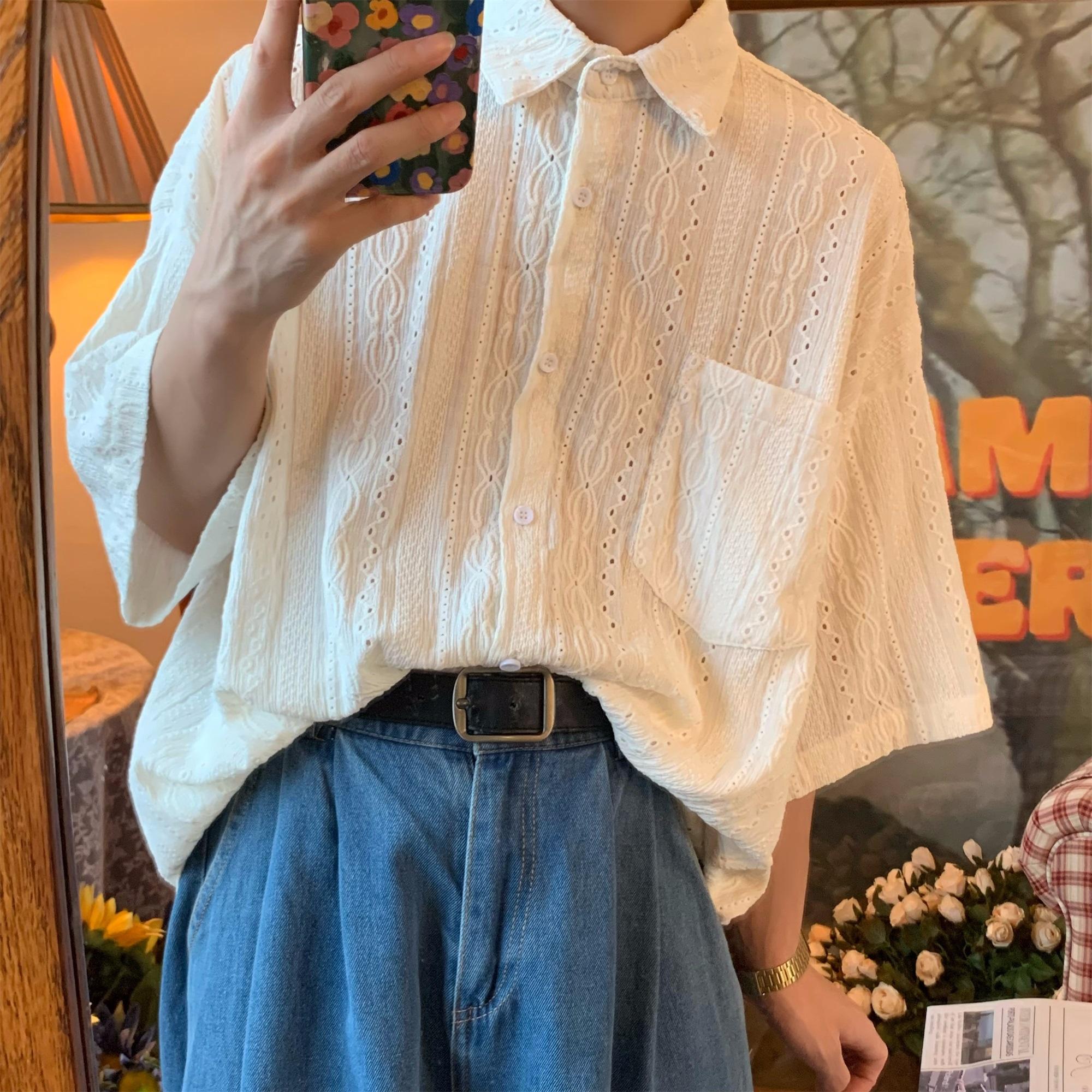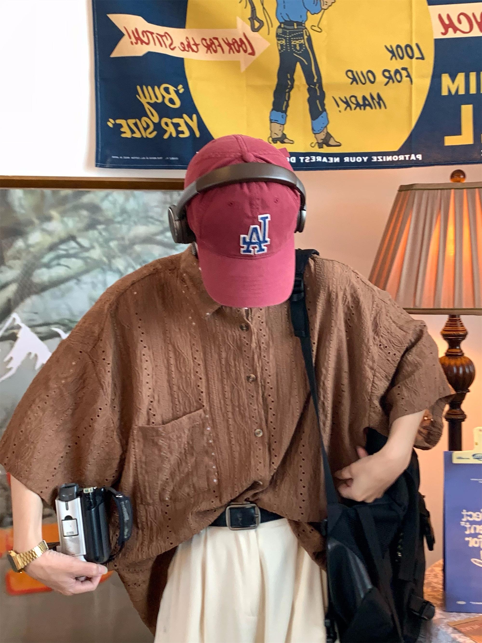 Camisa de manga corta hueca estilo japonés retro simple para hombre, diseño fino de verano, estilo neutro, perezoso y moderno.