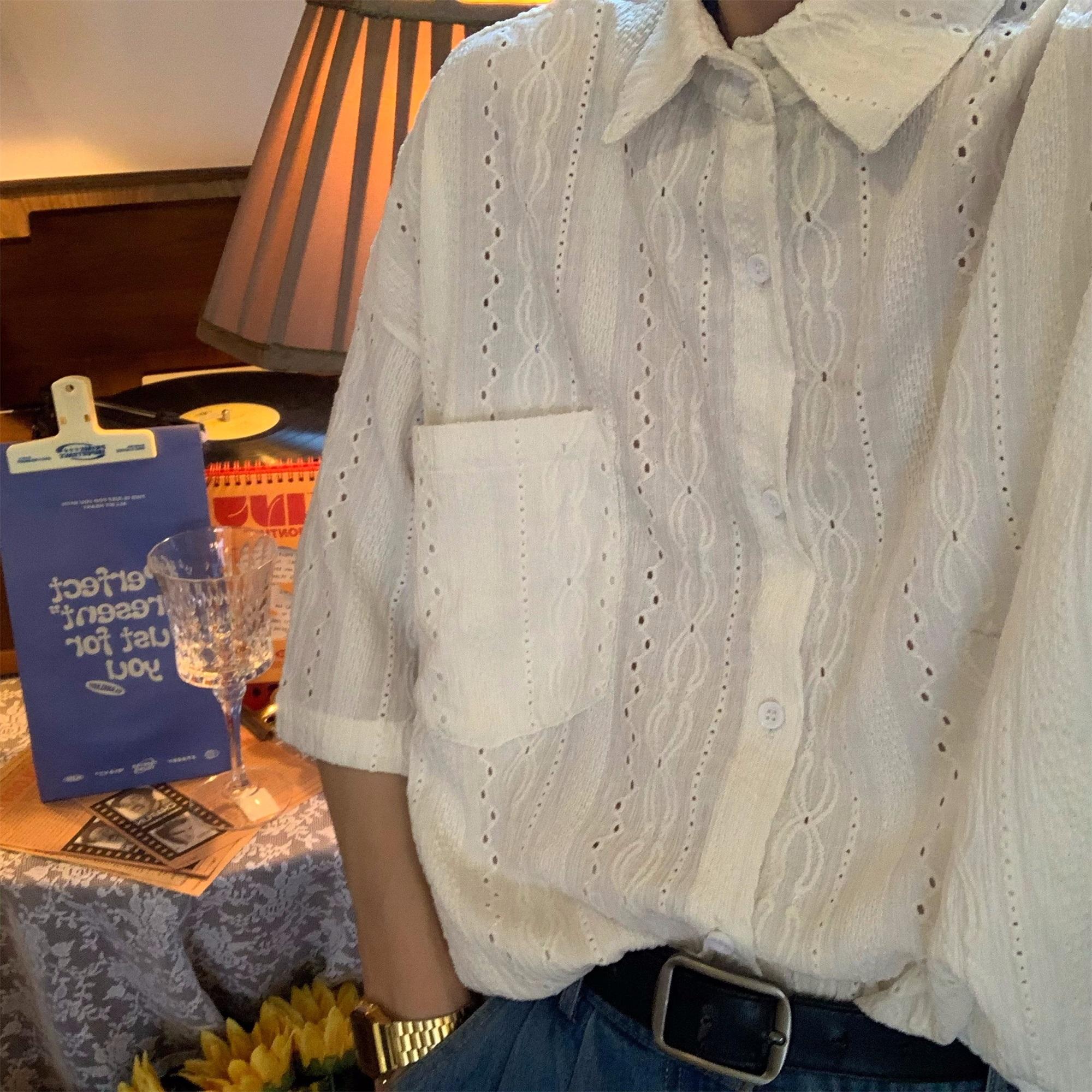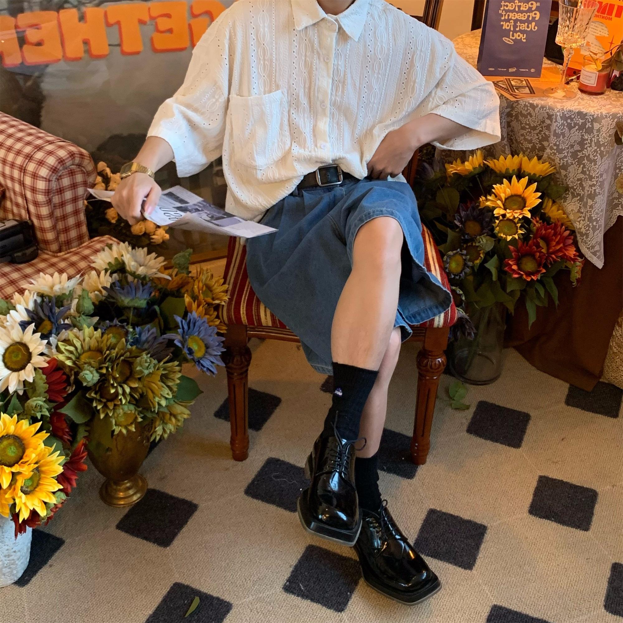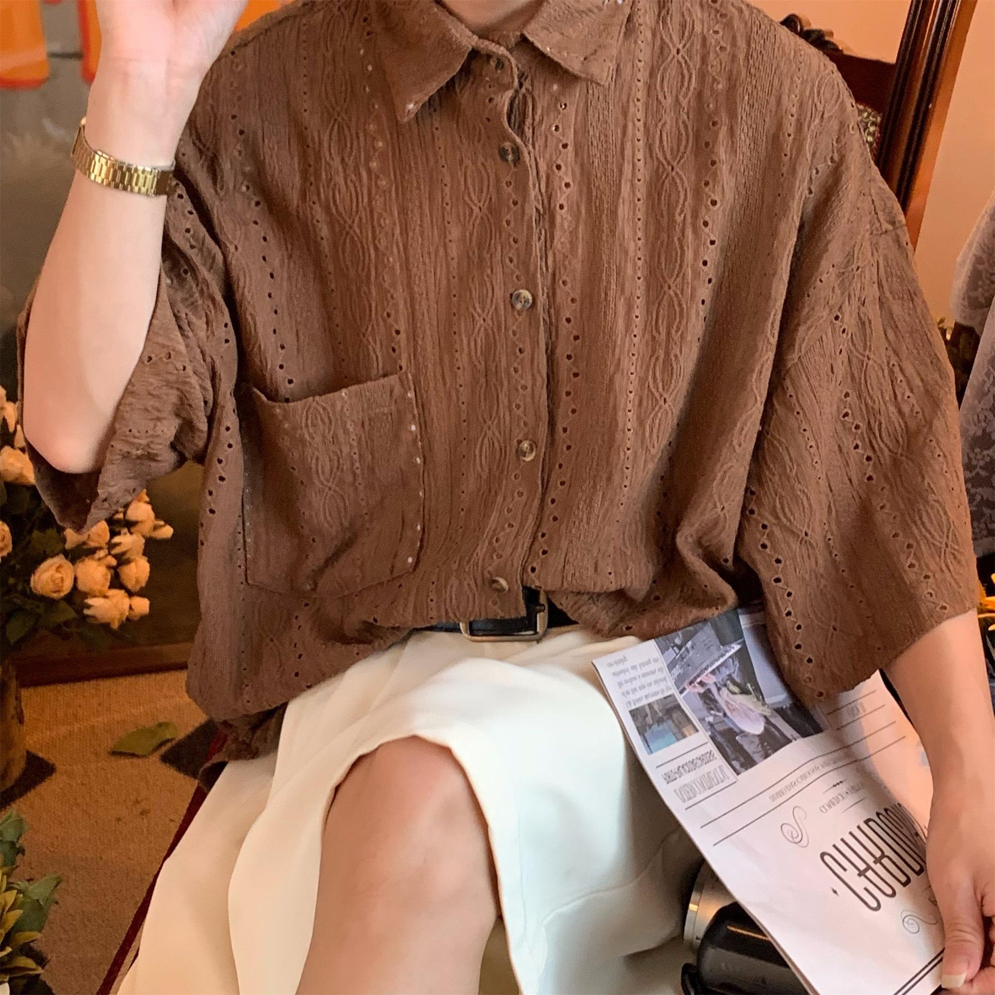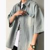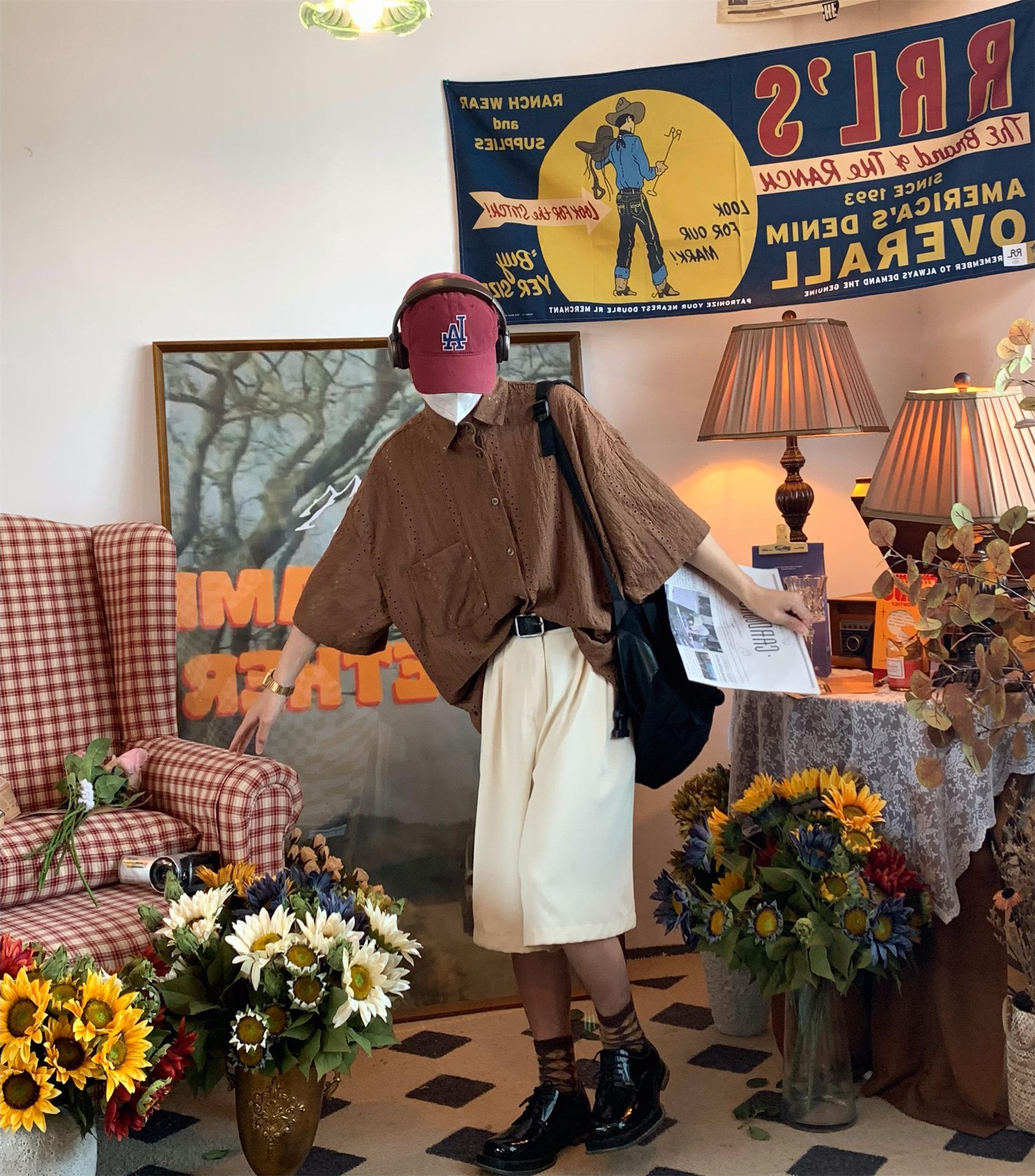 Camisa de manga corta hueca estilo japonés retro simple para hombre, diseño fino de verano, estilo neutro, perezoso y moderno.