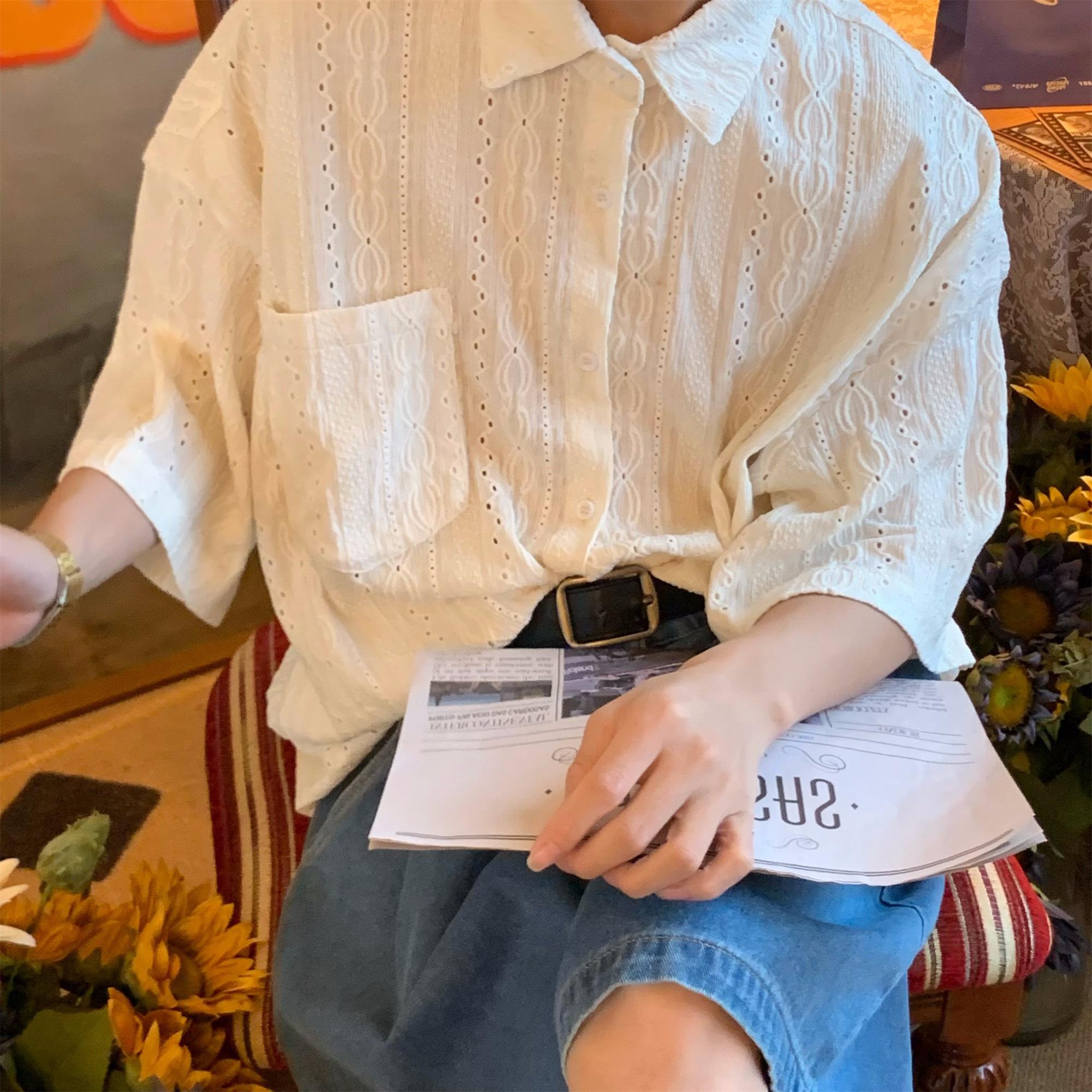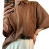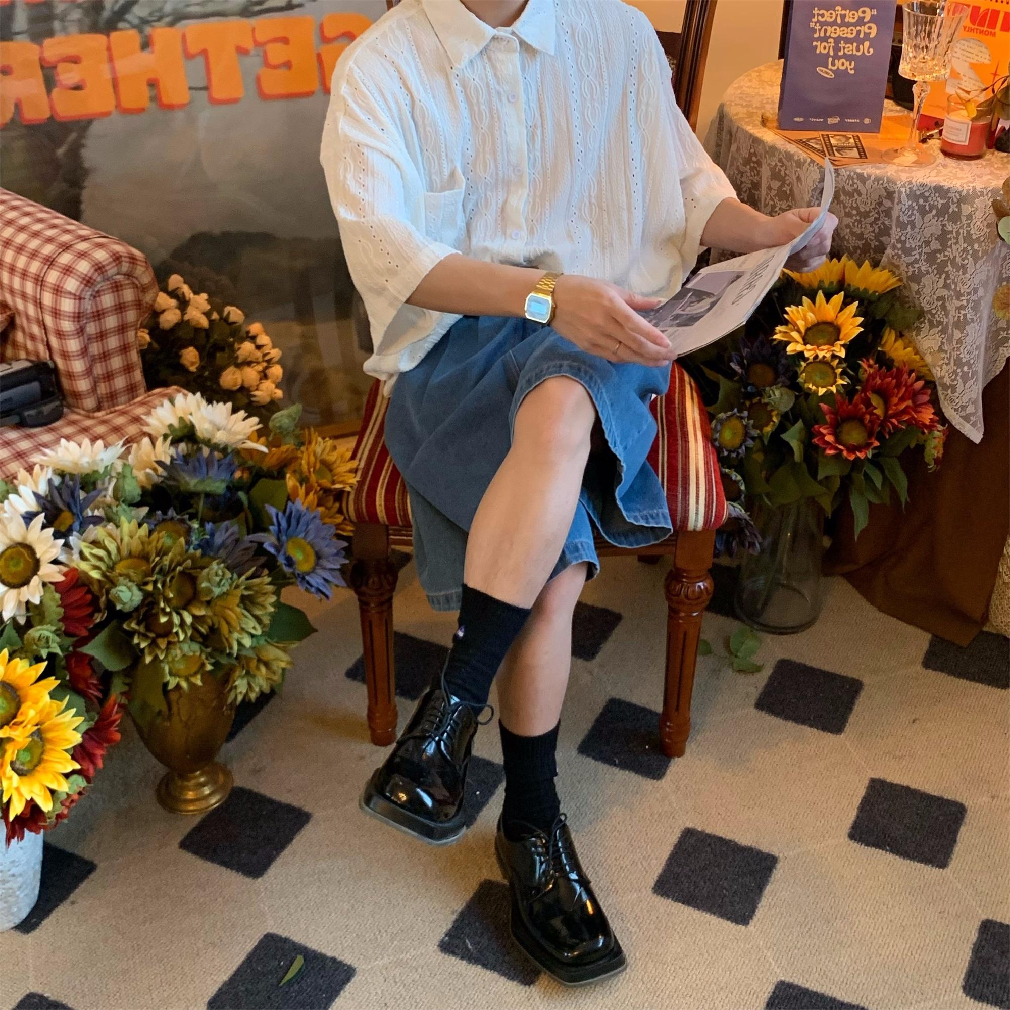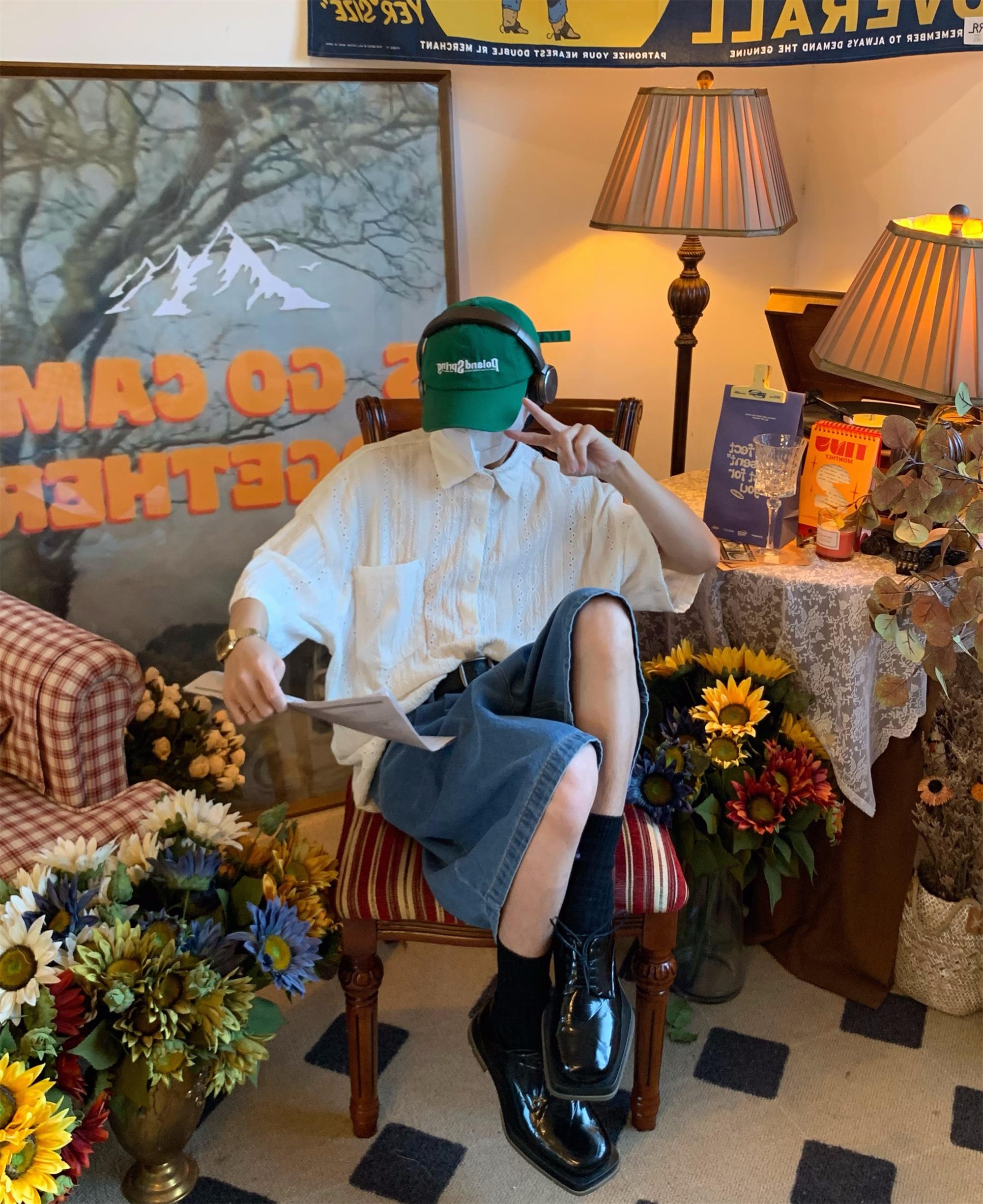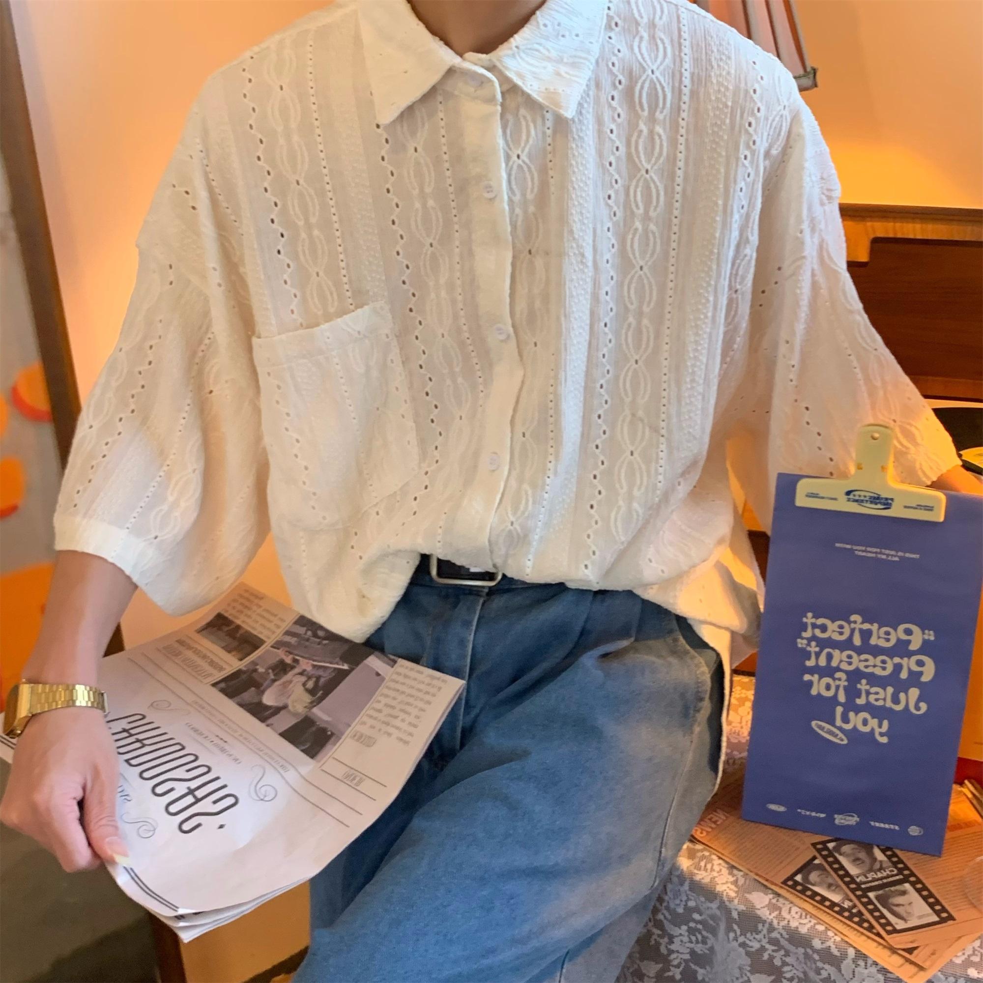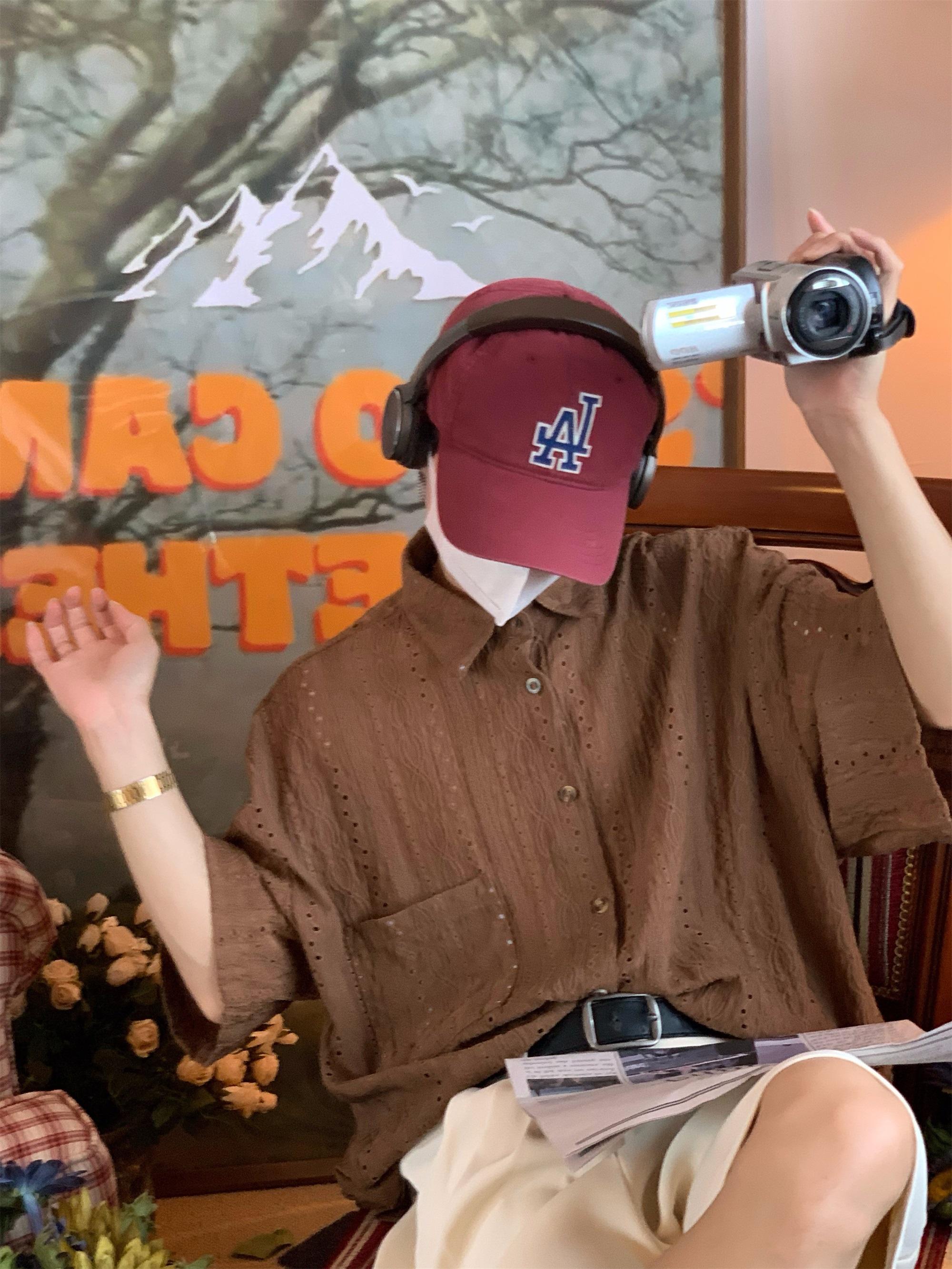 Camisa de manga corta hueca estilo japonés retro simple para hombre, diseño fino de verano, estilo neutro, perezoso y moderno.