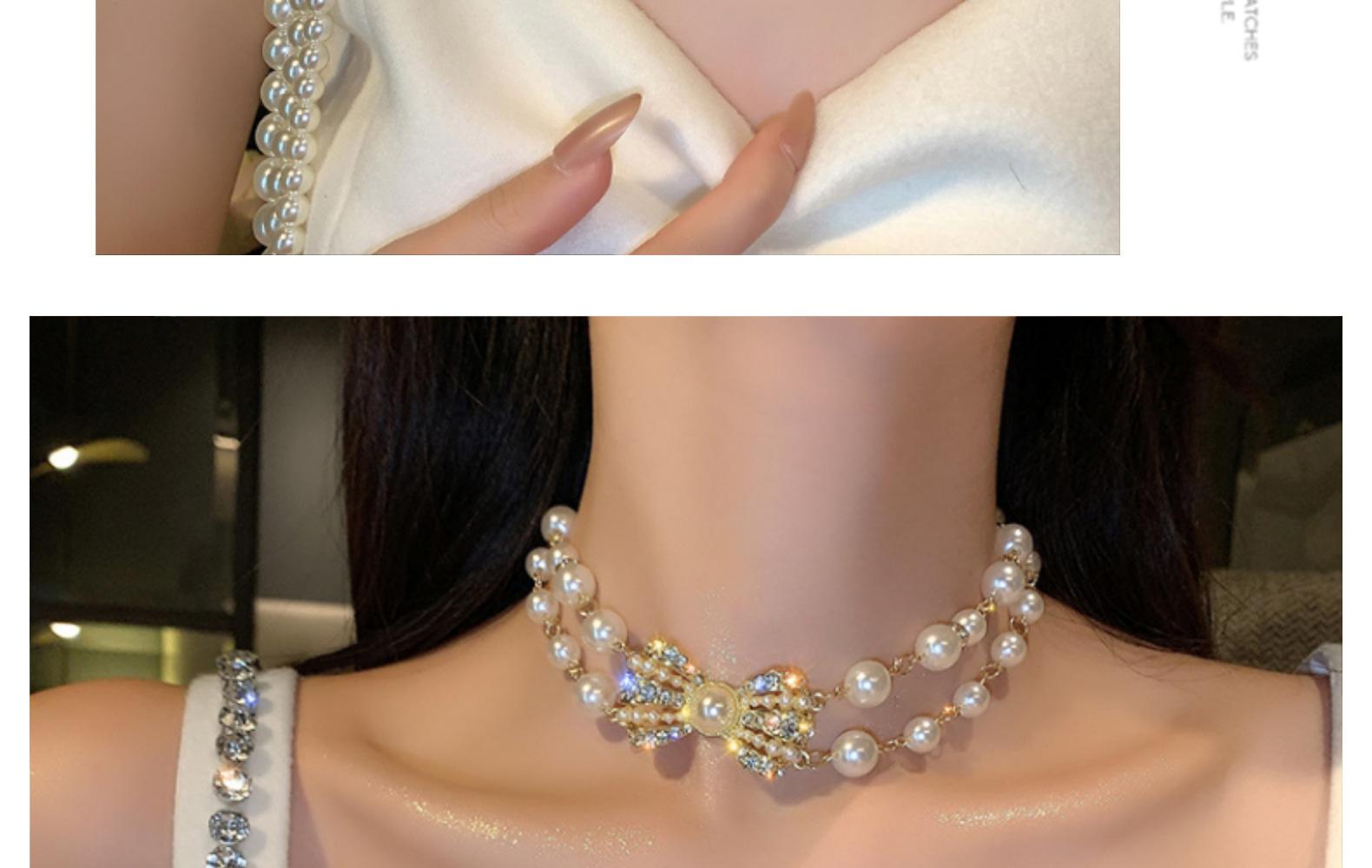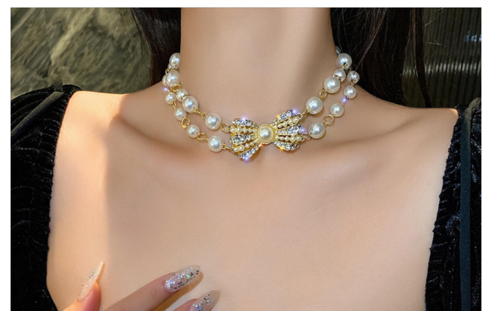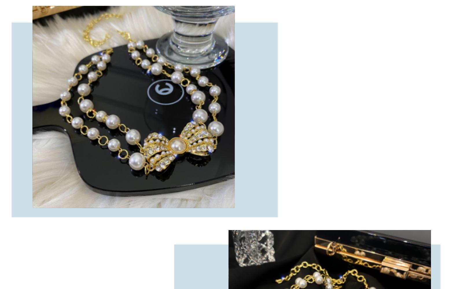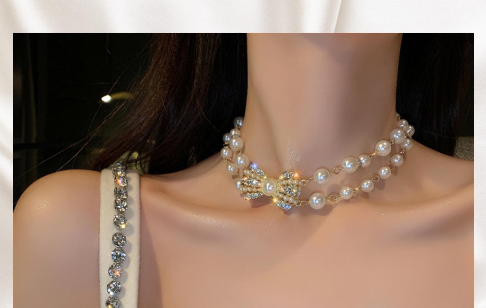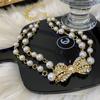 Collar de cadena de clavícula con lazo de diamantes y perlas de doble capa, diseño de moda retro europeo y americano, elegante y ligero de lujo con diseño de celebridades de Internet.