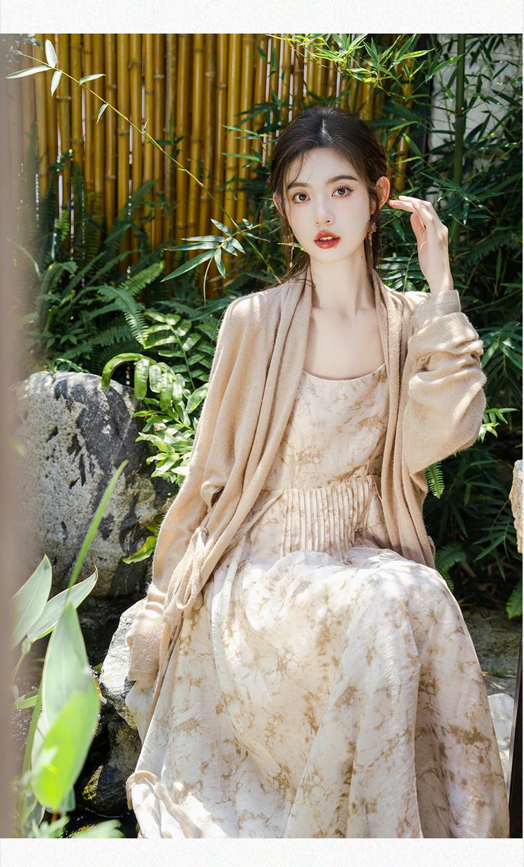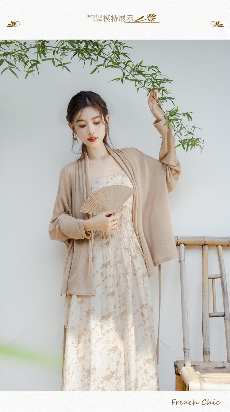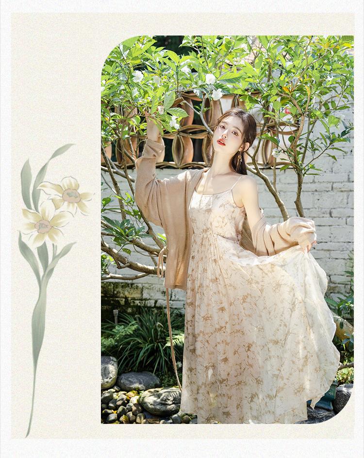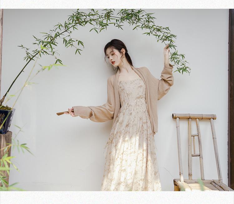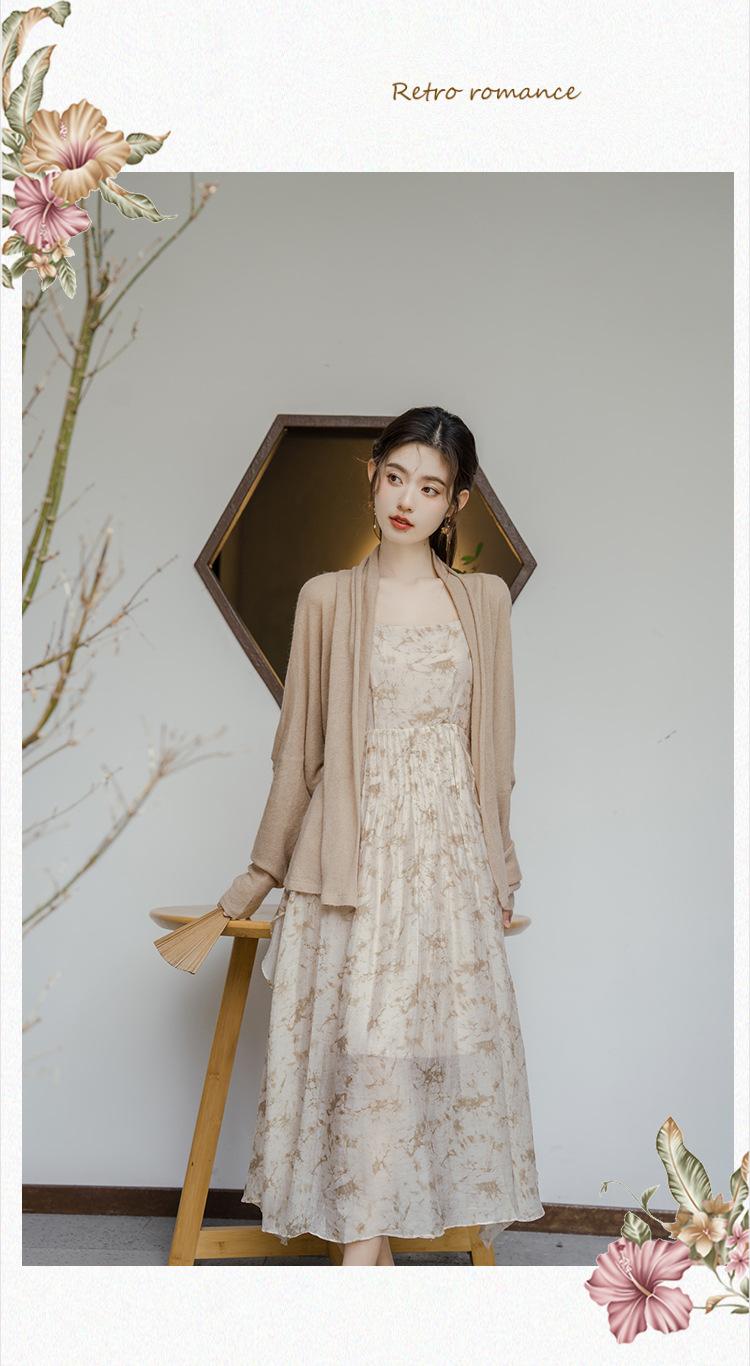 Foto Real de Cárdigan de Suéter de Punto + Vestido de Tirantes de Chifón Estampado y Teñido Primavera 2025 Nuevo Traje de Dos Piezas