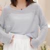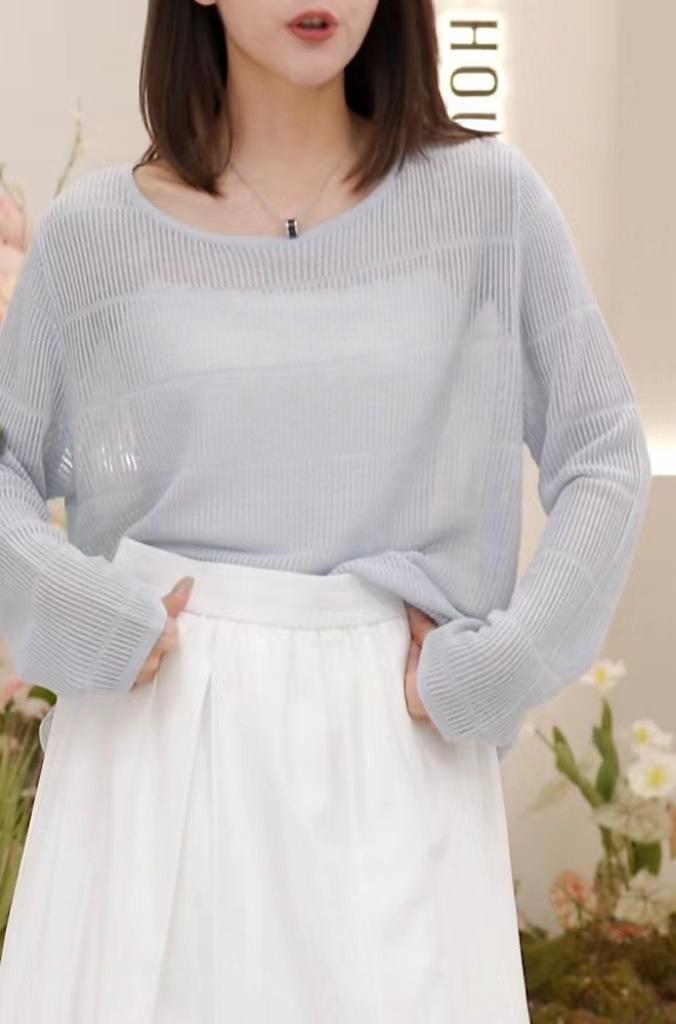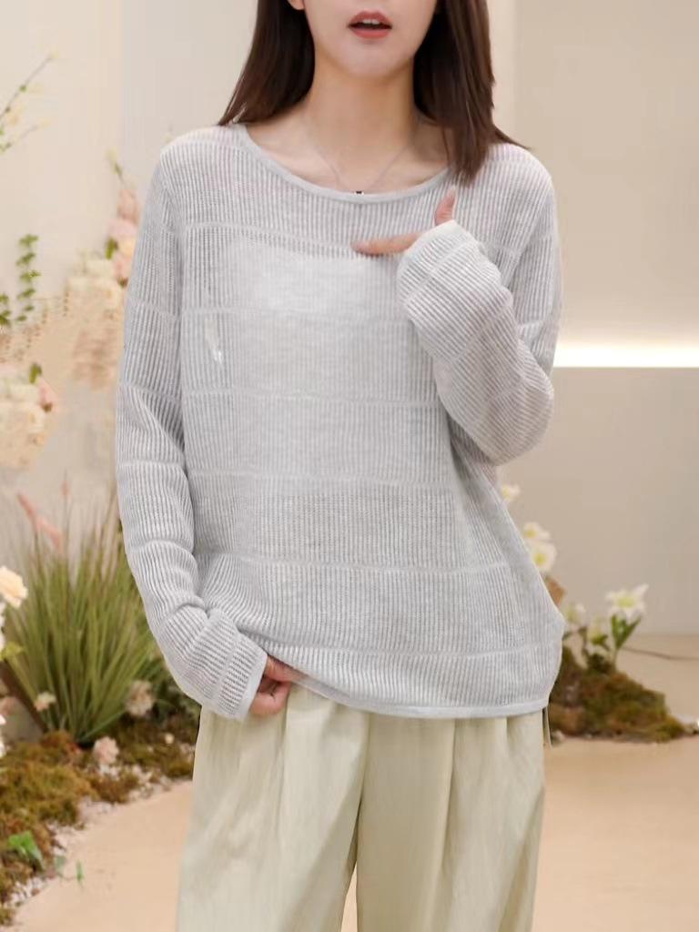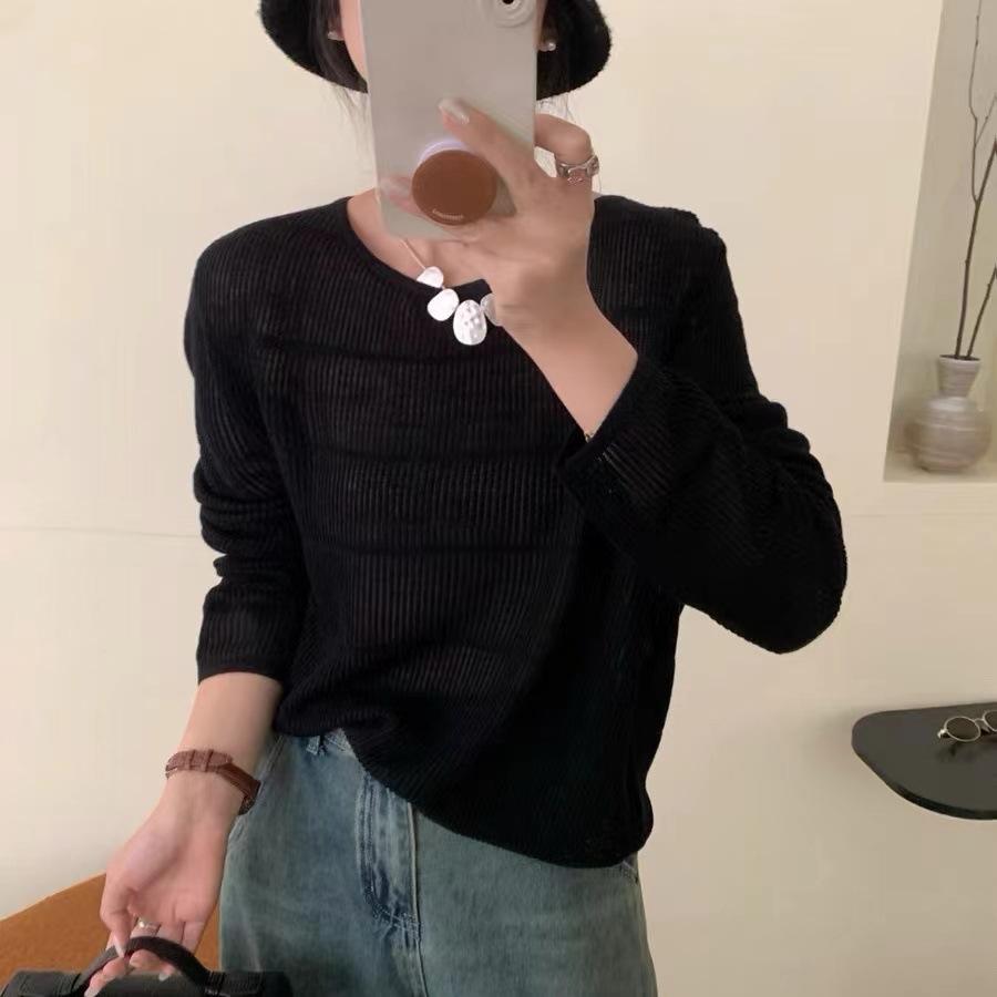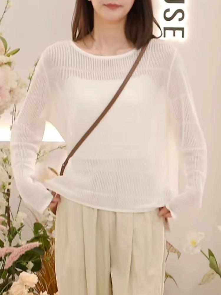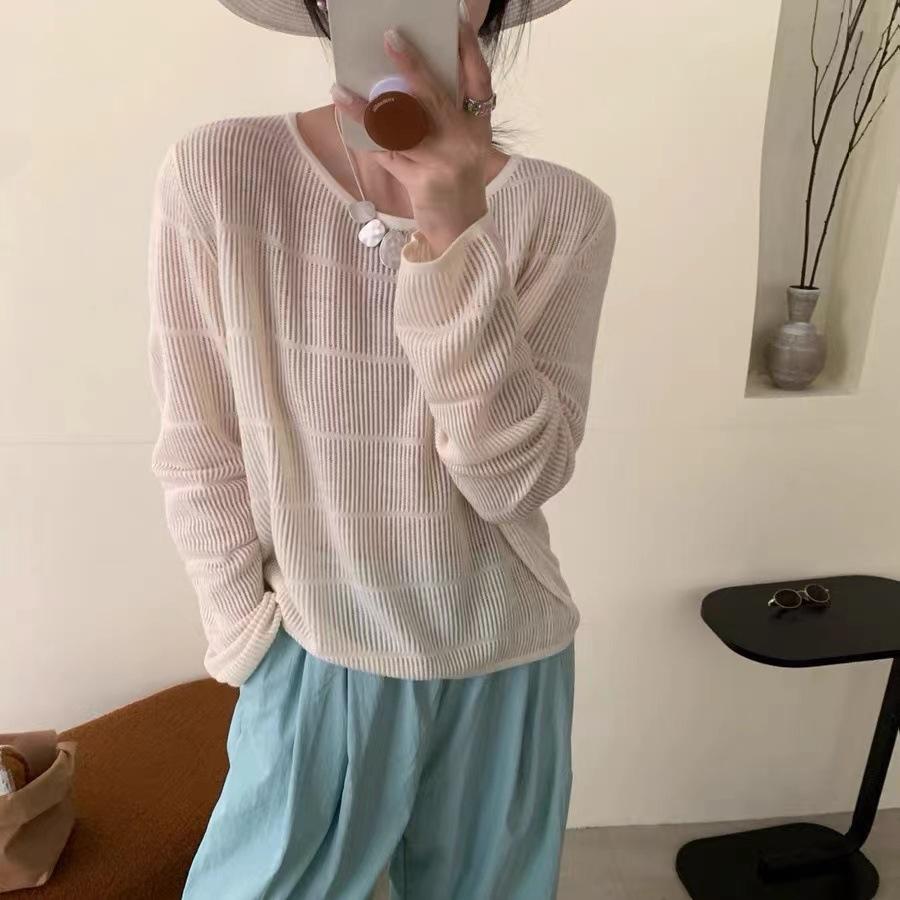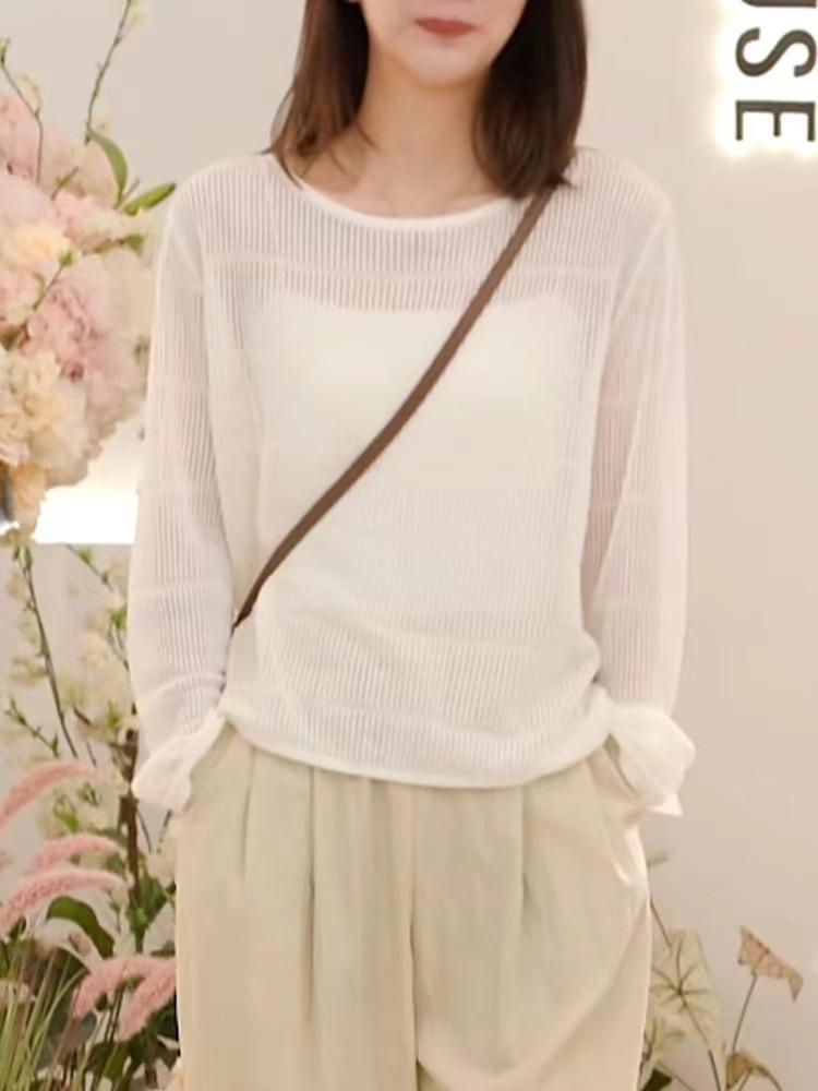 Blusa fina con protección solar, camiseta de manga larga para mujer, elegante, de moda, estilo relajado, color sólido, top fino de verano con huecos.