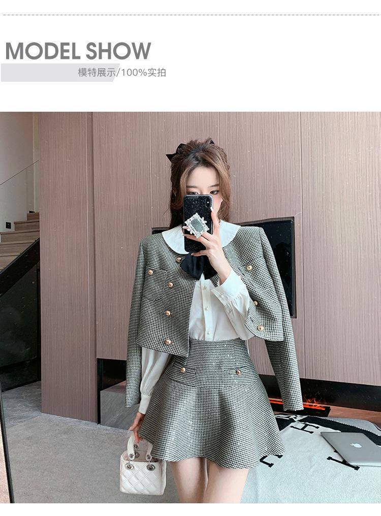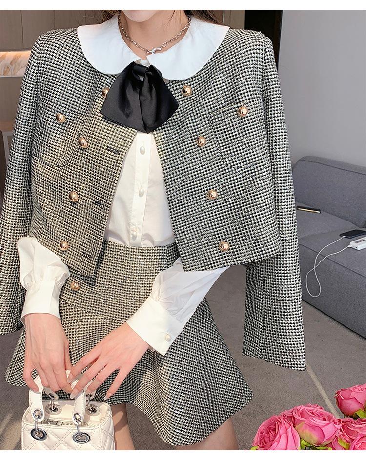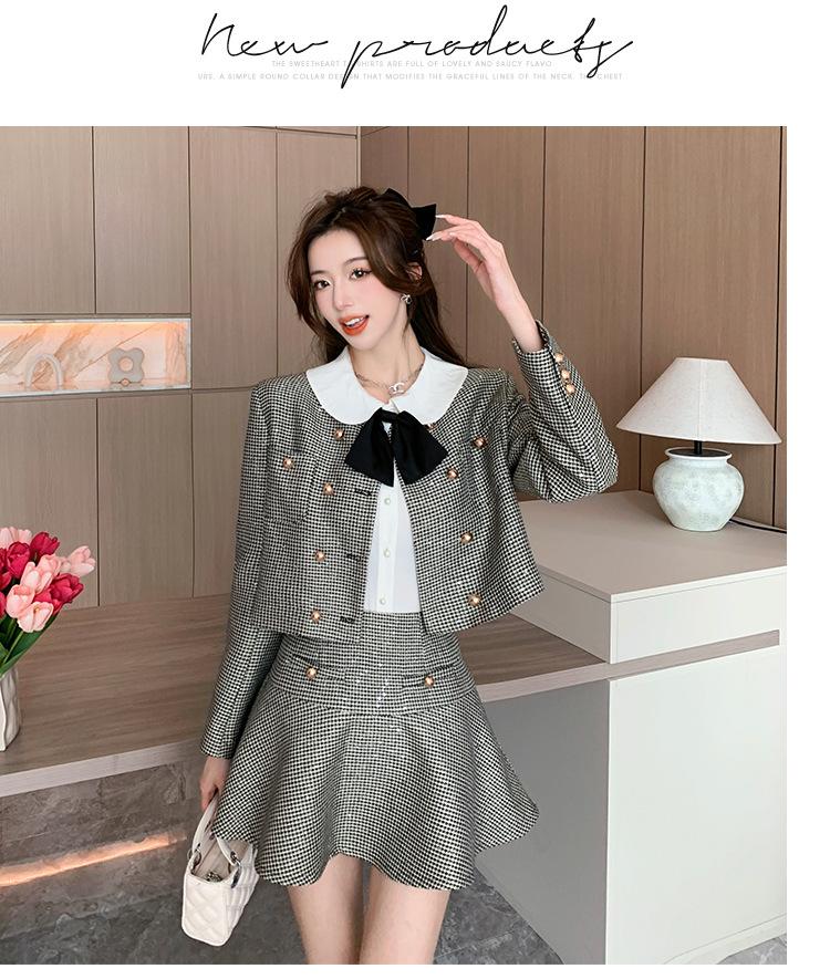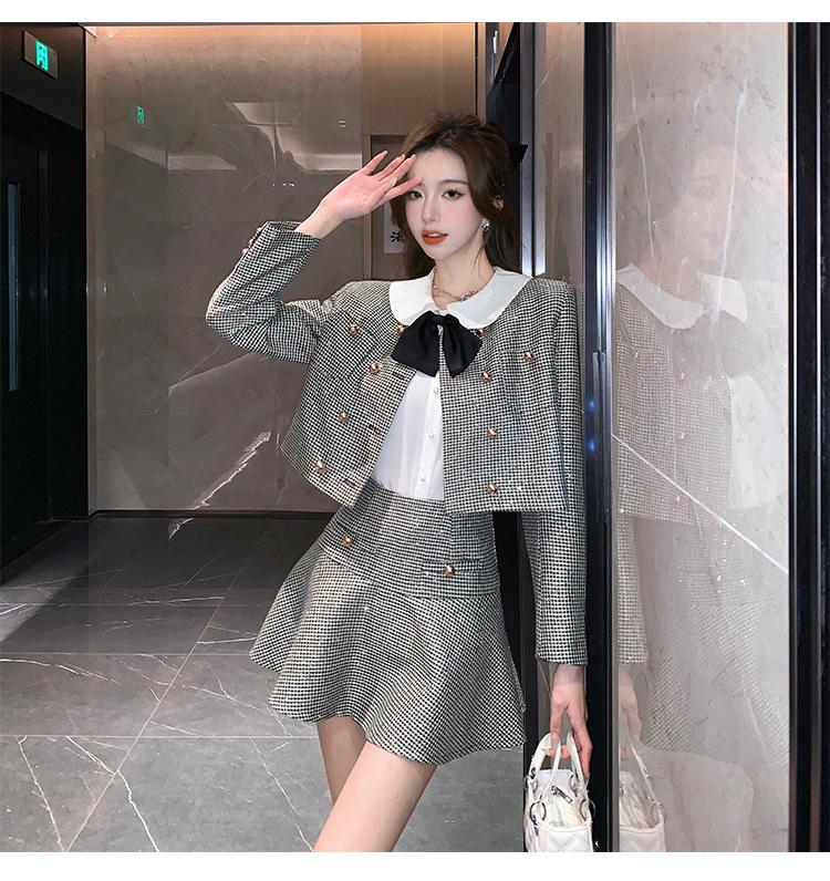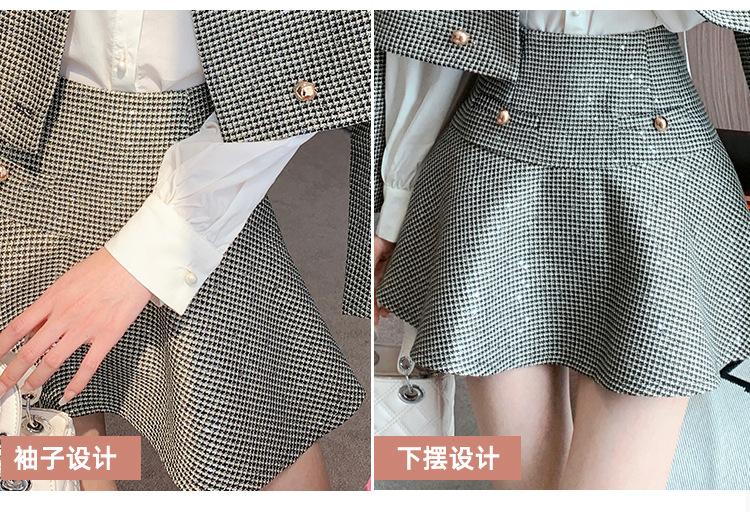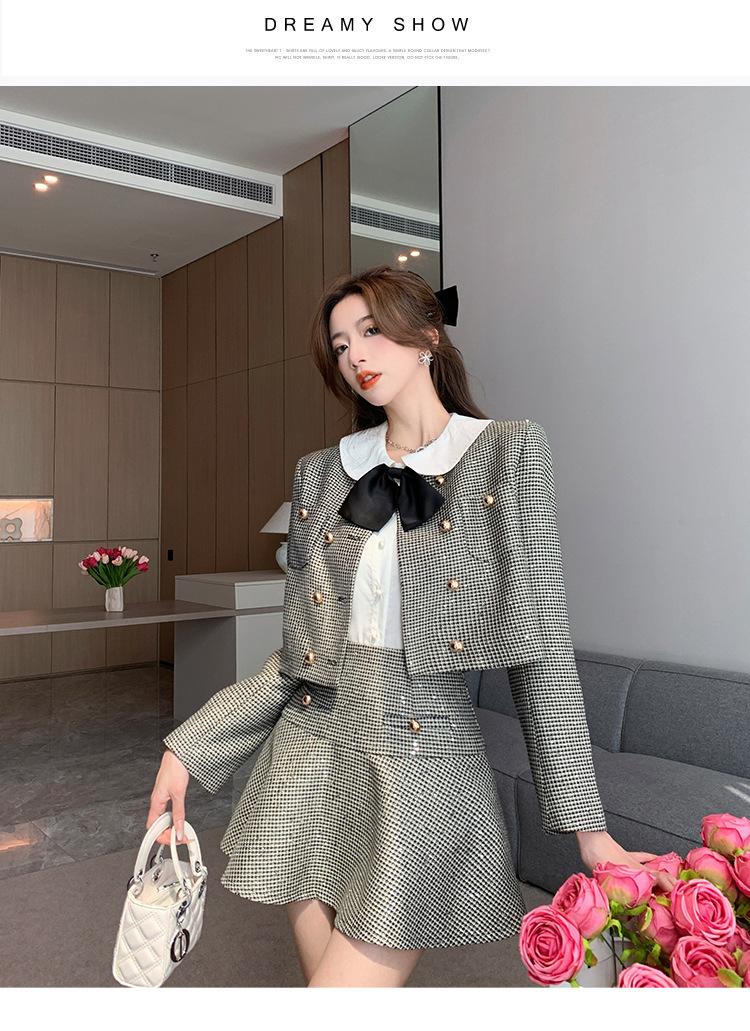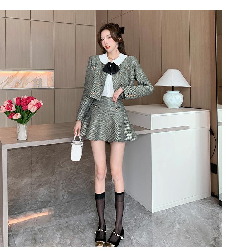 Foto real 2025 en stock temperamento socialité lentejuelas cuadros pequeño viento fragante abrigo primavera y otoño falda línea A conjunto de dos piezas