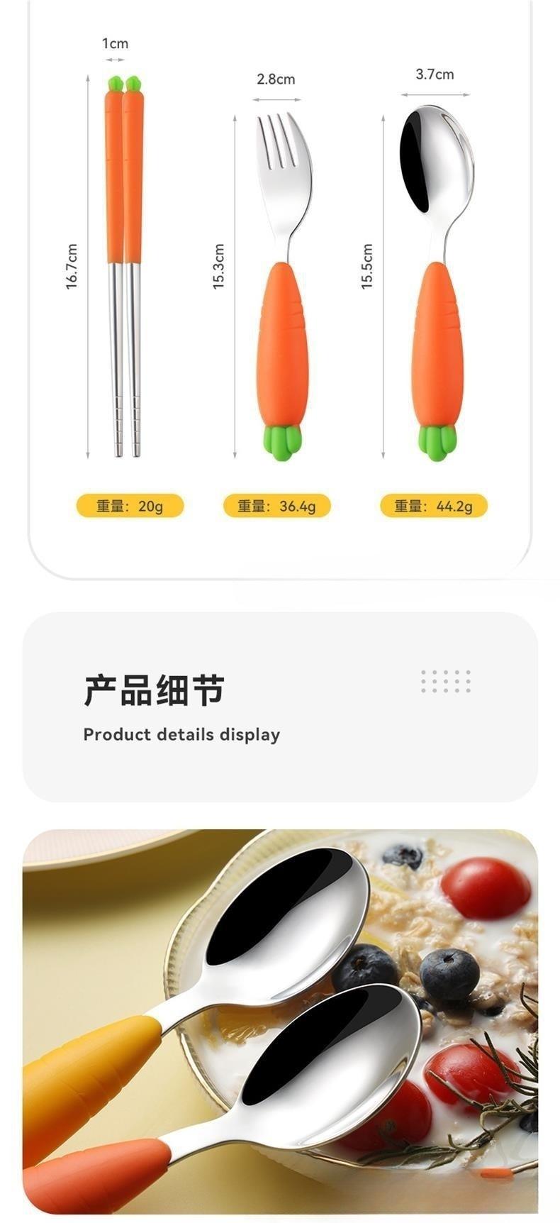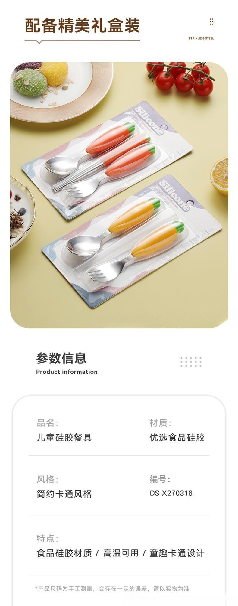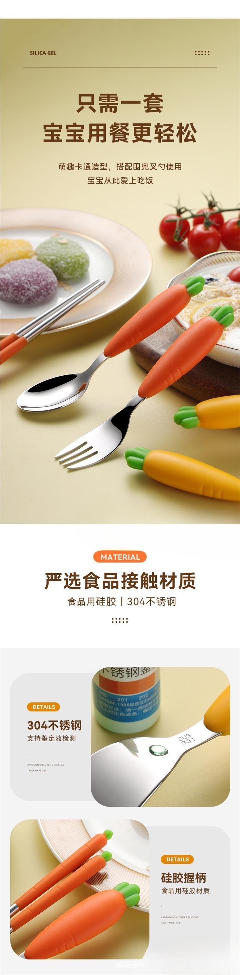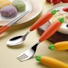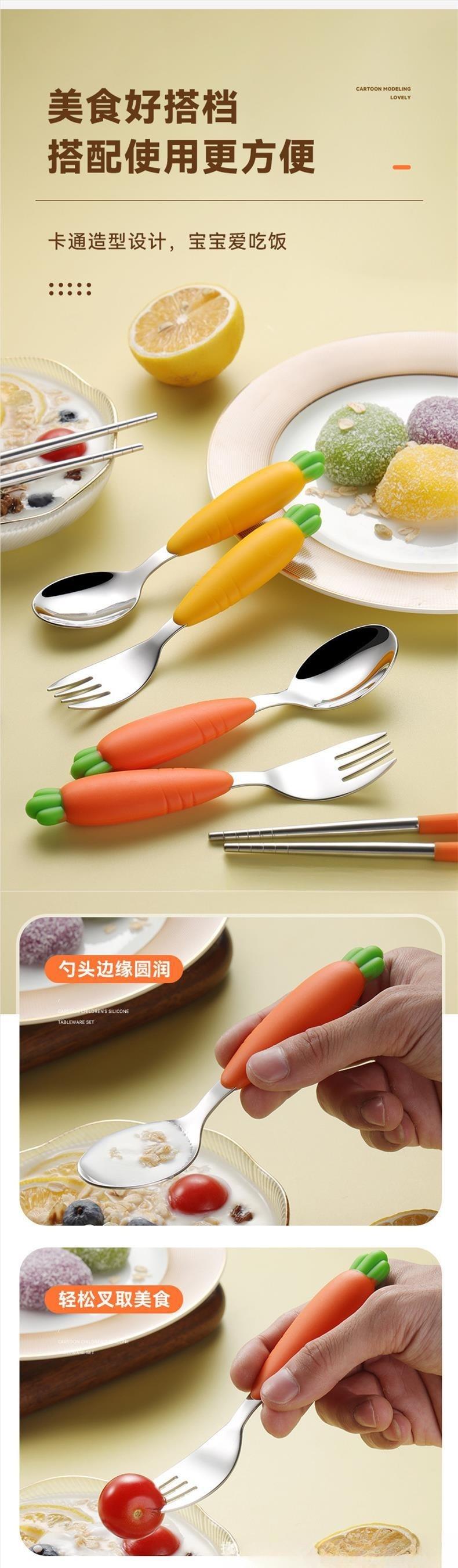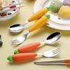 Cuchara y Tenedor de Mesa con Mango de Zanahoria de Silicona Juego de Vajilla para Niños Acero Inoxidable 304 Complemento Alimenticio Cuchara y Tenedor para Bebé