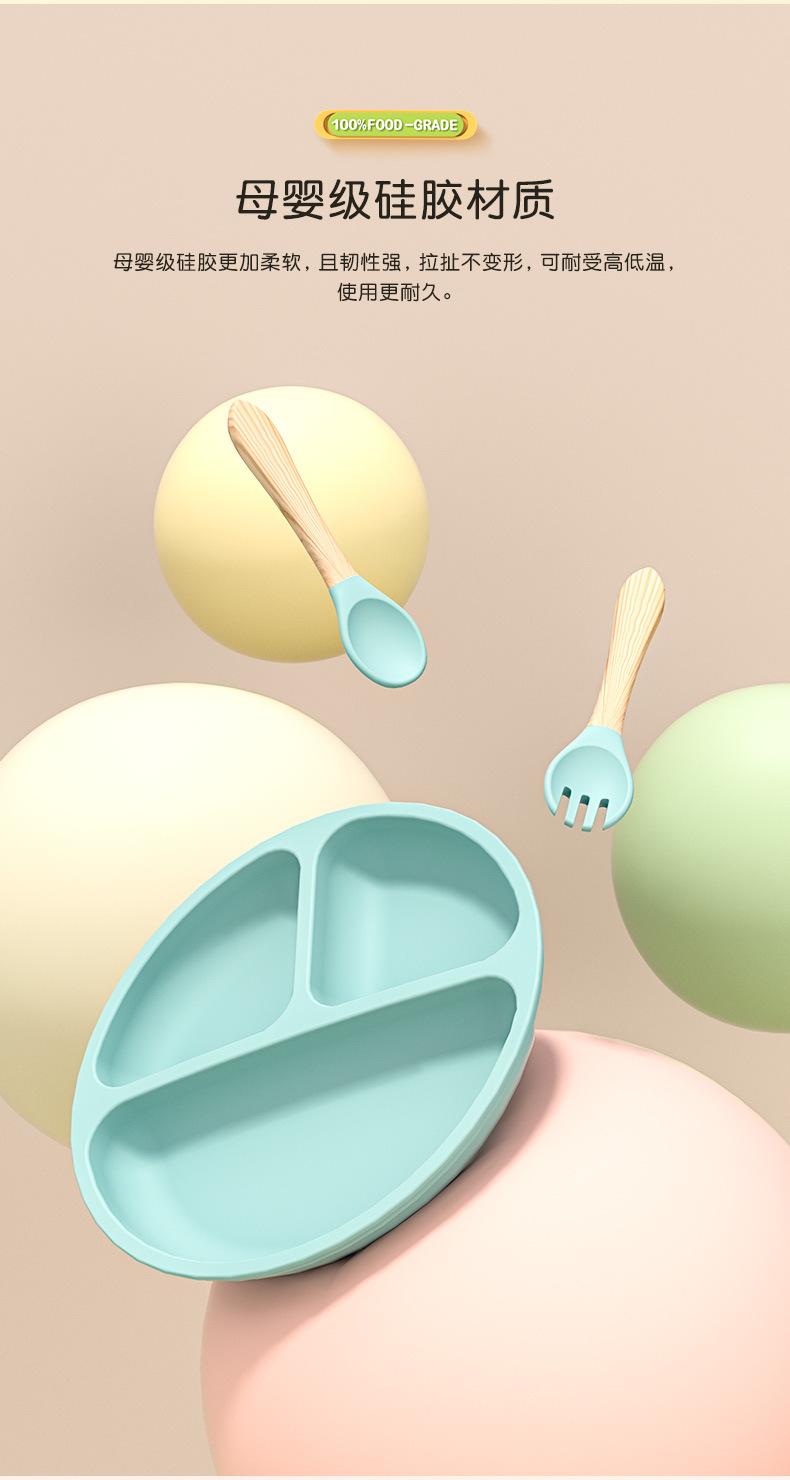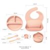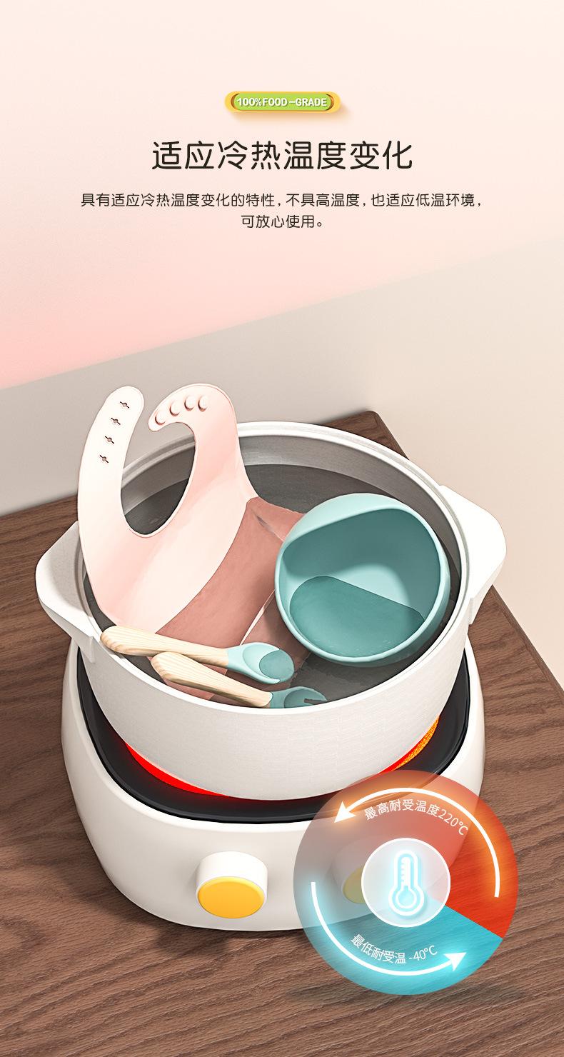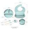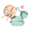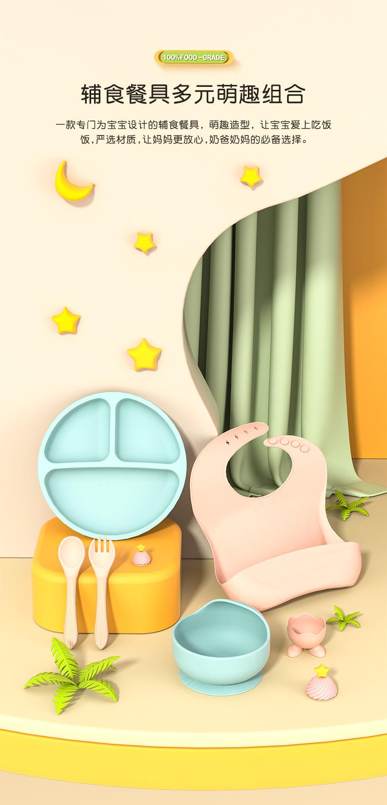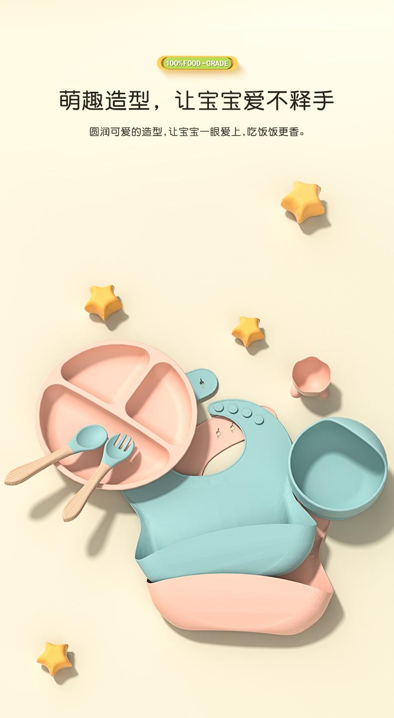 Plato de cena de silicona complementario para niños de gran venta transfronteriza, tazón, tenedor, cuchara, babero, juego de vajilla de cinco piezas, plato de cena resistente a caídas, plato de succión