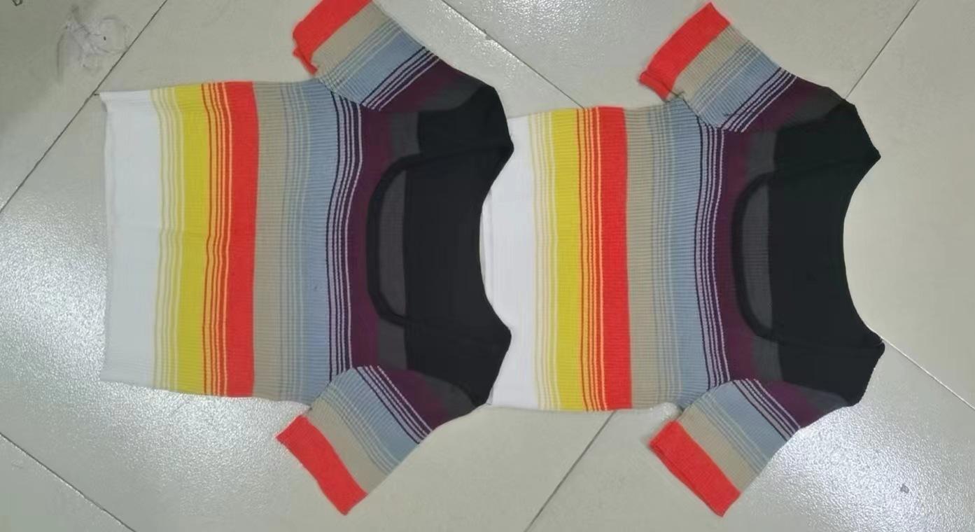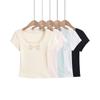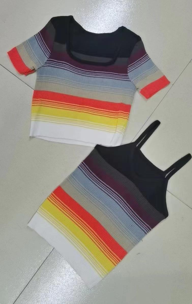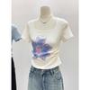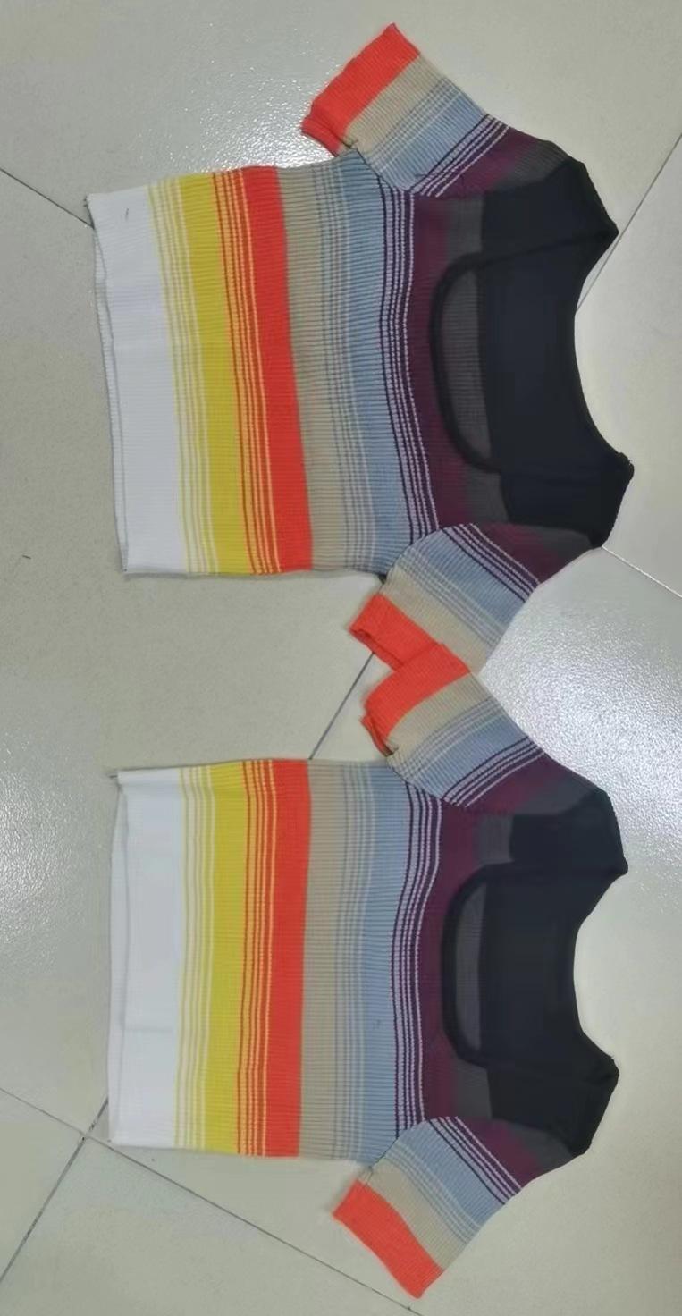 Camiseta de manga corta con degradado para mujer, diseño de nicho, estilo 2023, estilo chic con hombros descubiertos, top corto de verano a la moda.