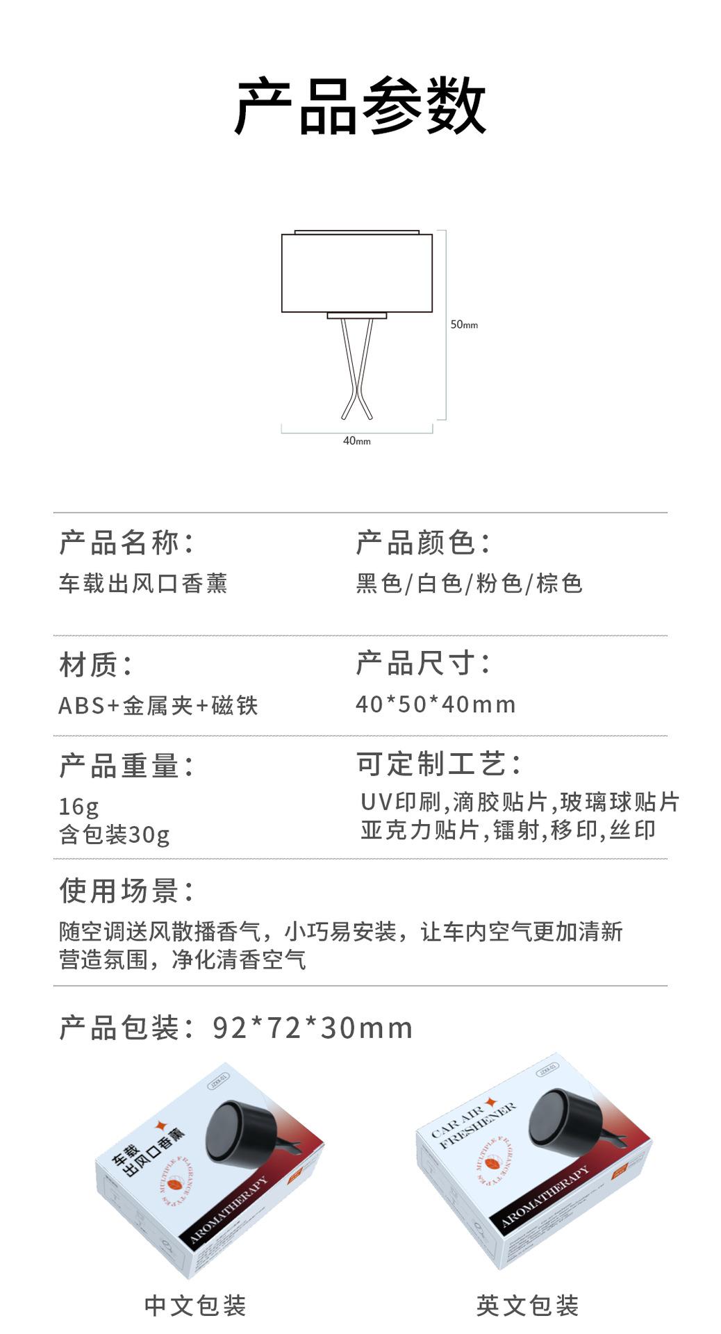 Características del producto: Nuevo difusor de aromaterapia para salida de aire de coche C001, novedoso diseño magnético, diseño de clip. El clip de la salida de aire no se cae fácilmente ni daña la salida de aire. Fácil de instalar y listo para usar después de desmontarlo. Compatible con salidas de aire de varios modelos, combina con diversos aromas, es moderno y práctico.Viene con:pieza en blancoPuedes usar el perfume que compraste por separado para verterlo y que lo absorba;Hay una variedad de aromas disponibles, y los extractos puros de plantas duran mucho tiempo para que tu coche esté libre de olores. El embalaje en chino e inglés te permite usarlo de muchas maneras, con ventajas de precio, y también puedes personalizar tu logotipo como regalo:Impresión UV, parche de pegamento, parche de bola de vidrio, parche acrílico, láser, tampografía, serigrafía¡Hecho con una variedad de artesanías! ¡Bienvenidos comercios electrónicos, comercio exterior y tiendas físicas de autos para consultar y colaborar!