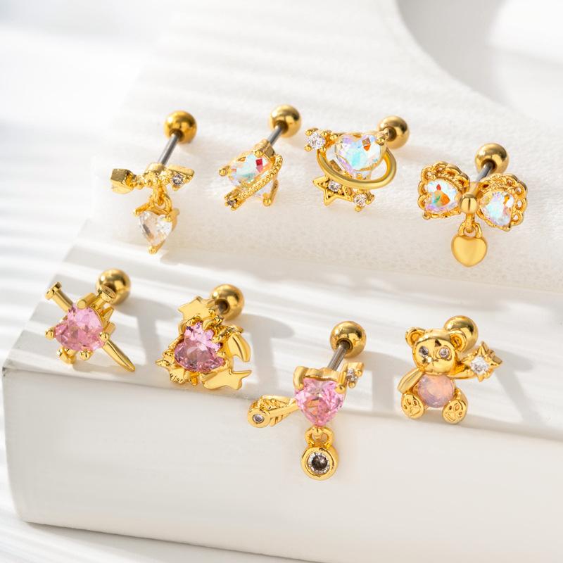 nombre del producto | Nuevo arete de cartílago de acero de titanio con barra delgada de rosca de oso lazo de amor de circonita con incrustaciones de cobre de Henson |