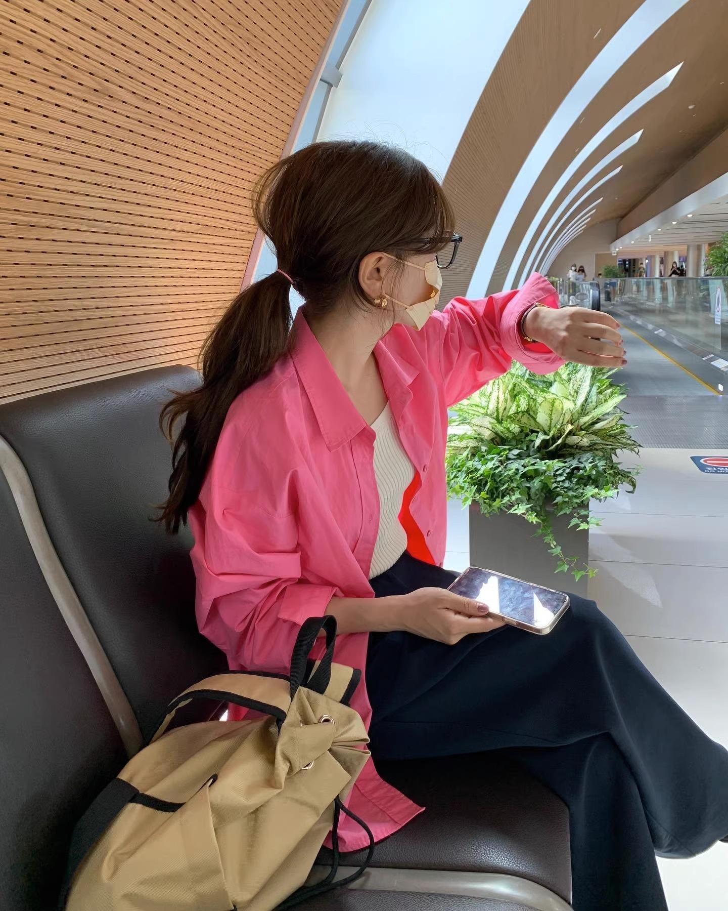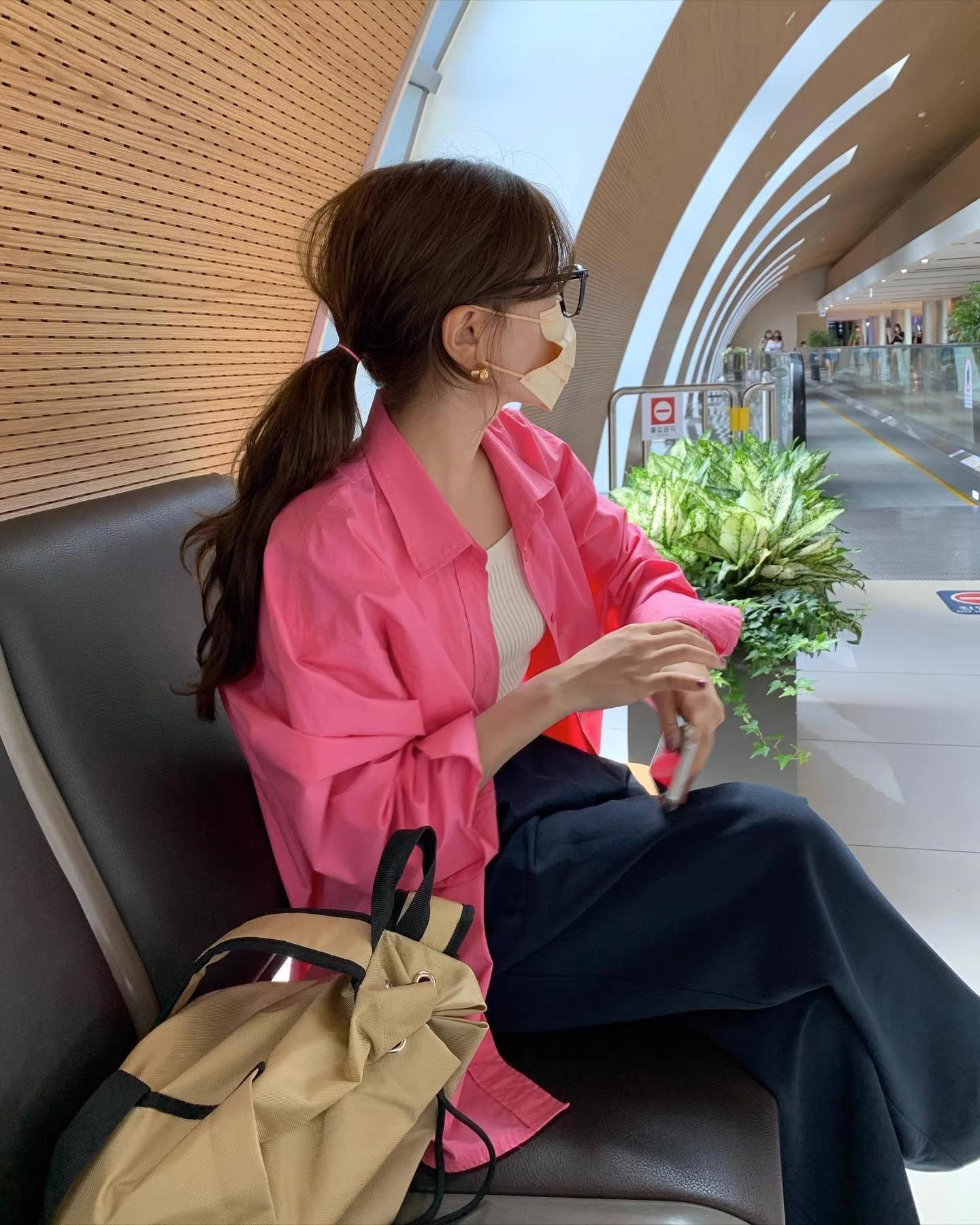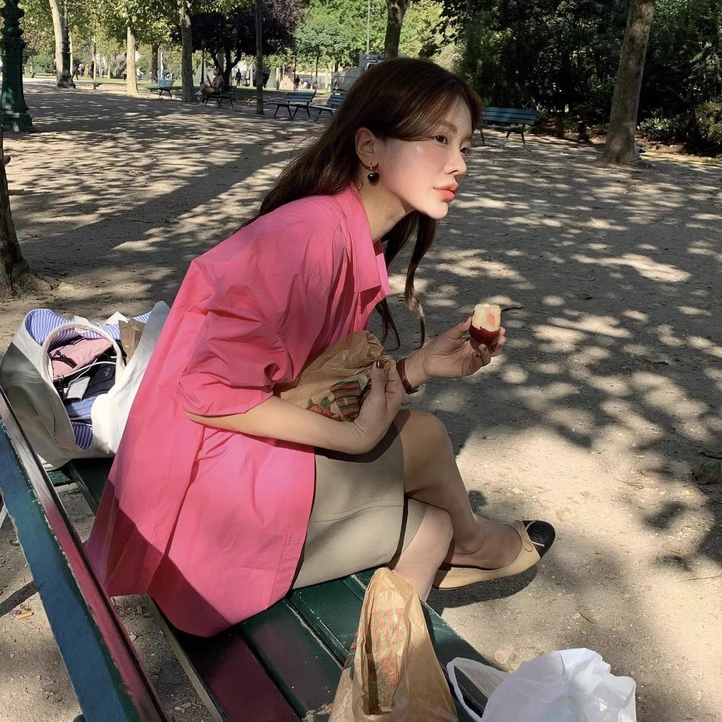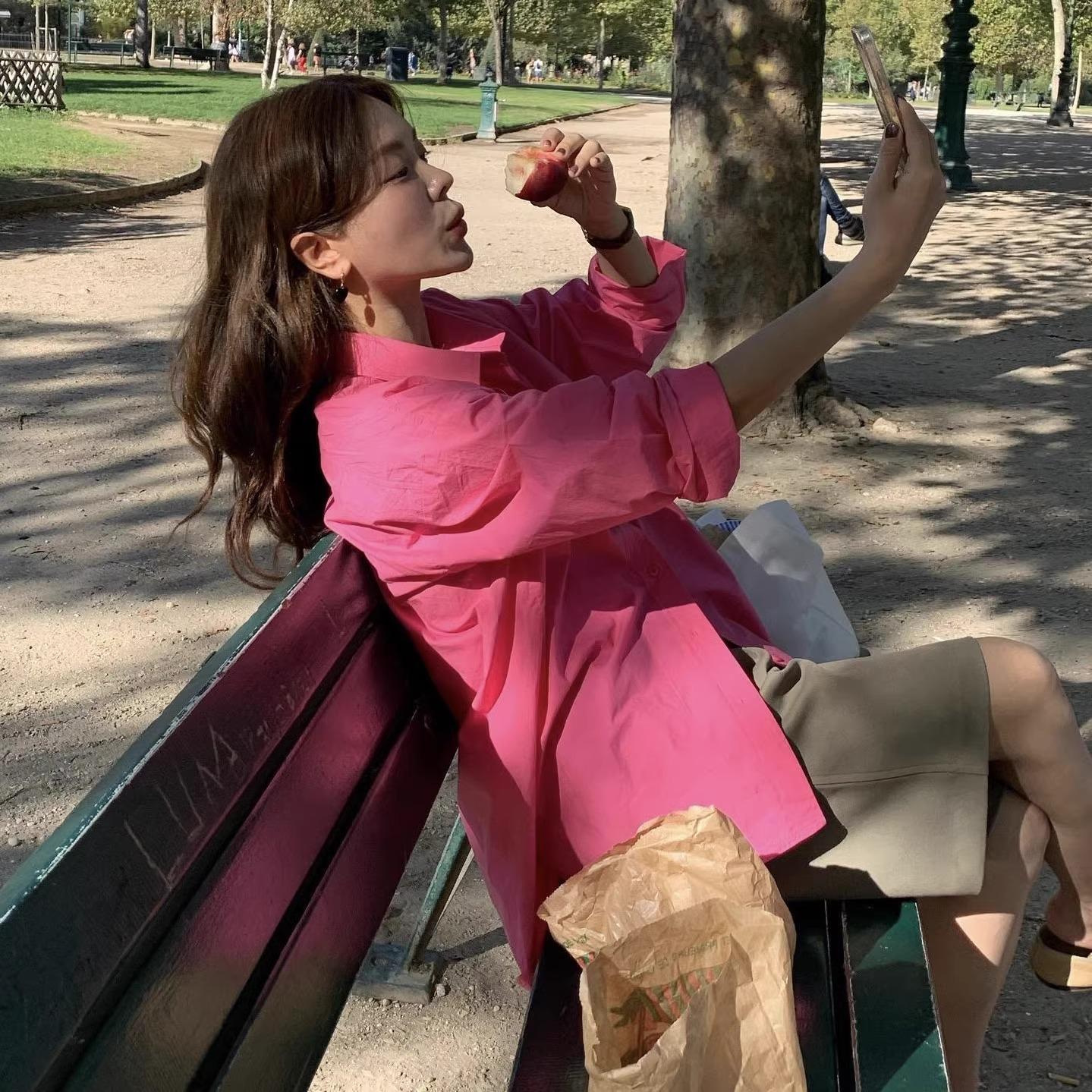 Camisa de Capas Rosa Blanco para Mujer 1688 Otoño Nuevo Estilo Nicho Francés Camisa de Manga Larga Top