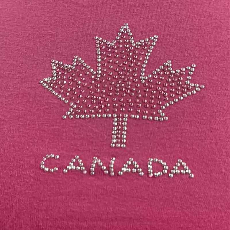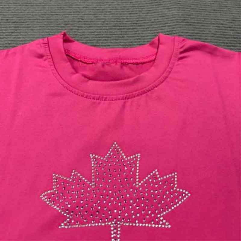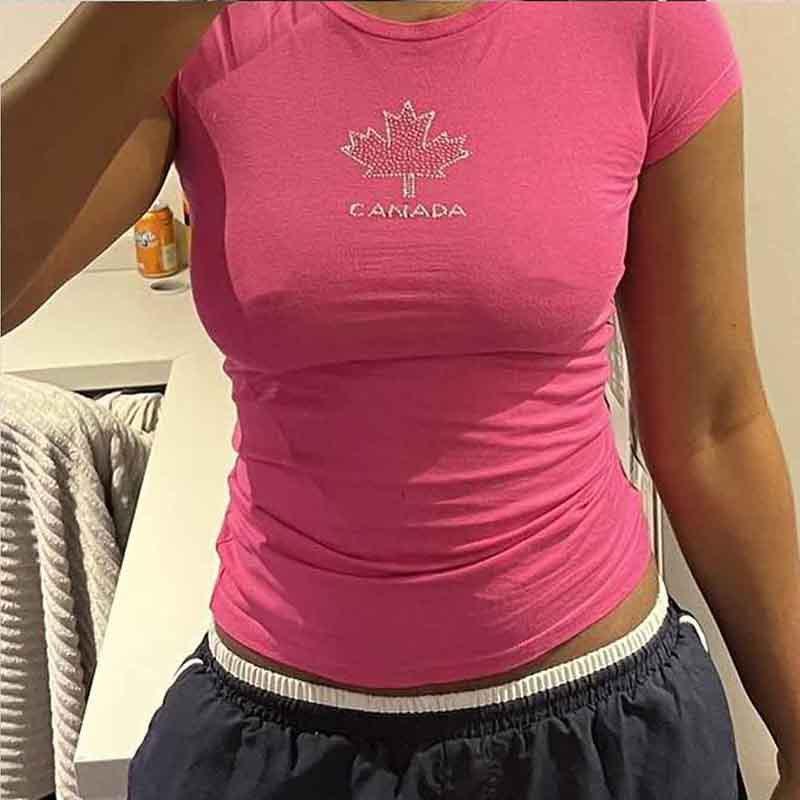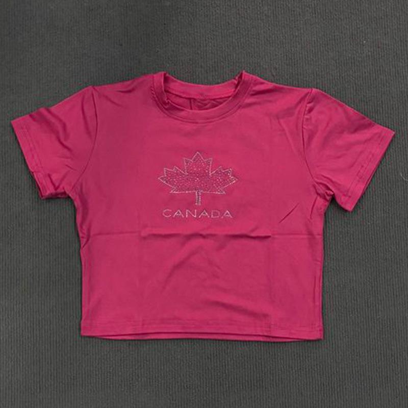 Camiseta de manga corta ajustada con letras de hoja de arce y diamantes de imitación, estilo BM, estilo chica atractiva americana de comercio exterior de AliExpress