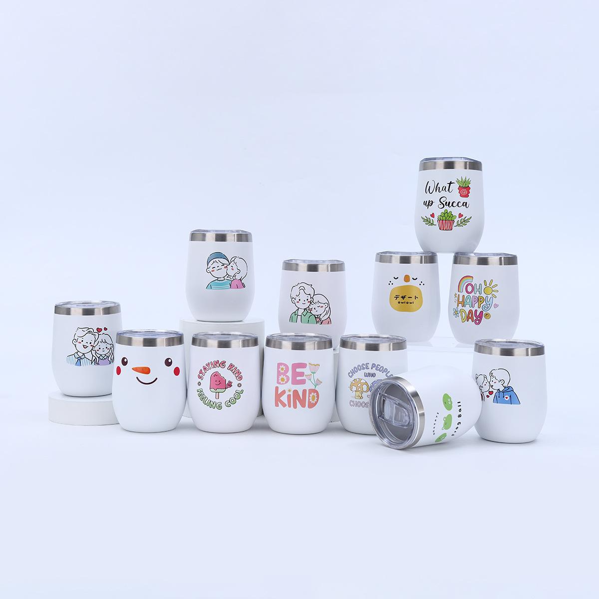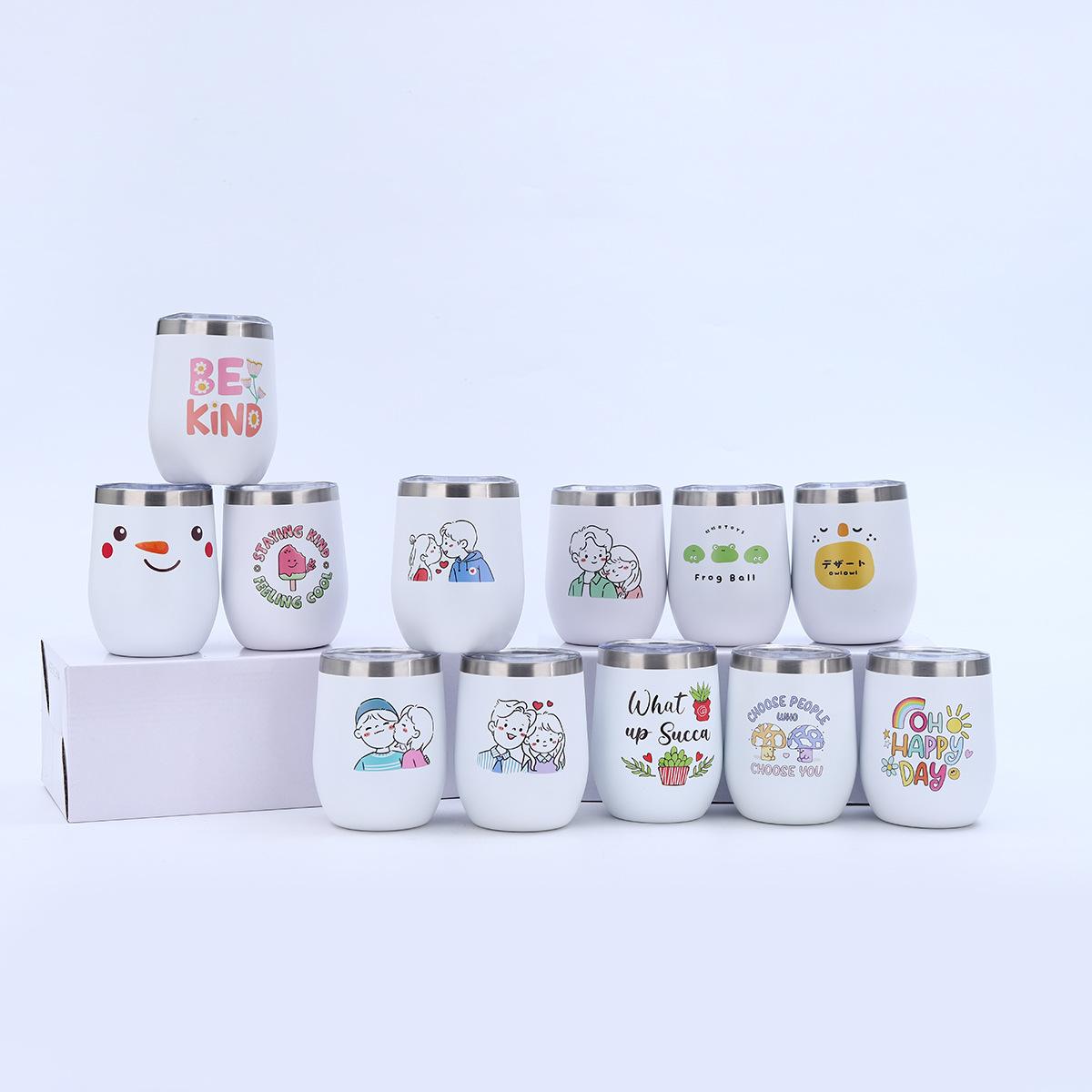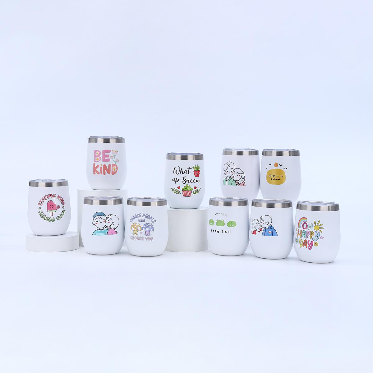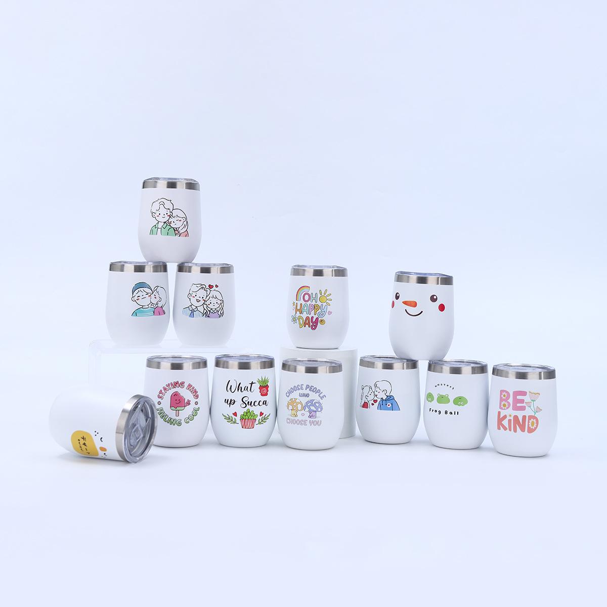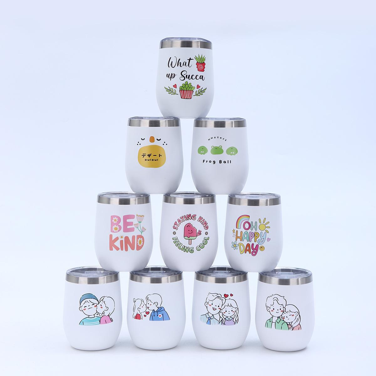 Taza de cáscara de huevo impresa con explosiones transfronterizas, taza de vino tinto de acero inoxidable 304, taza de huevo en forma de U al vacío de 12 oz con tapa, al por mayor