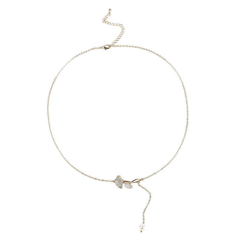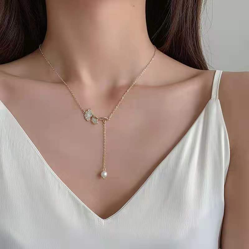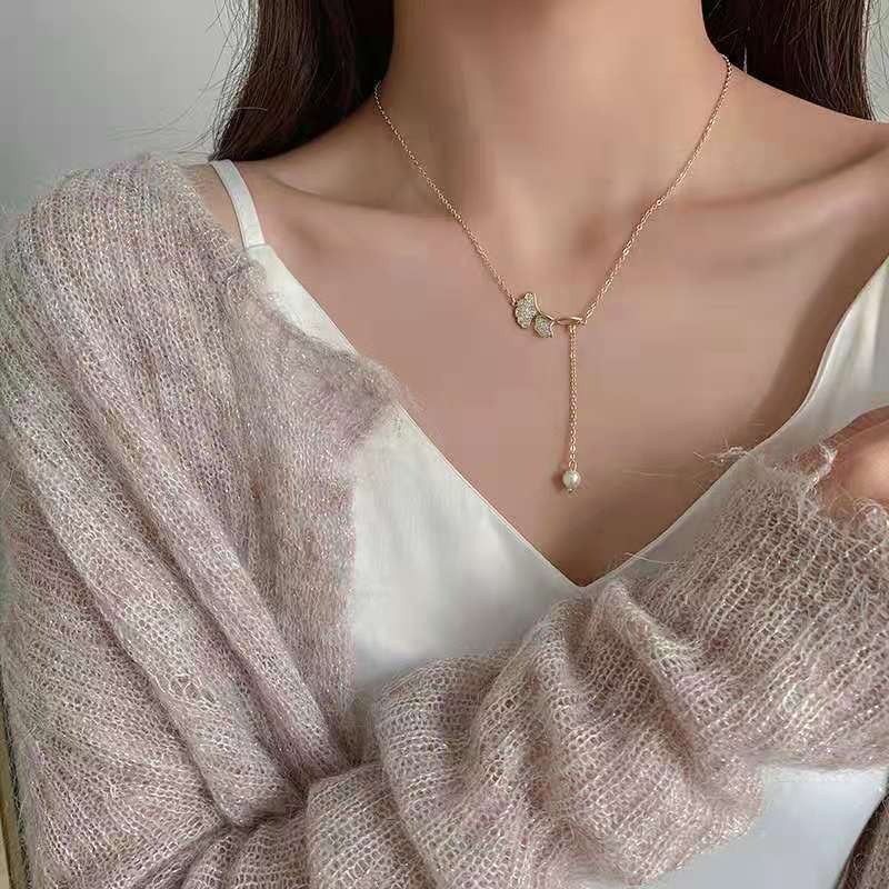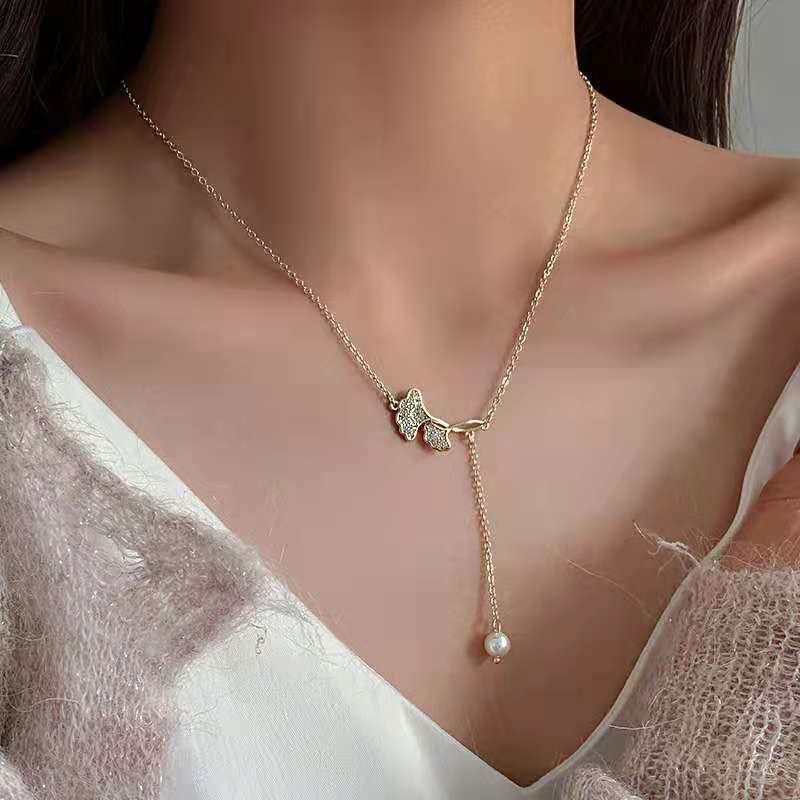 Collar de falda pequeña con hoja de ginkgo, nuevo y moderno colgante de perla elegante y ligero para mujer, cadena de clavícula con diseño de nicho.