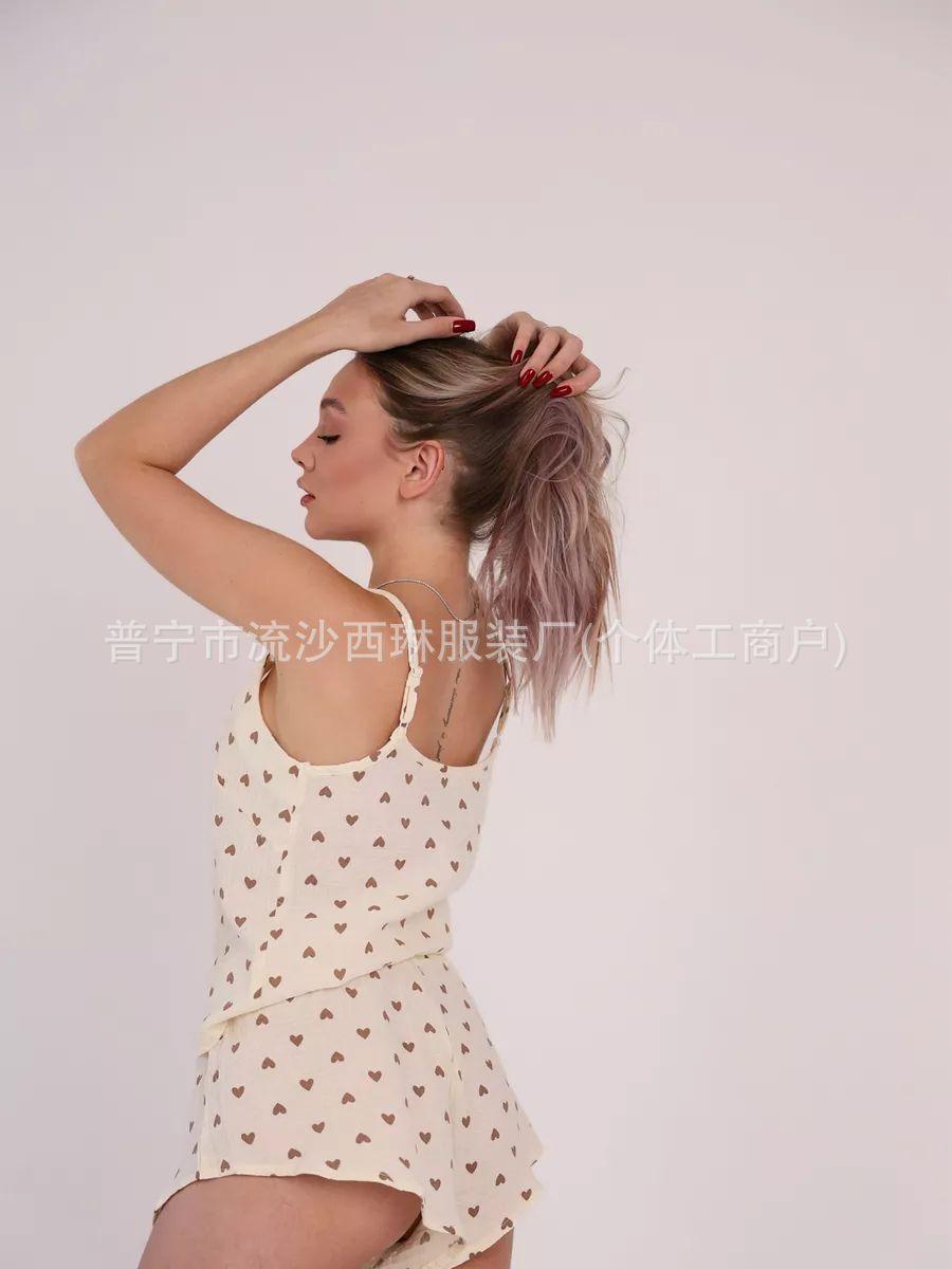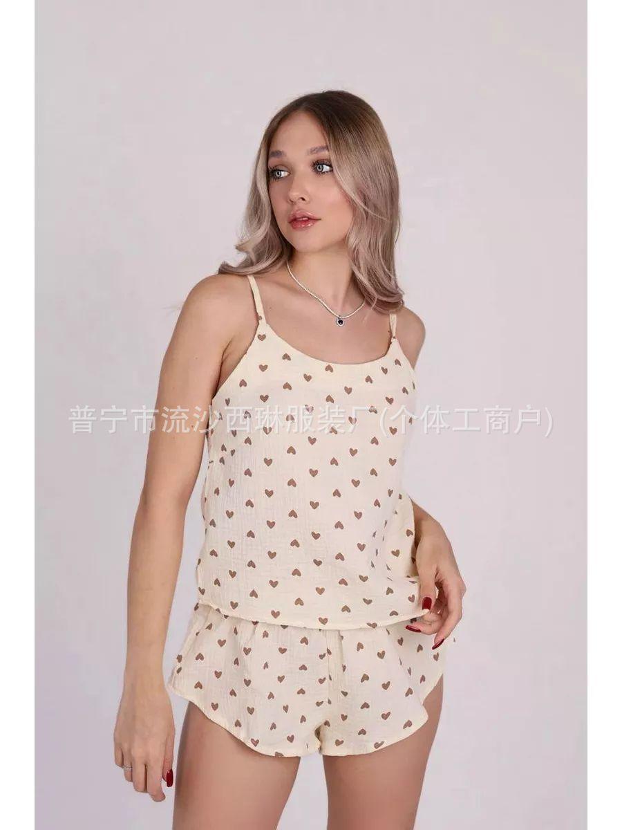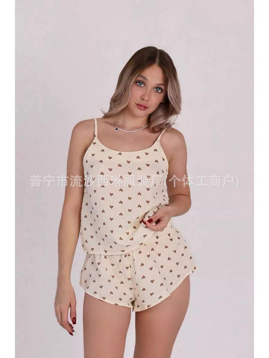 Pijama de algodón camisola transfronterizo europeo y americano con pantalones cortos estampados de amor, traje de dos piezas, ropa de hogar para mujer para comercio exterior