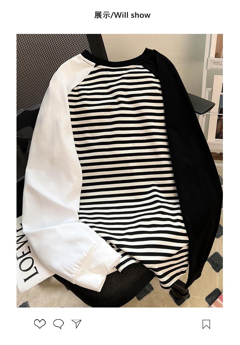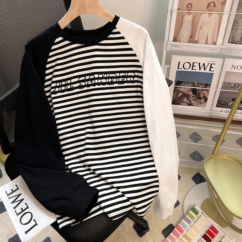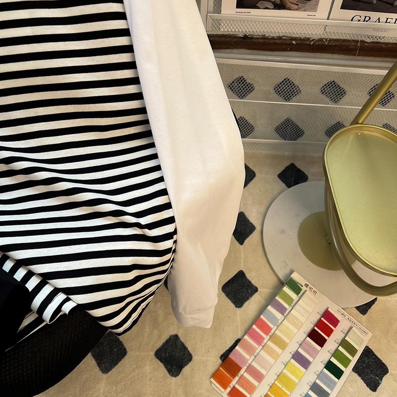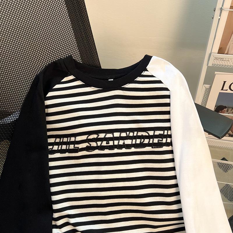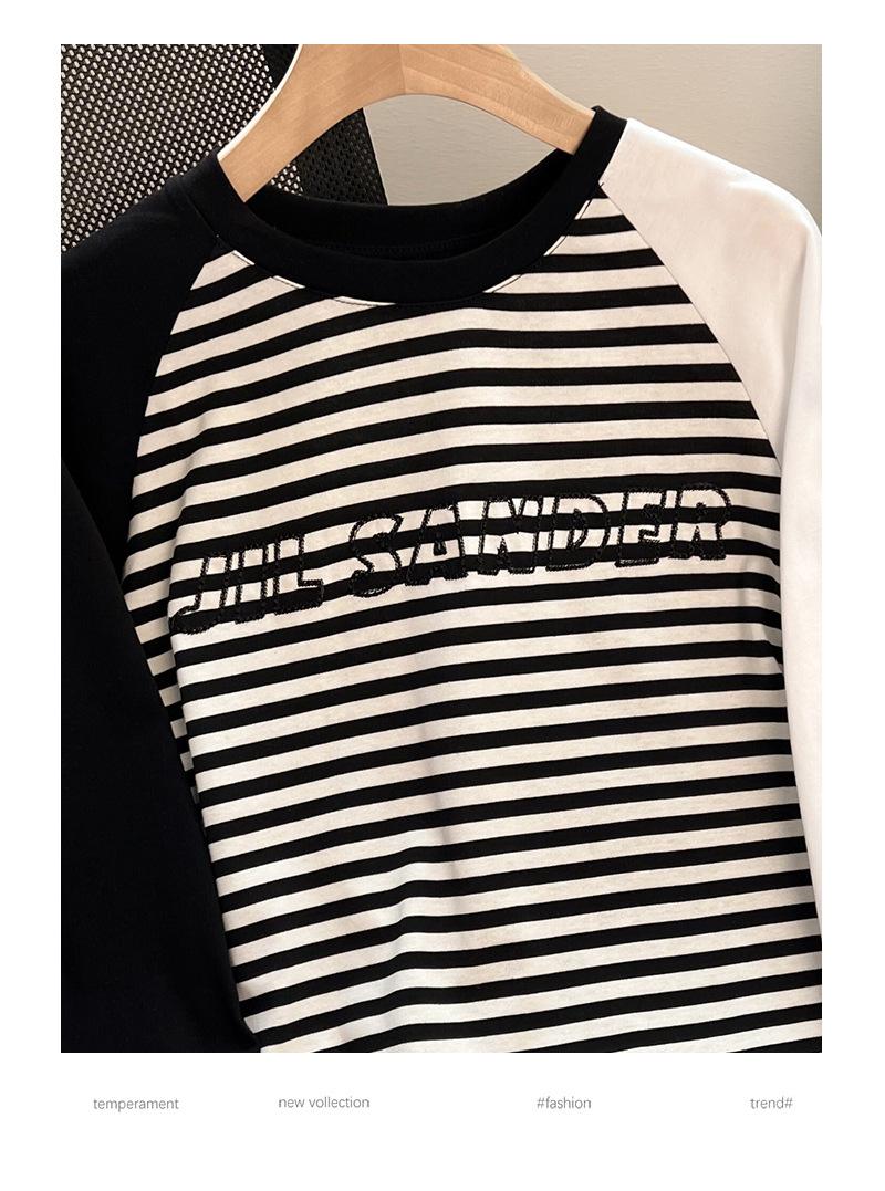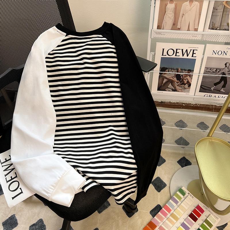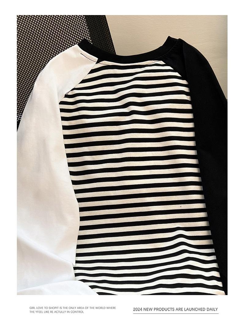 Camisa básica de rayas de algodón puro para mujer, primavera y otoño 2024, fina, ajustada, con mangas raglán, cuello redondo, manga larga, top de color en contraste, ropa para mujer