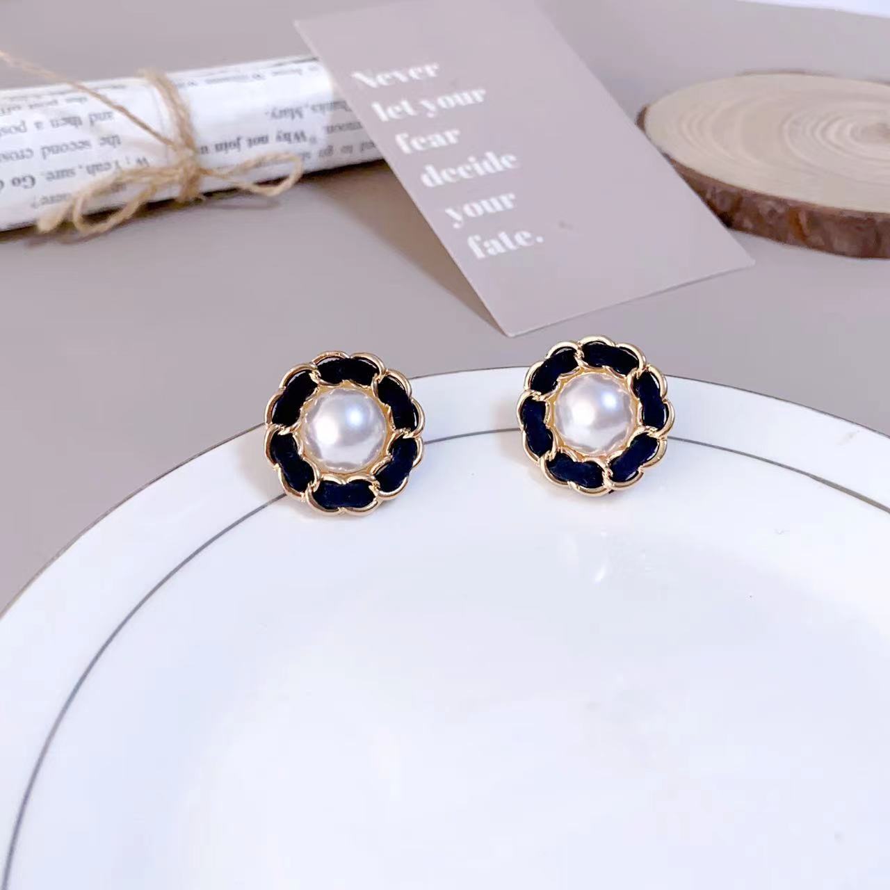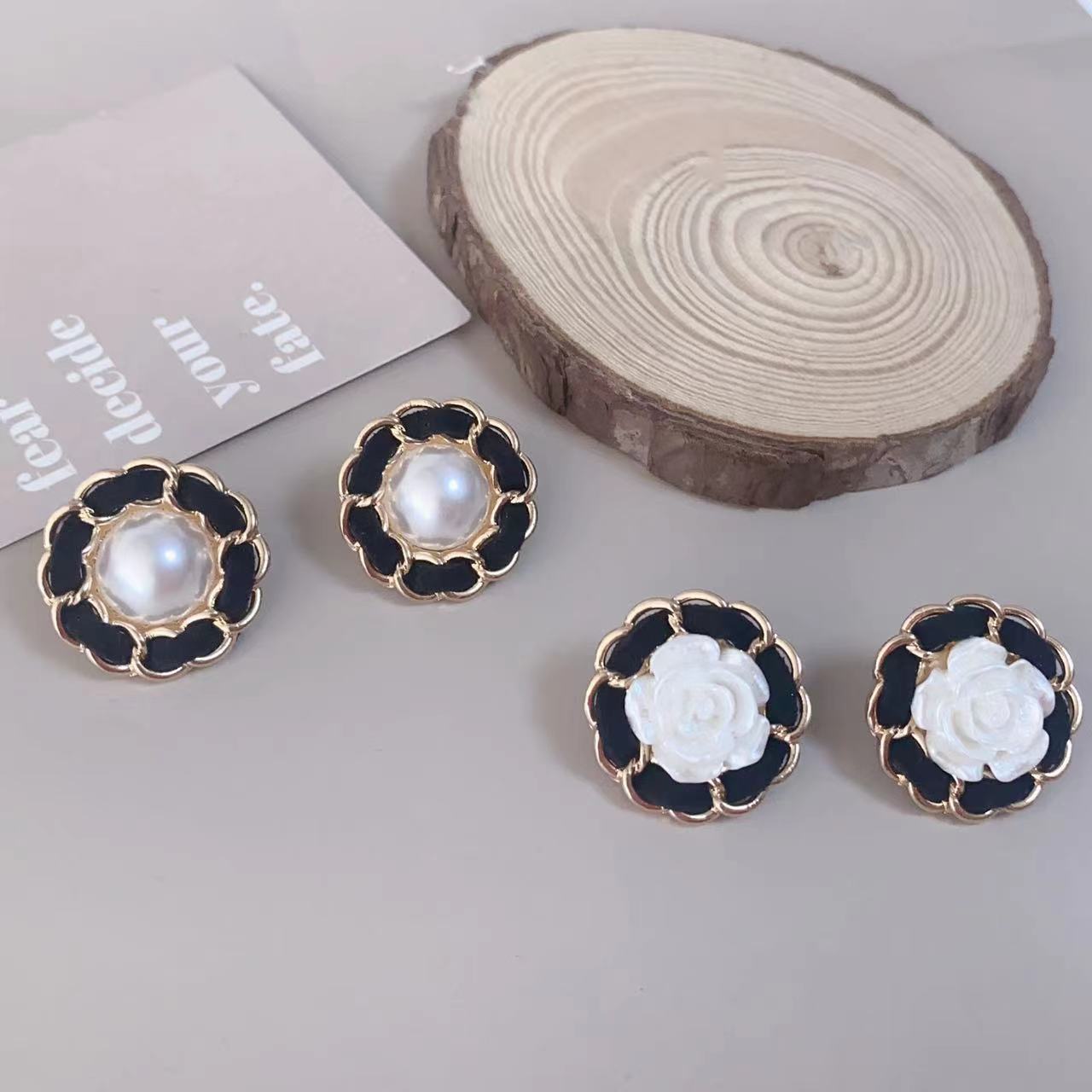 Pendientes de botón con flor de perla estilo Hepburn retro francés con aguja de plata S925, pendientes tejidos de cadena de alta calidad, pendientes de otoño e invierno