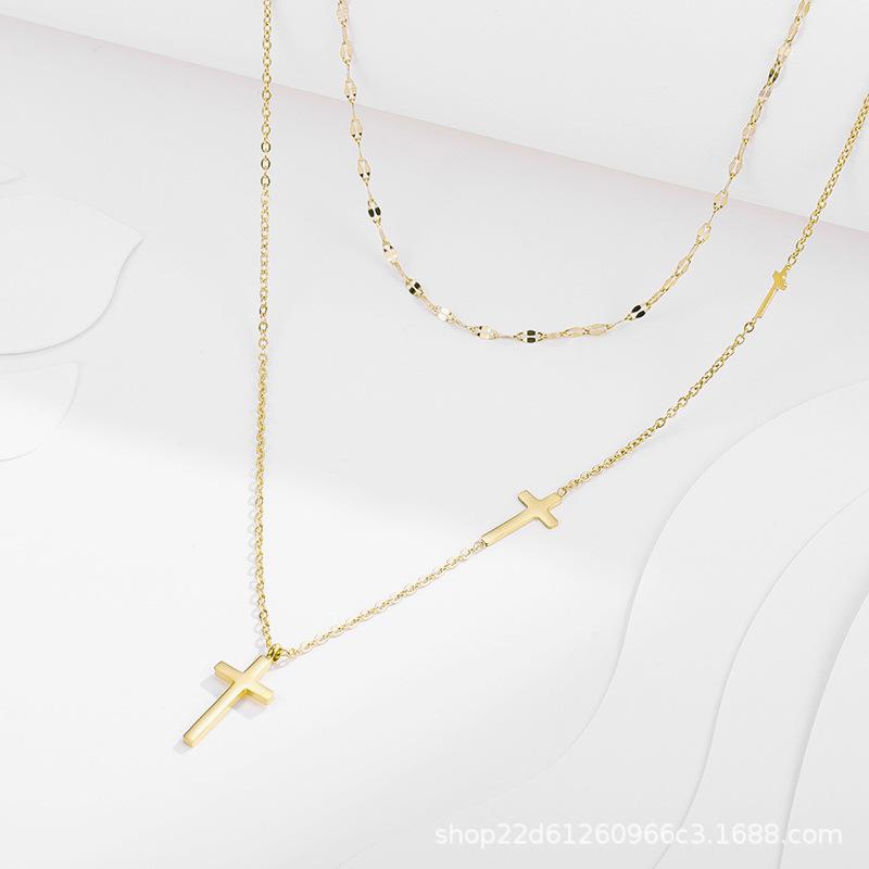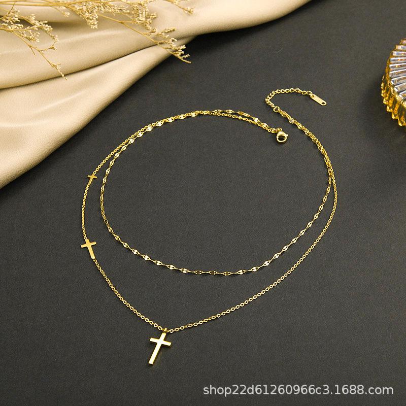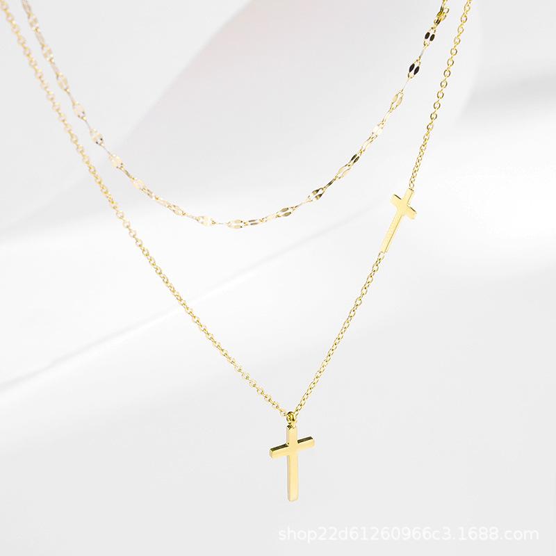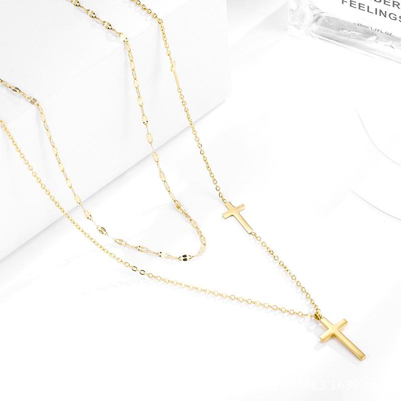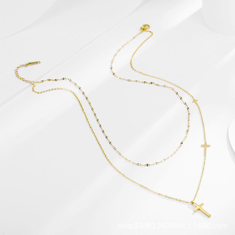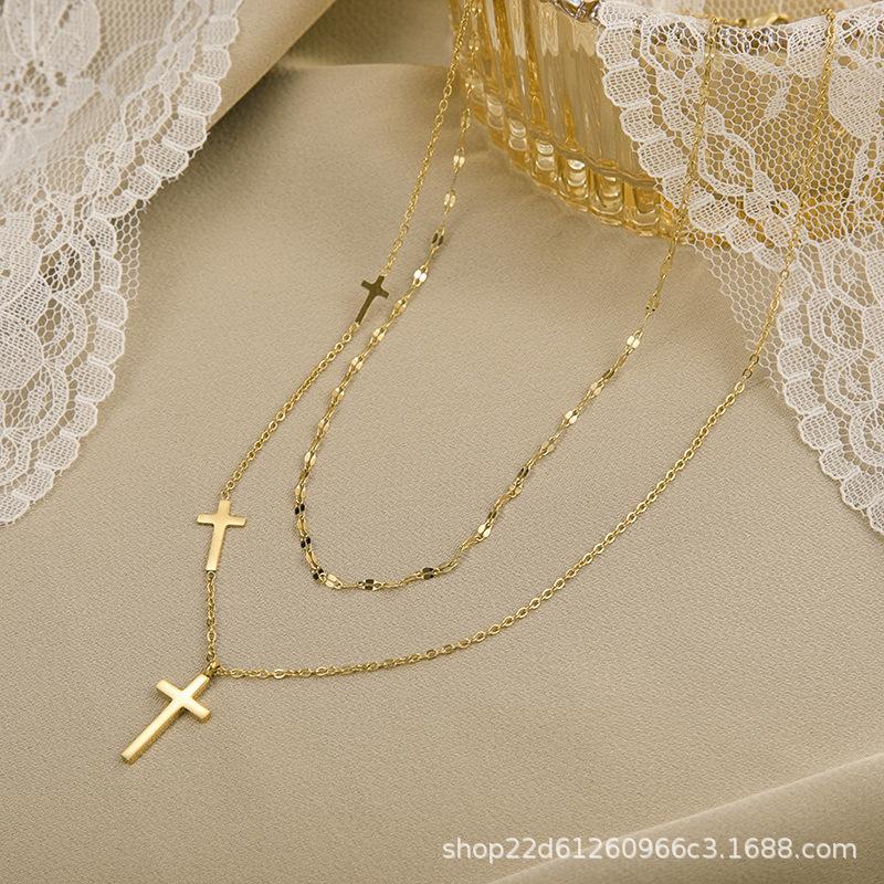 Collar de acero de titanio con cruz de doble capa de 18 quilates, nuevo y lujoso, de estilo transfronterizo, cadena de suéter de moda para mujer, joyería de acero inoxidable que combina con todo.