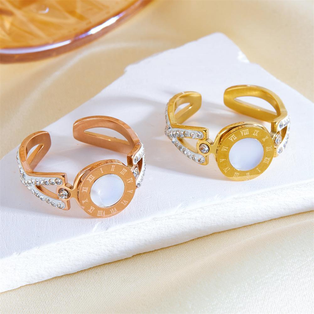 Moda Transfronteriza Simple Europea y Americana Lujo Ligero Elegante Anillo de Nácar con Diamantes Números Romanos Anillo de Acero de Titanio para Mujer Color Inalterable