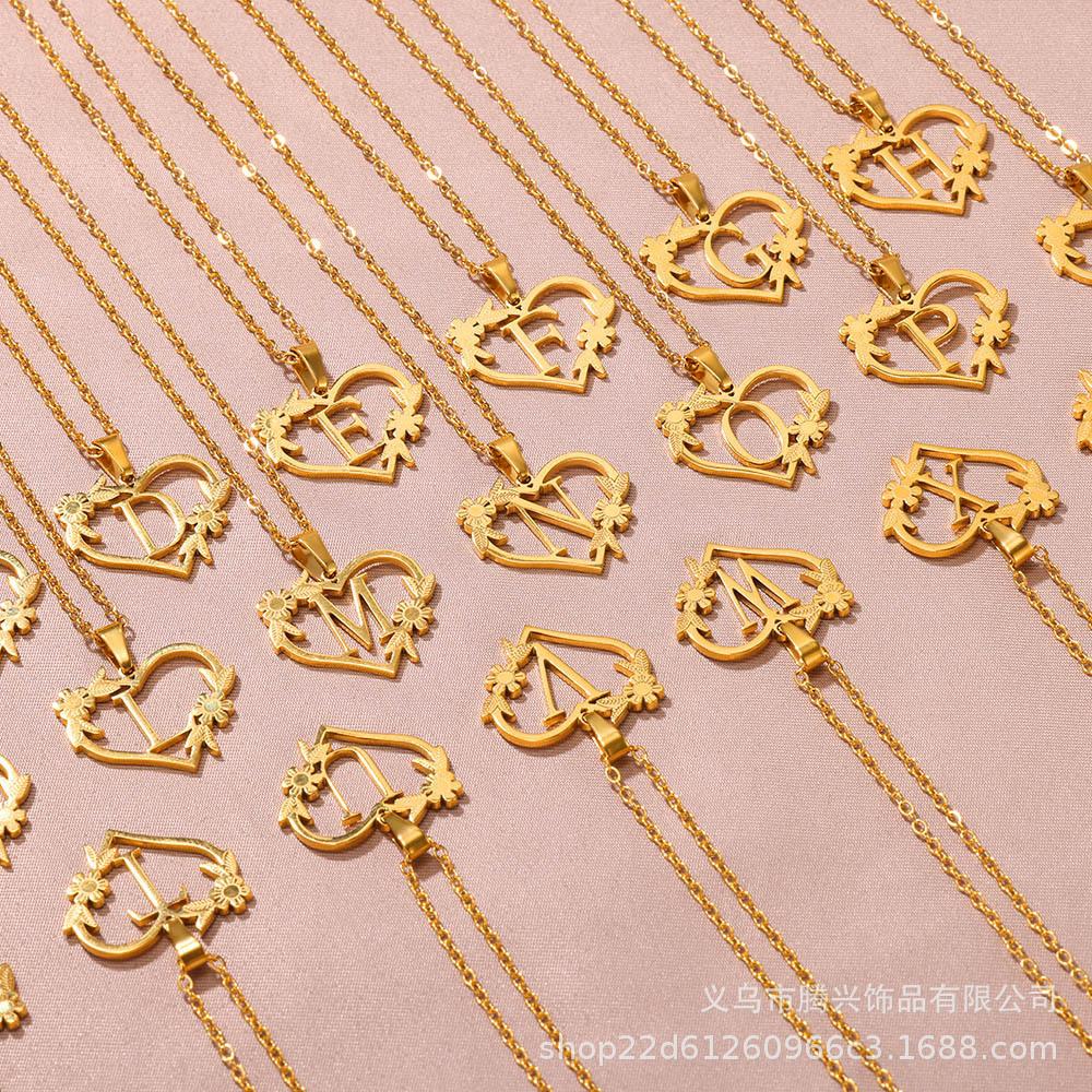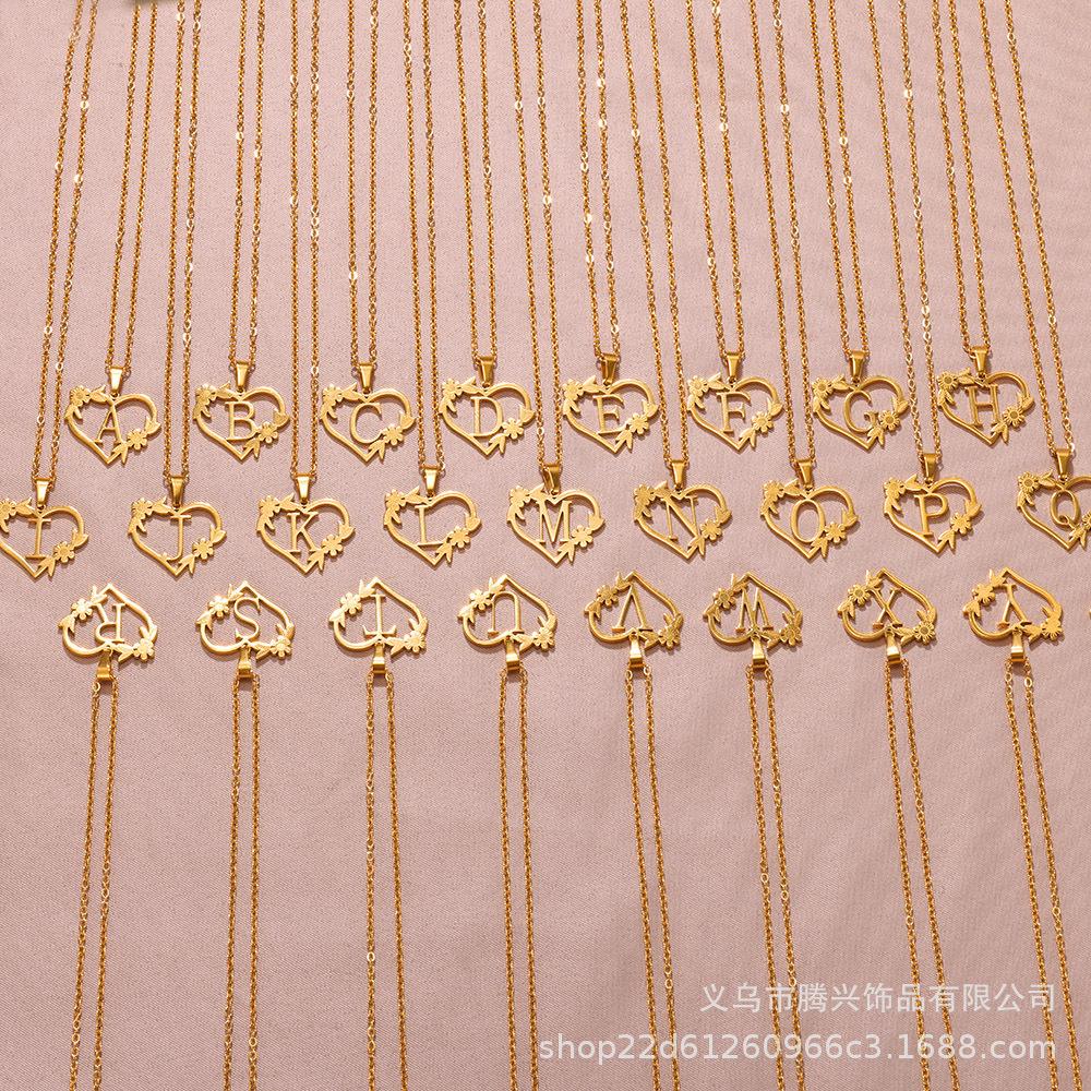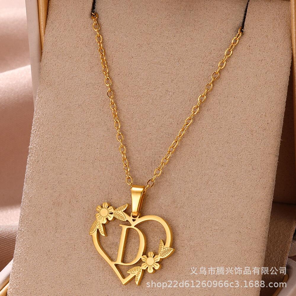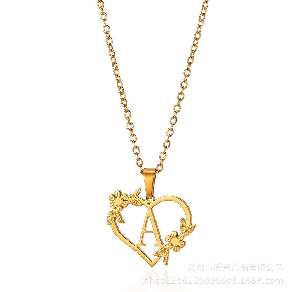 Collar de acero inoxidable con forma de corazón de titanio y 26 letras en inglés, estilo transfronterizo de Amazon, con flores de lujo ligeras y joyería de acero inoxidable para mujer.