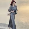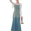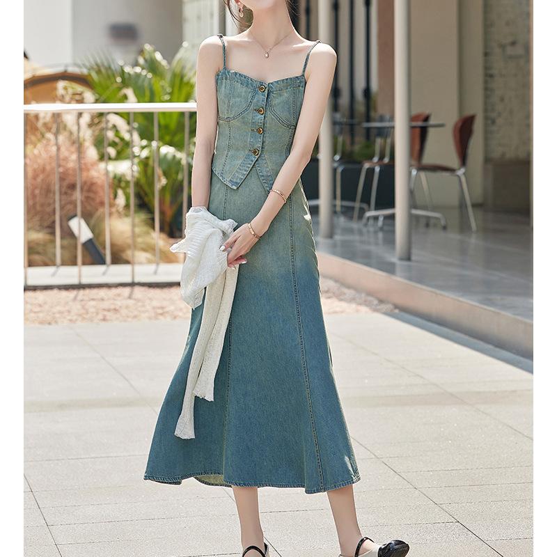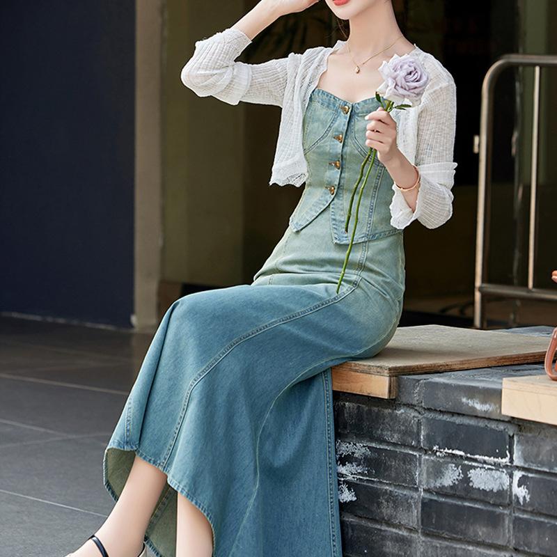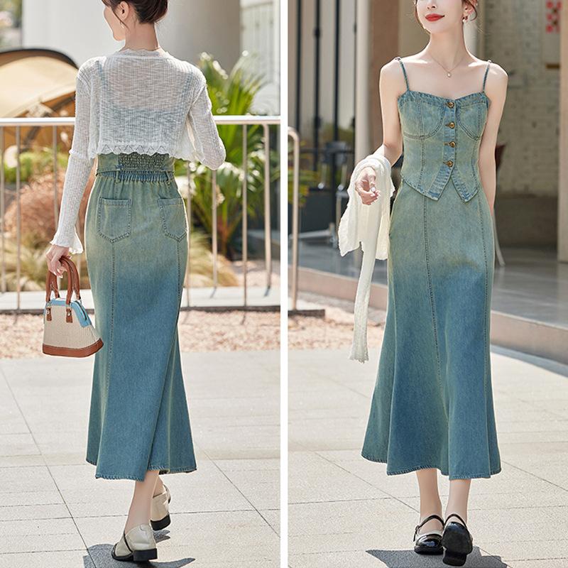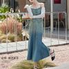 Chal Camisa Pequeña Mezclilla Vestido Sling Traje Mujer Primavera y Verano 2024 Nuevo Falda Cola de Pescado Falda Conjunto de Tres Piezas