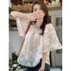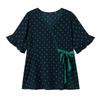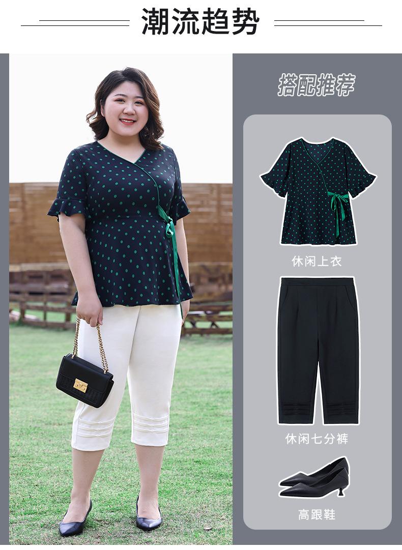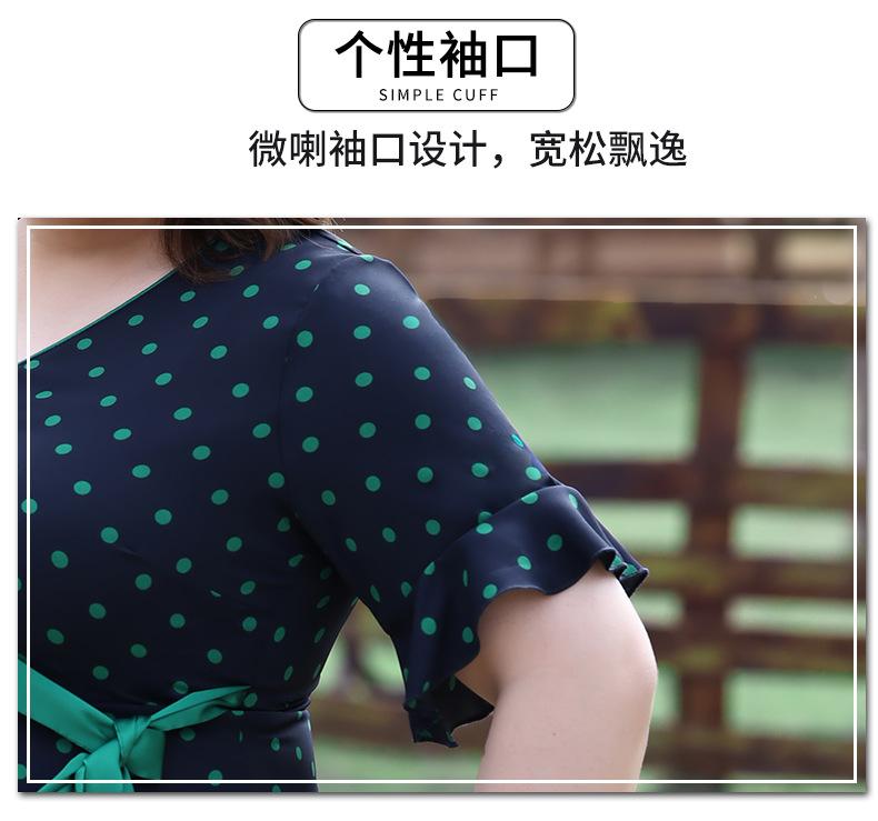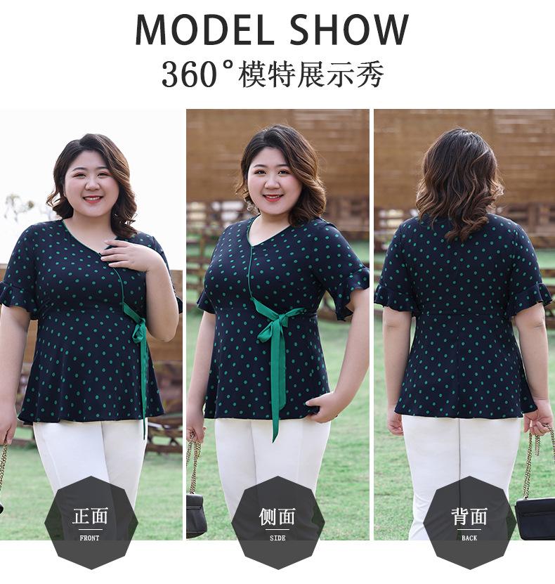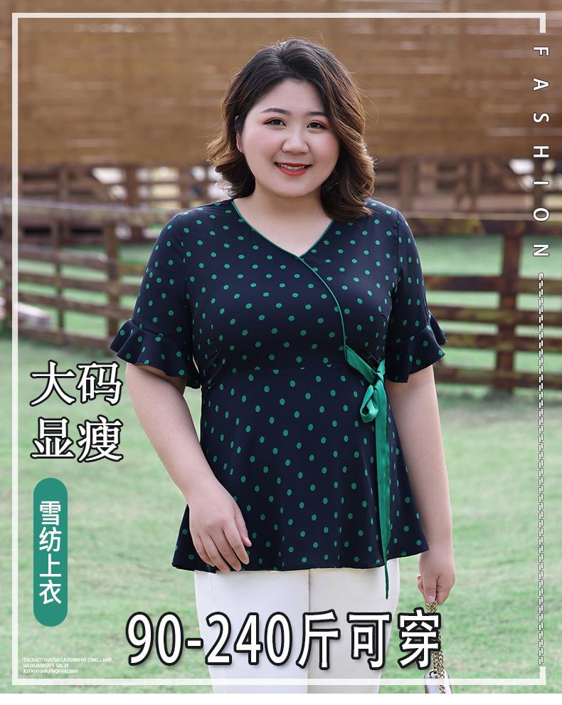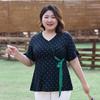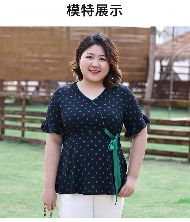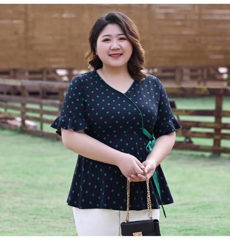 Top de Manga Corta con Cuello en V y Manga de Hoja de Loto para Mujer de Talla Grande 2025 Verano Nuevo Gordo mm Cubre Vientre con Cordones Camisa de Chifón de Lunares