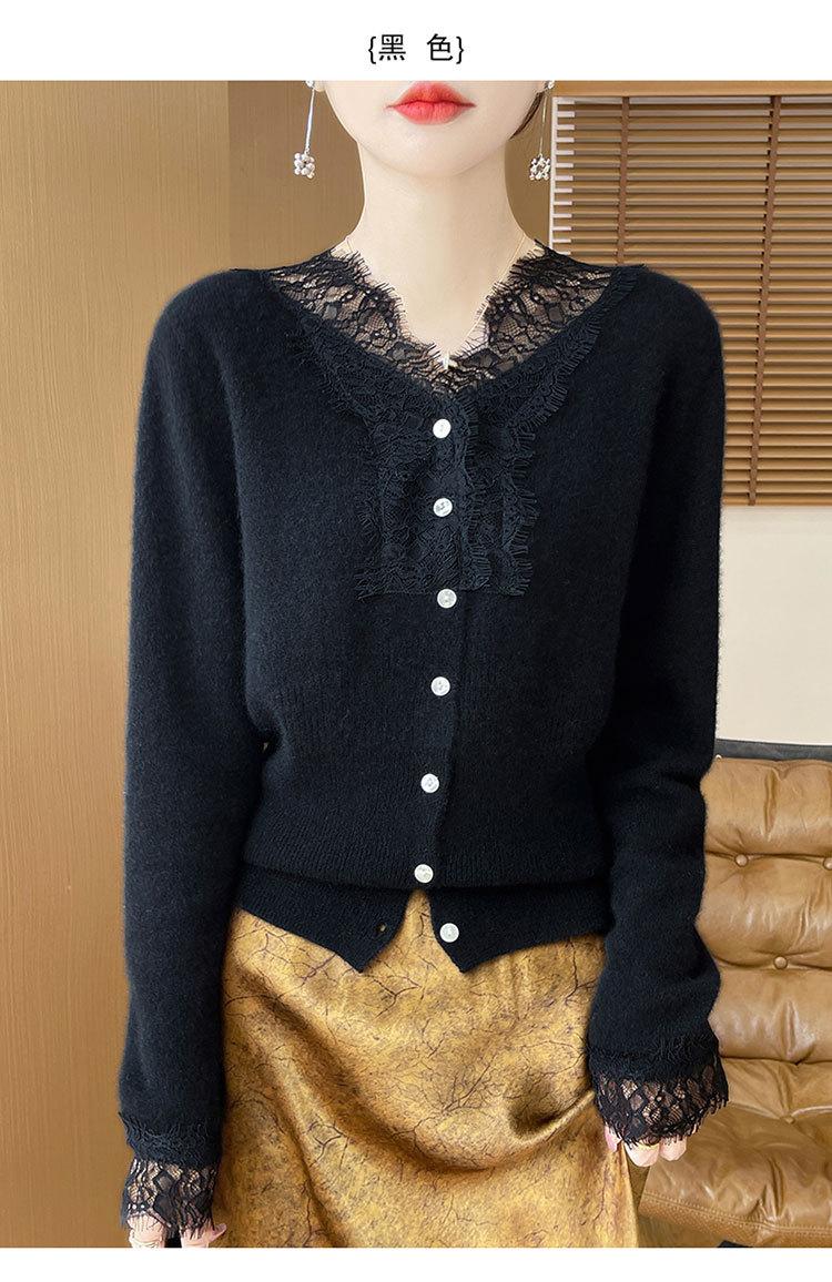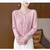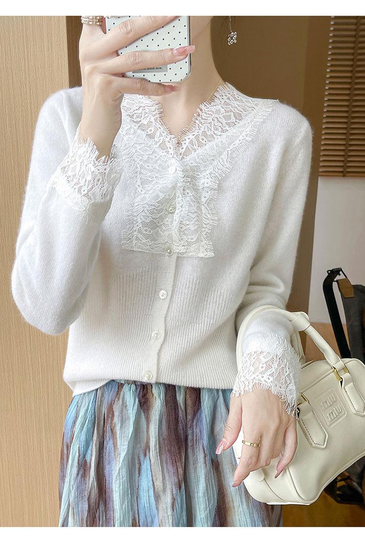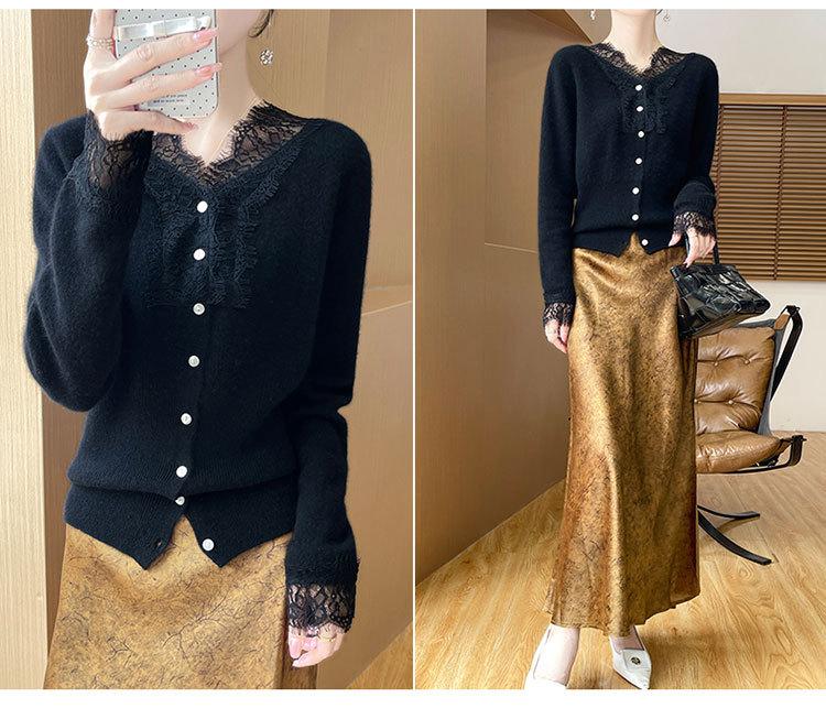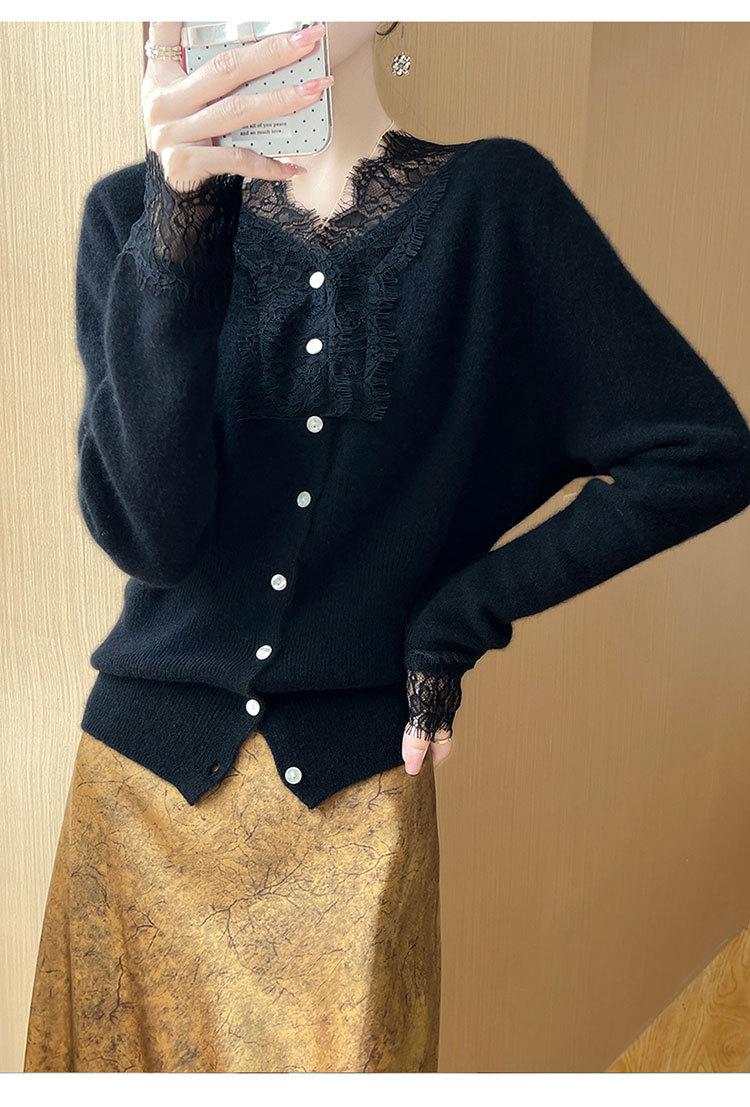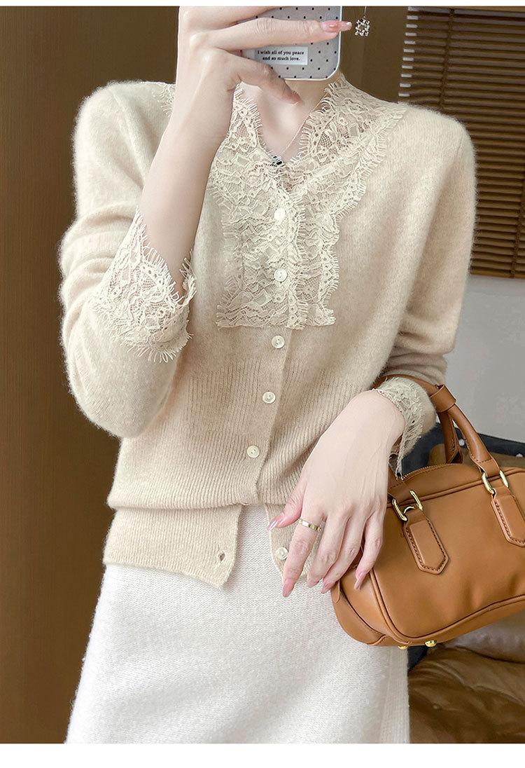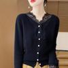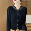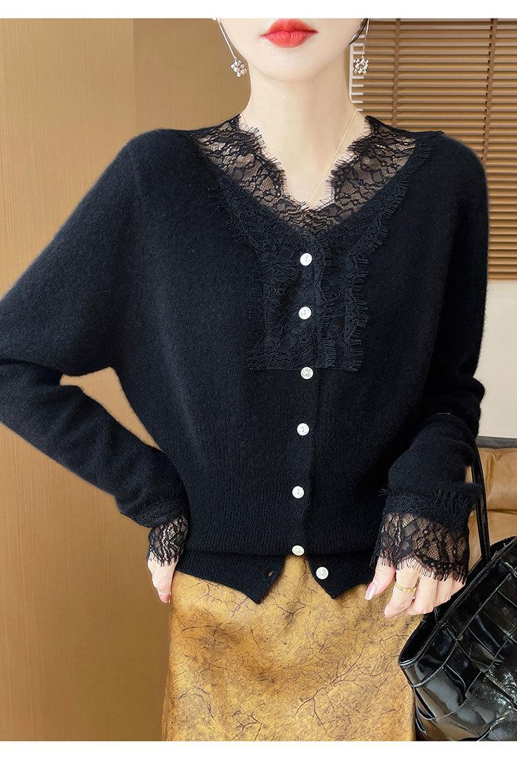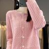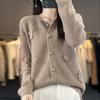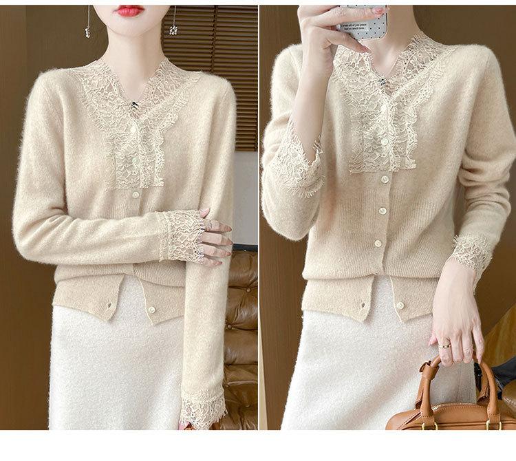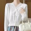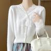 Cárdigan de Cachemira Pura 100 con Encaje de Cuello en V Calado Otoño e Invierno Suéter de Manga Larga Suelto Suéter de Lana Chaqueta Tejida Trendy